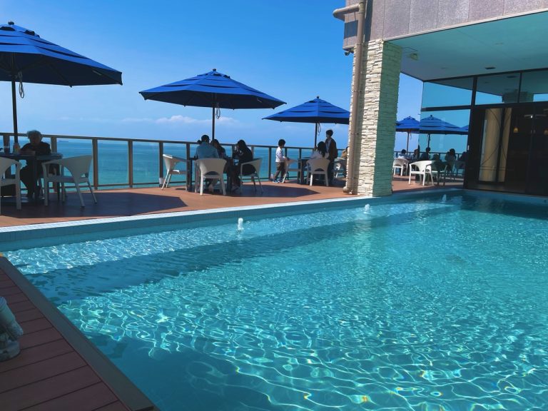 せっかくなので海側が良かったけど、お客さんで埋まっていたのでプール横のパラソルの下でご飯🍚