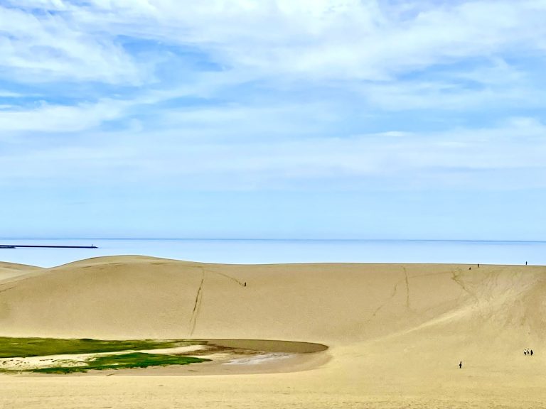 こんな感じで砂丘の後ろ側には広大(?)な日本海が見えます!先ほど上った階段からこの丘?(馬の背とよばれるそうです)までは直線距離で400mほどらしく、最初は緩やかな下り坂、そして急な上り坂を経て日本海を堪能できる丘の頂上に到着します😄