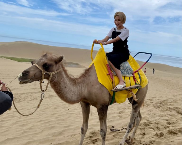 鳥取砂丘にいるラクダはフタコブラクダといって寒いところに生息するラクダらしいです。よく見るとラクダの鼻のところに洗濯ばさみみたいなのを付けて誘導されていました。ラクダの表情は全然読み取れないけど、めちゃくちゃ痛そう。。