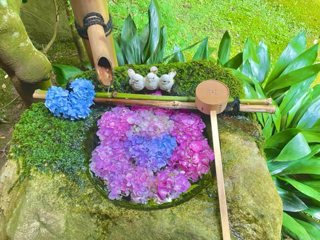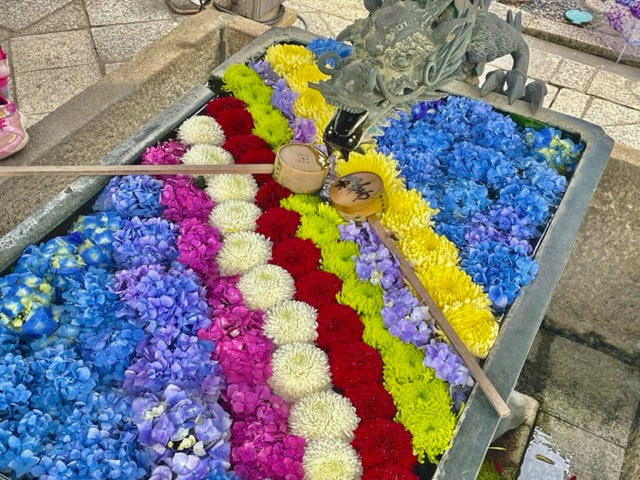 まず、入るとお出迎え(みんなが写真撮るのに群がっているところ)してくれたのは、この豪華な花手水🌸紫陽花だけでなく、菊?みたいなのとかカラフルなお花で飾られて、龍🐉が良い味を出しています✨