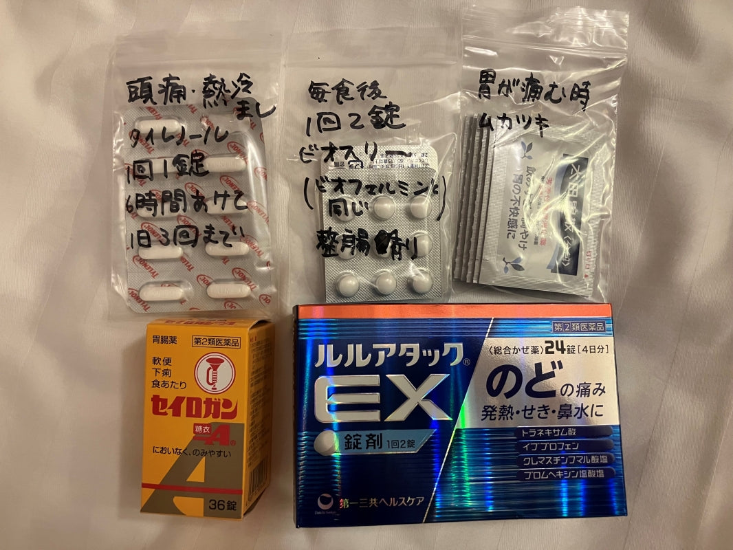 整腸剤に胃腸薬、頭痛対策に解熱剤、市販ではルルアタックEXに、困った時の正露丸です。