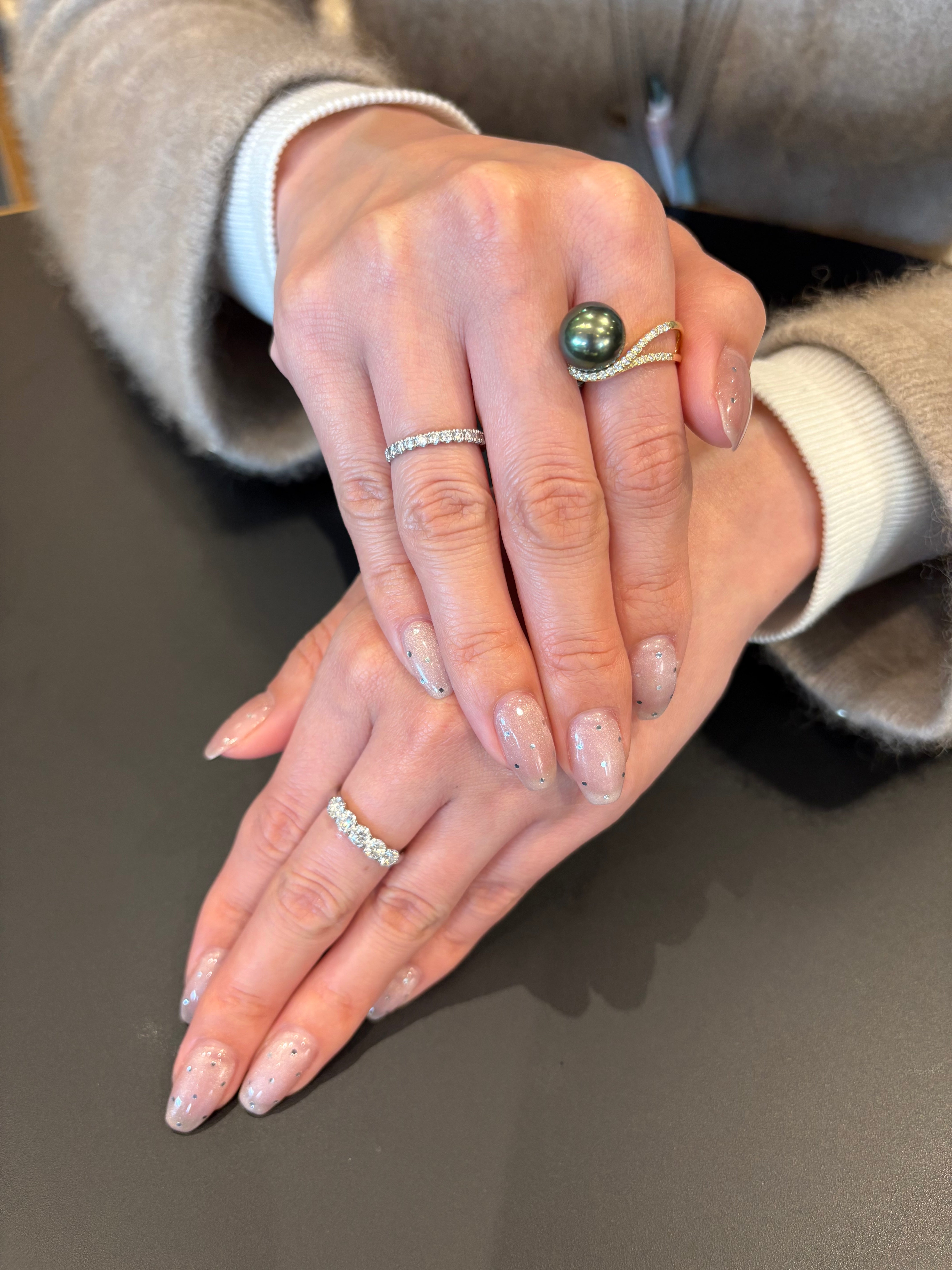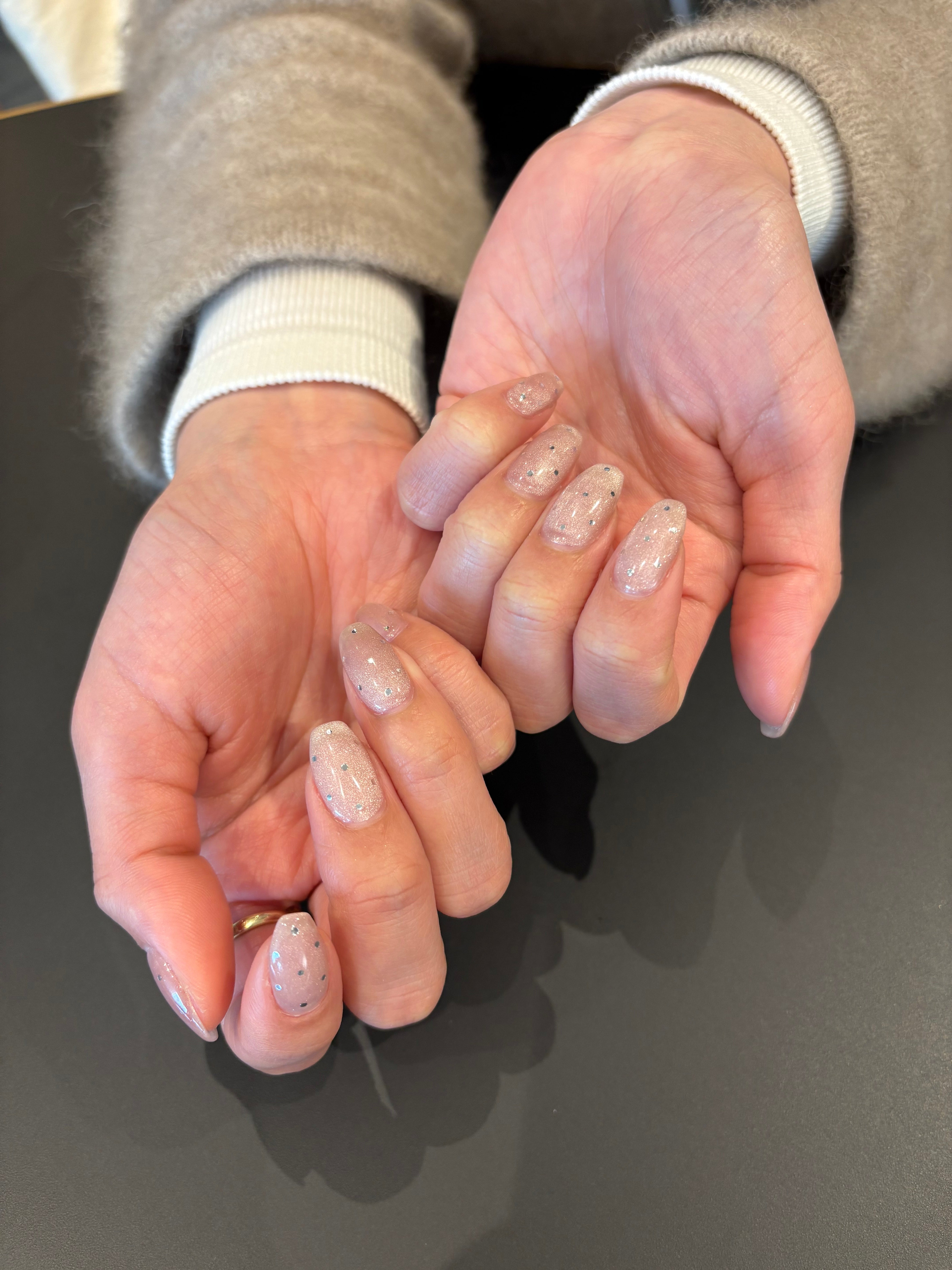 その上からシルバーのホログラムの丸いパーツを格子状に並べてもらいました☺