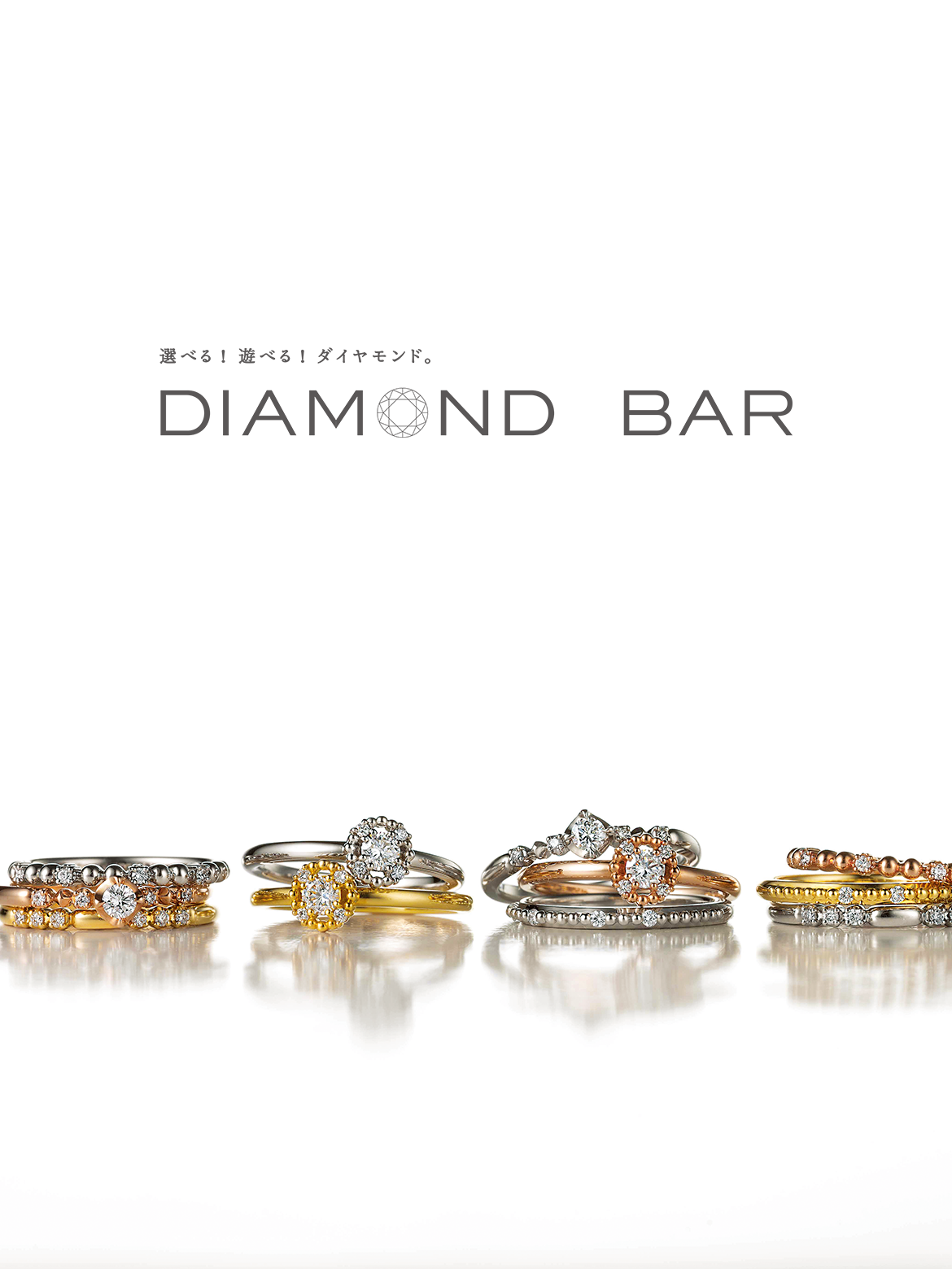 選べる!遊べる!ダイヤモンド。「自分好みに組み合わせて愉しめる」遊び心あふれるDIAMONDO BAR(ダイヤモンドバー)。モチーフやシンプルな一文字、地金など個性豊かなバリエーションから、豊富なカラー、フォルムから選べる組み合わせは数えきれないくらい。自由に選んで、重ねづけをしてお楽しみください。