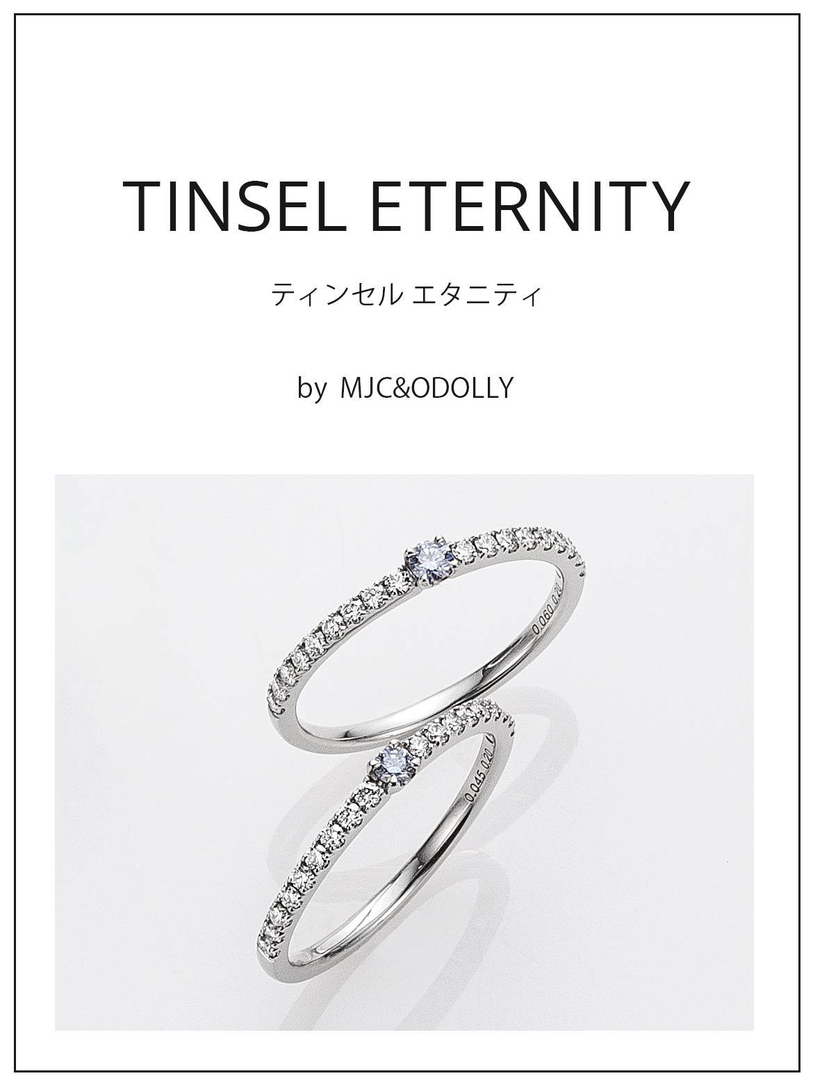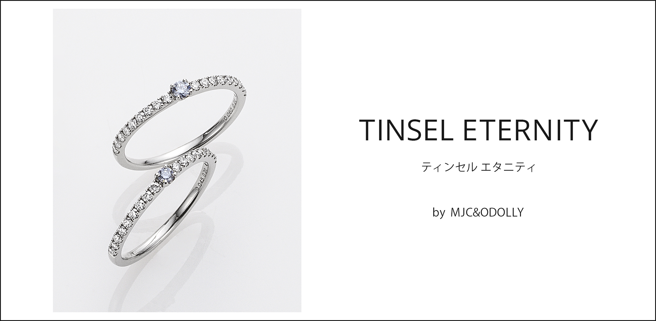 伝統的なエタニティデザインの中から可憐さと上品さを突き詰めたMJC&ODOLLYの新コレクション「TINSEL ETERNITY(ティンセルエタニティ)」。これまでのMJC&ODOLLYにはなかった繊細なリングアームによる着け心地の良さと、ブルー、ピンクといったファンシーカラーダイヤモンドを楽しめる新作ジュエリーです。ひとつずつカラーが違うためそれぞれ限定1点での公開です。
