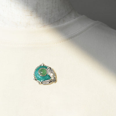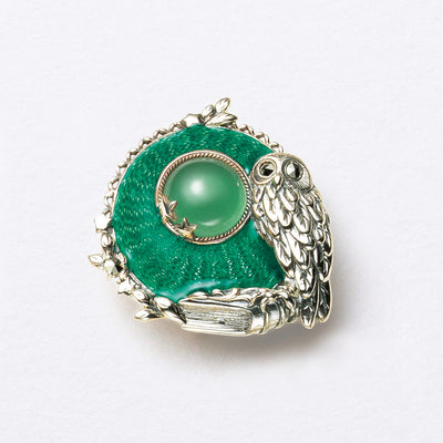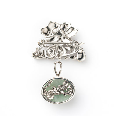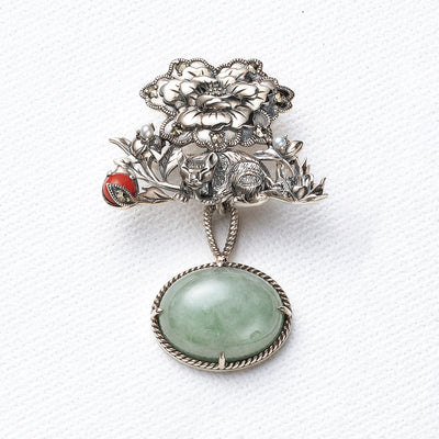 ヒスイ/珊瑚(さんご) シルバーブローチ兼ペンダントトップ(眠り猫モチーフ/5月誕生石)《25T10156》