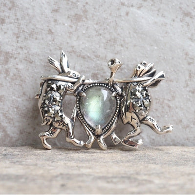 張り合わせ石(フェルスパー/クォーツ) シルバーブローチ兼ペンダントトップ(鳥獣戯画)《M0050004》
