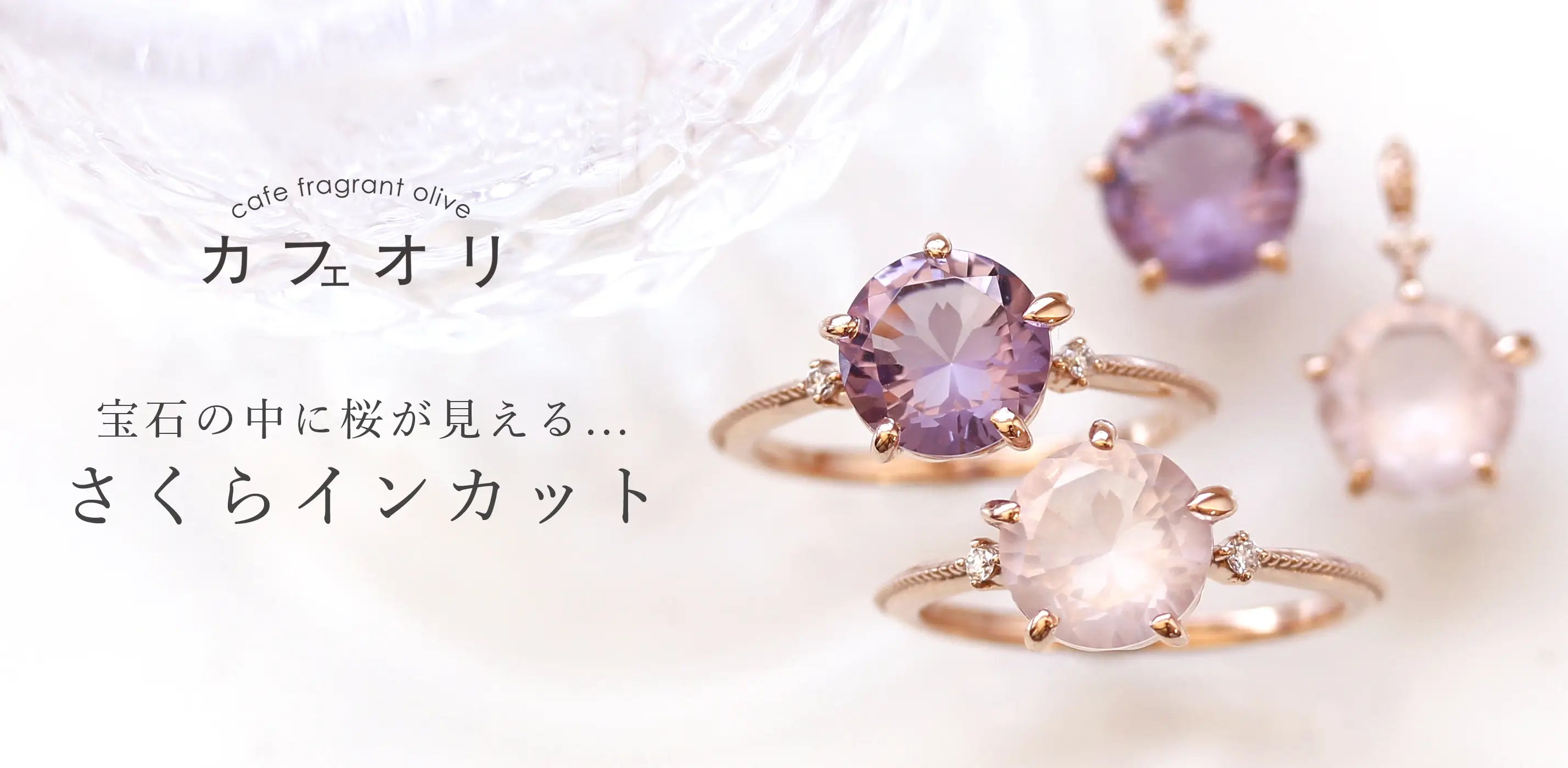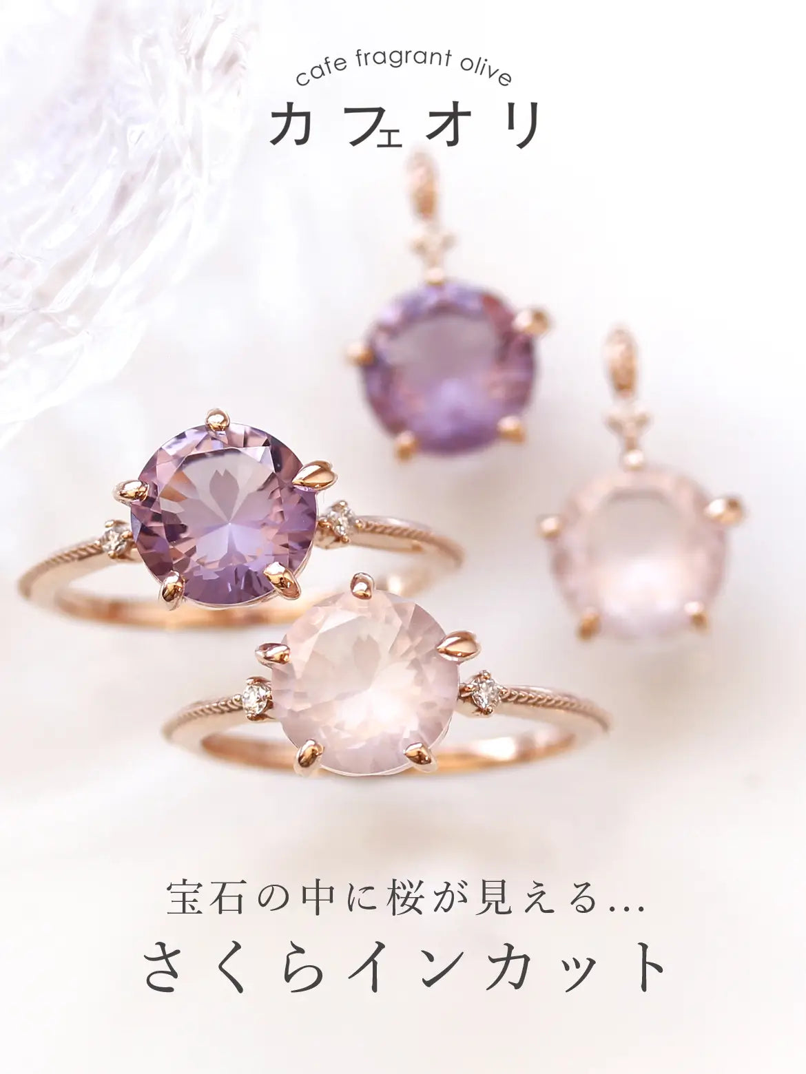 「さくらイン・カット」のローズクォーツ・ローズアメシストをあしらって、とっておきの桜ジュエリーをおつくりしました。
