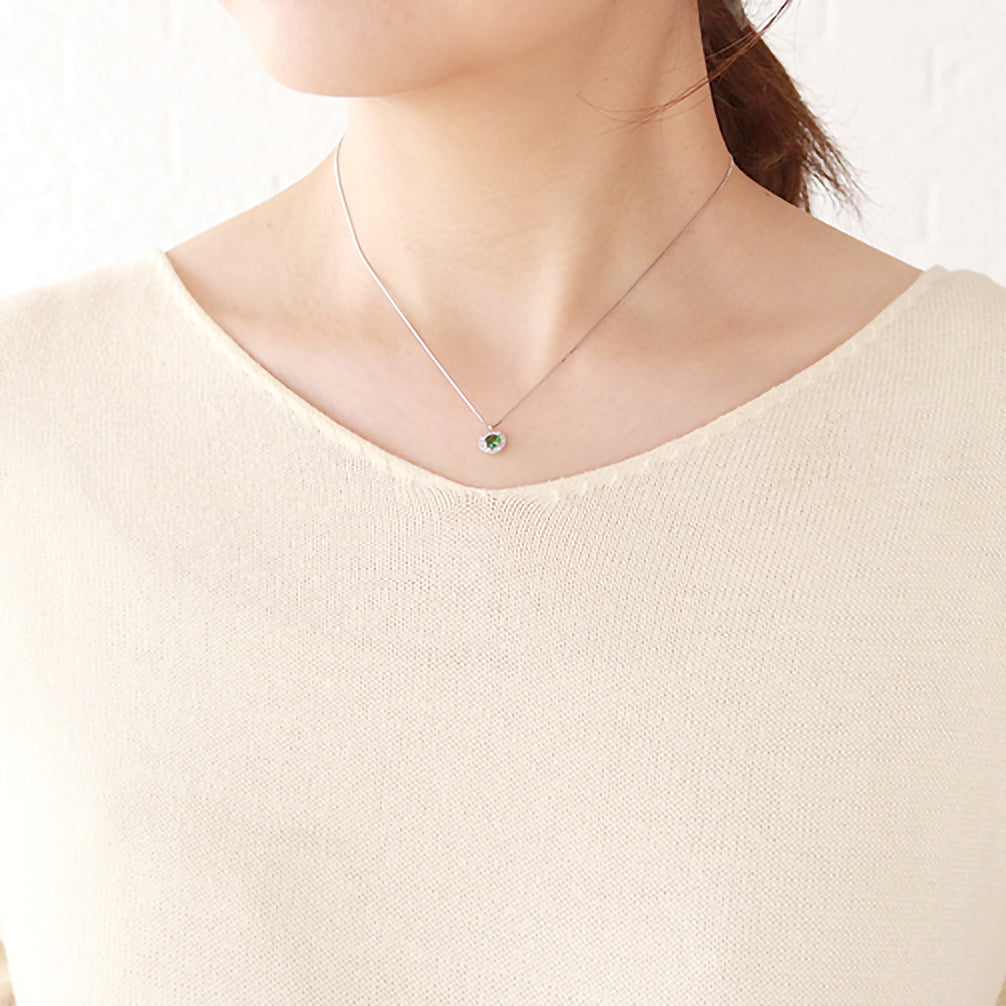 濃く鮮やかな緑色が美しいツァボライトを、輝きの良いメレダイヤでぐるりと一周取り巻きました。 一見するとまるでエメラルドのような鮮やかなグリーンがメレダイヤの輝きによく映えます。