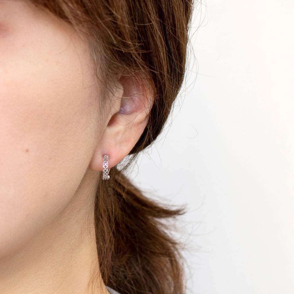 片面はキラリと輝くメレダイヤを留めた緩やかなウェーブデザイン。片面は透かしでデザインされたチェック模様になっています。