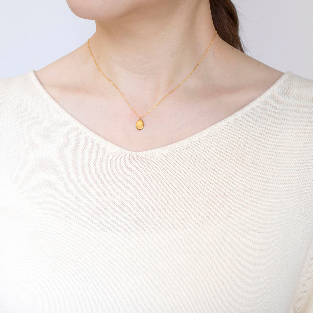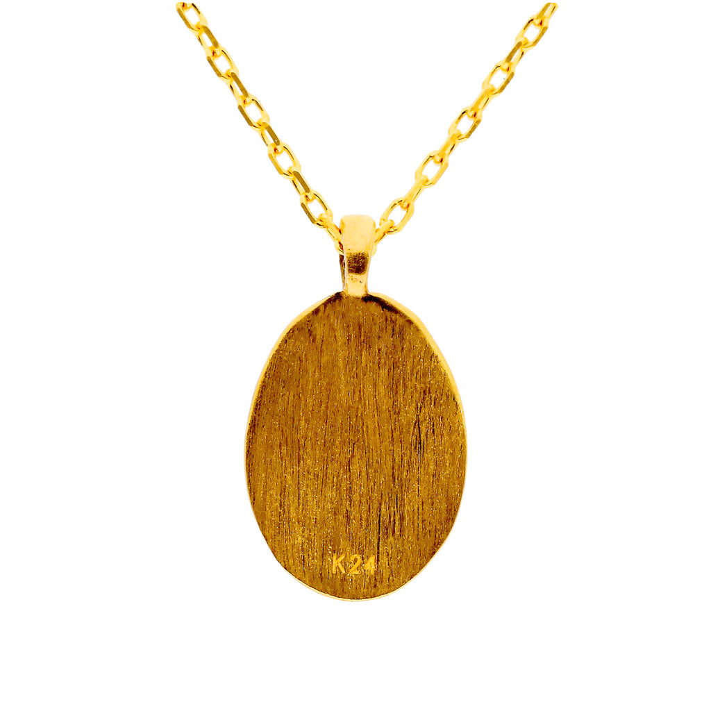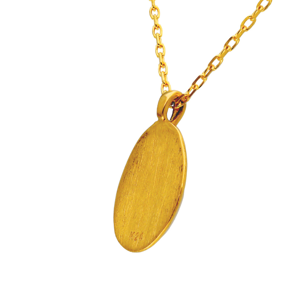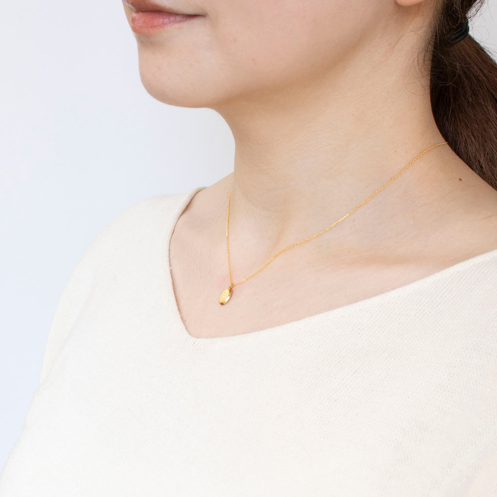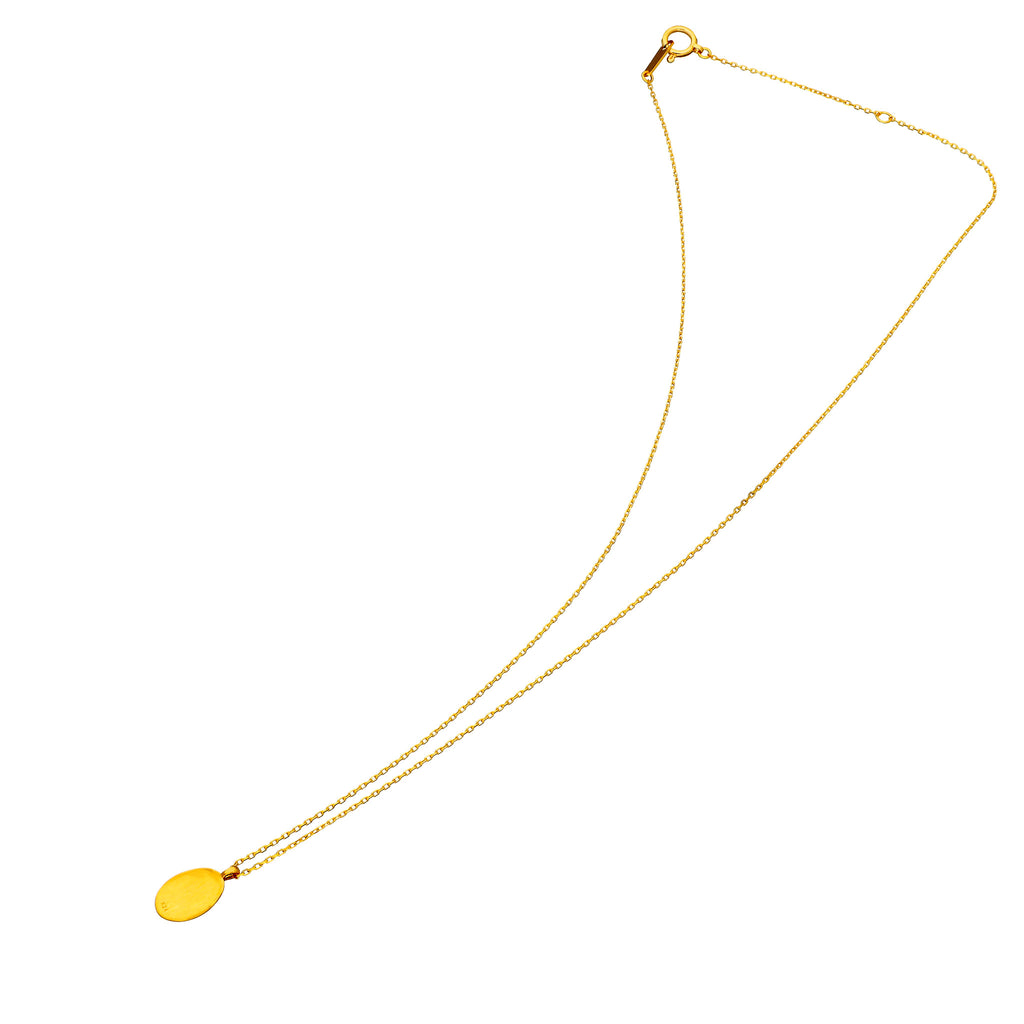 キラッと輝く純金製のカットアズキチェーンに、小ぶりな楕円形の純金製のペンダントトップを通してあります。