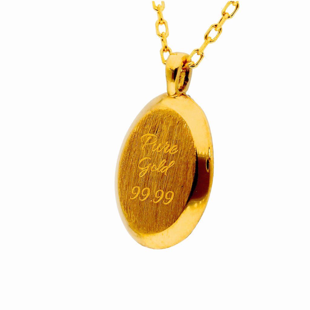 純金製のペンダントトップの表面は上品なつや消し加工が施されていて、表面には「Pure Gold 99.99」、裏面には「K24」と文字が彫られています。