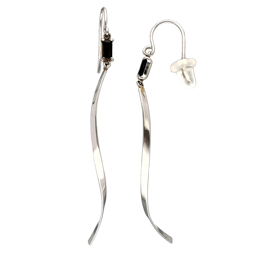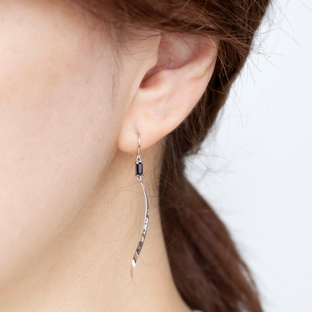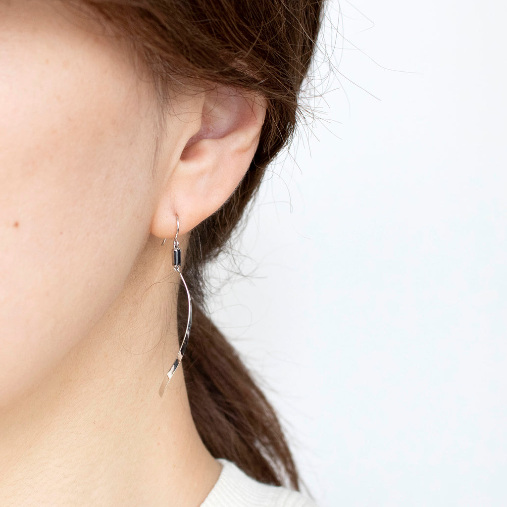 長めのリボン状のパーツが耳元で揺れる、クールな印象のピアスです。
