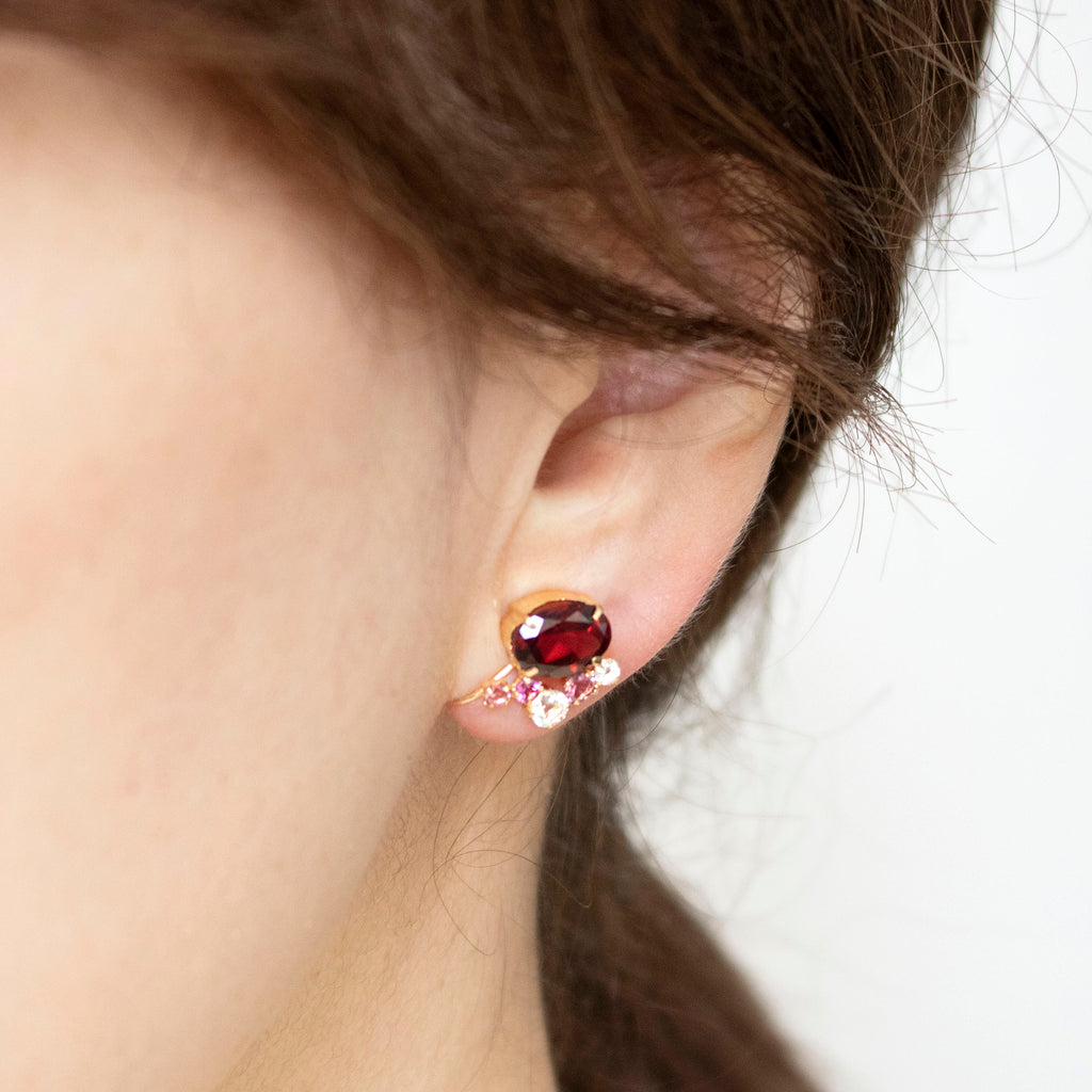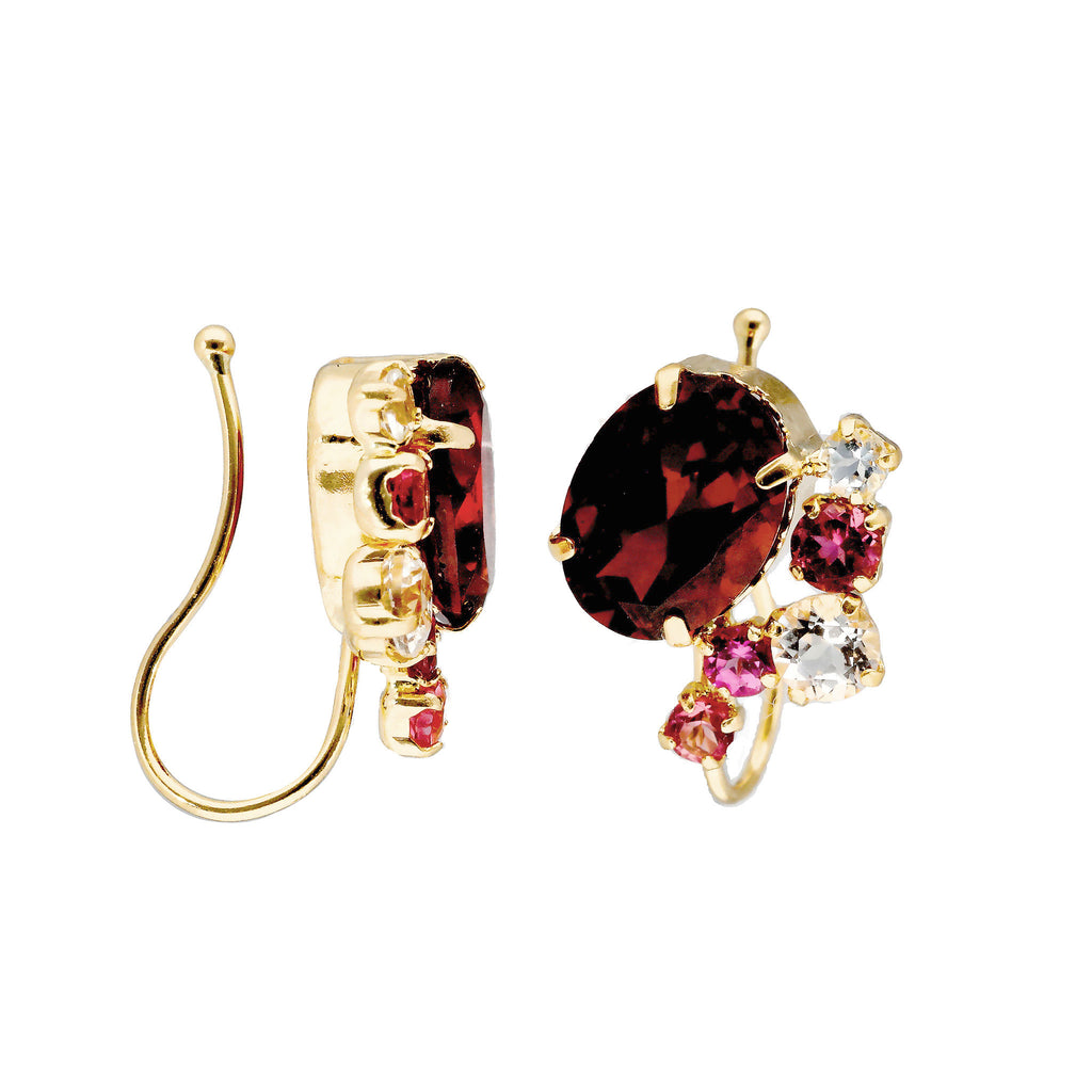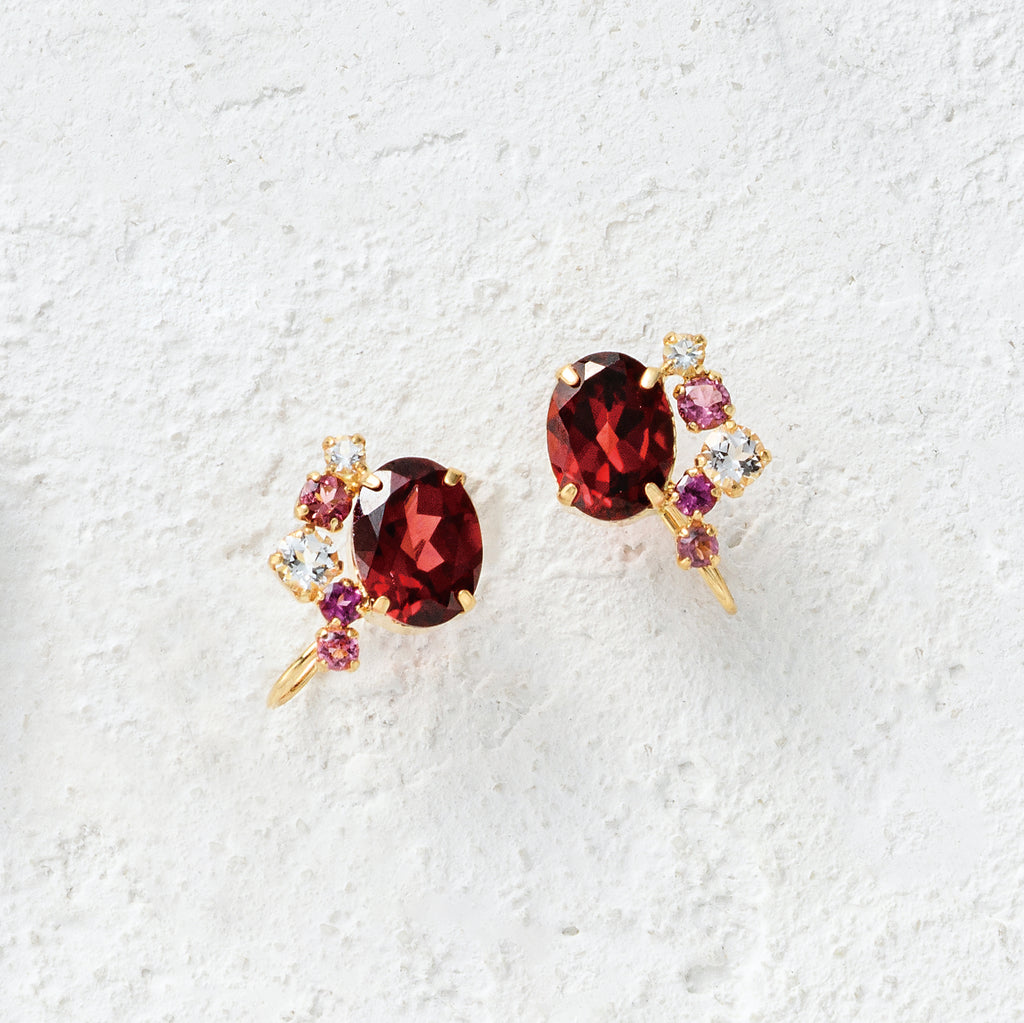 こっくりとした赤色のガーネットをメインに、カラーストーンをバランスよく配置したイヤリング兼イヤーカフです。