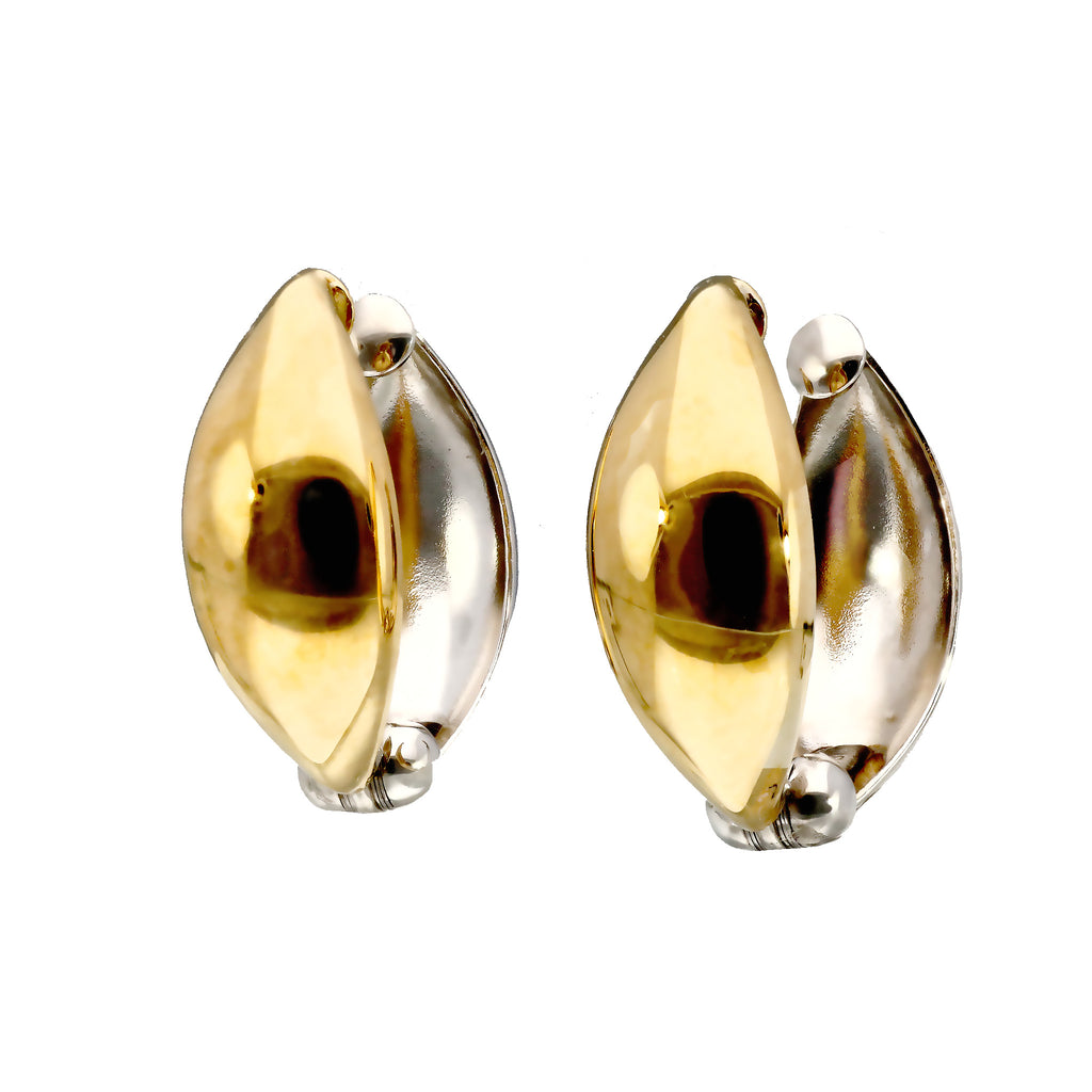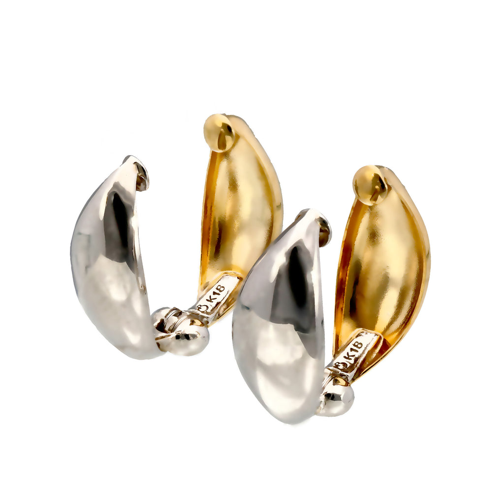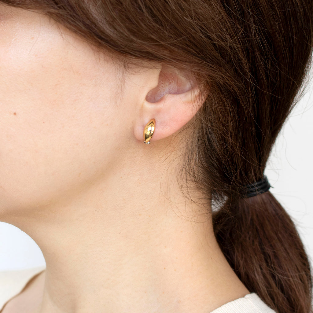 シンプルなリーフ形のピアリングの片側は10金イエローゴールドに、片側は10金ホワイトゴールドに地金の色を変えてあるので、その日の気分によって地金の色を変えて見せることができるお得な仕様。