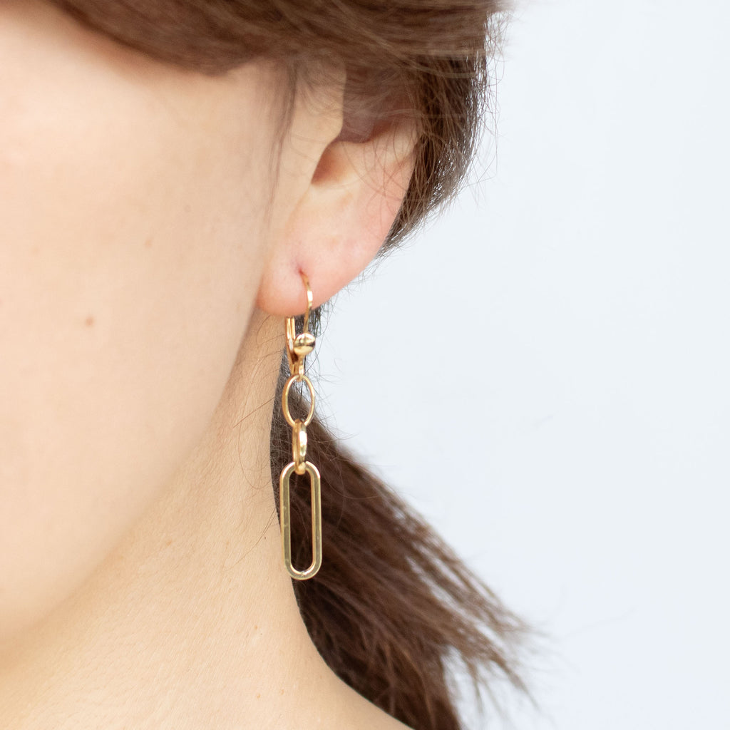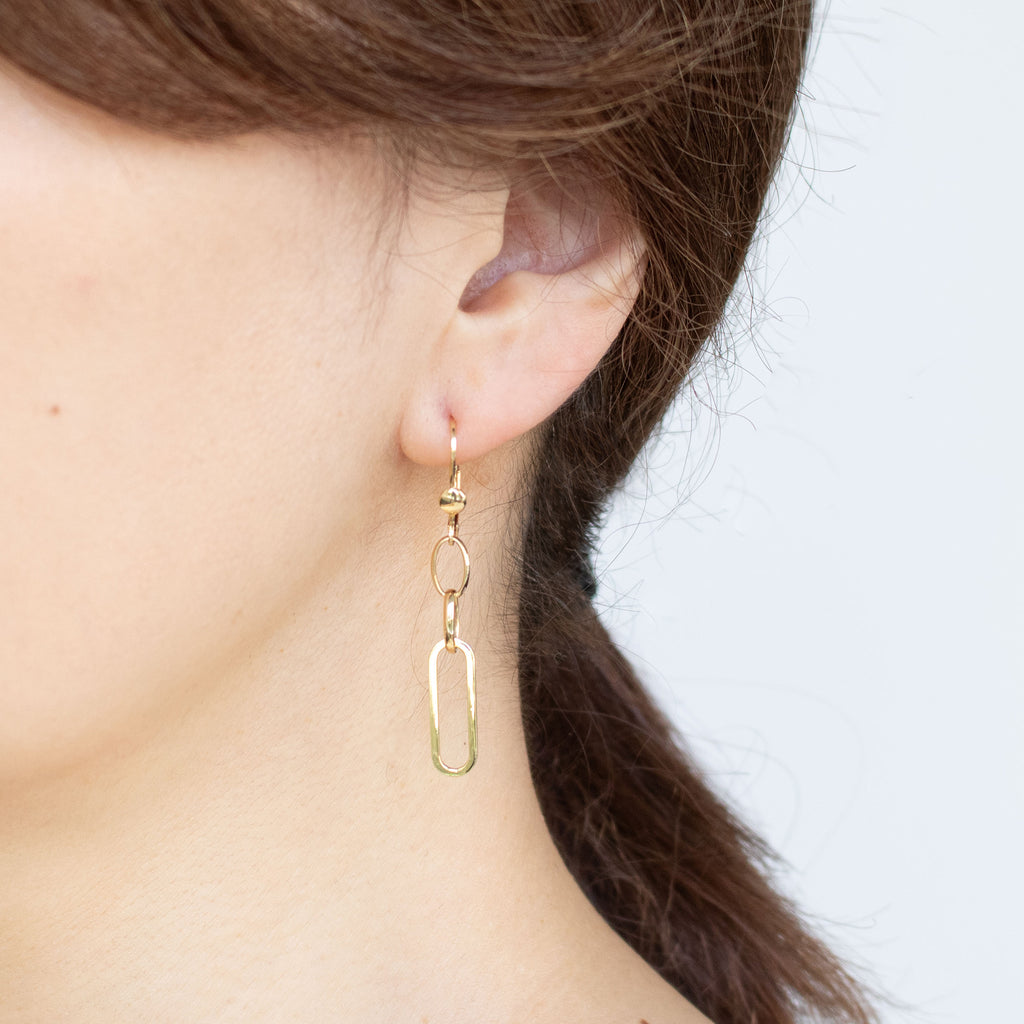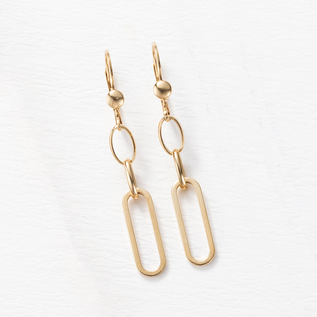 フック式のピアス金具の下に、楕円形の小ぶりなパーツ2つと、縦に細長い大きな楕円形のパーツを繋げたチェーンのようなデザインです。