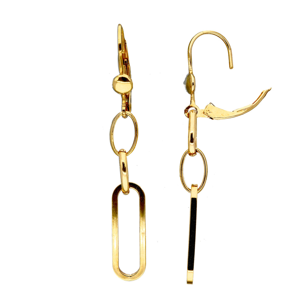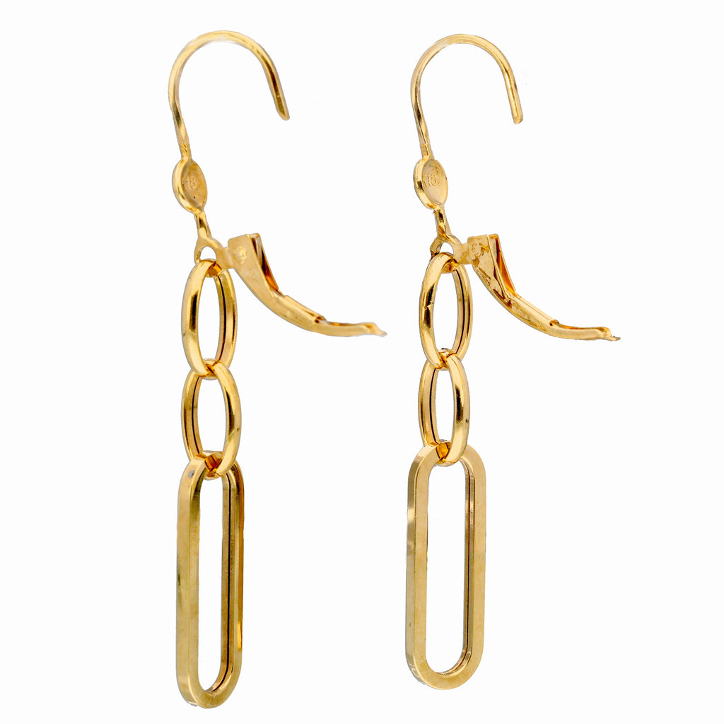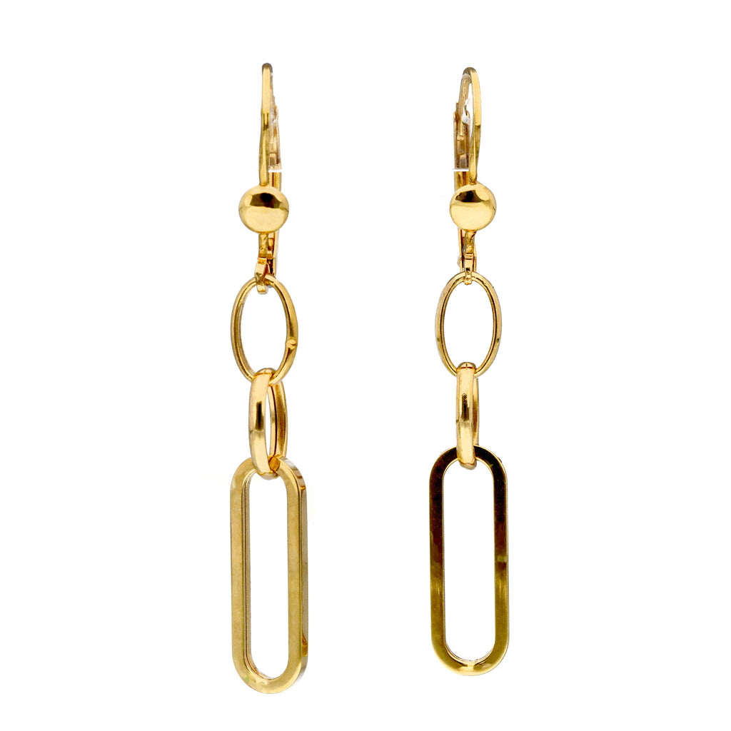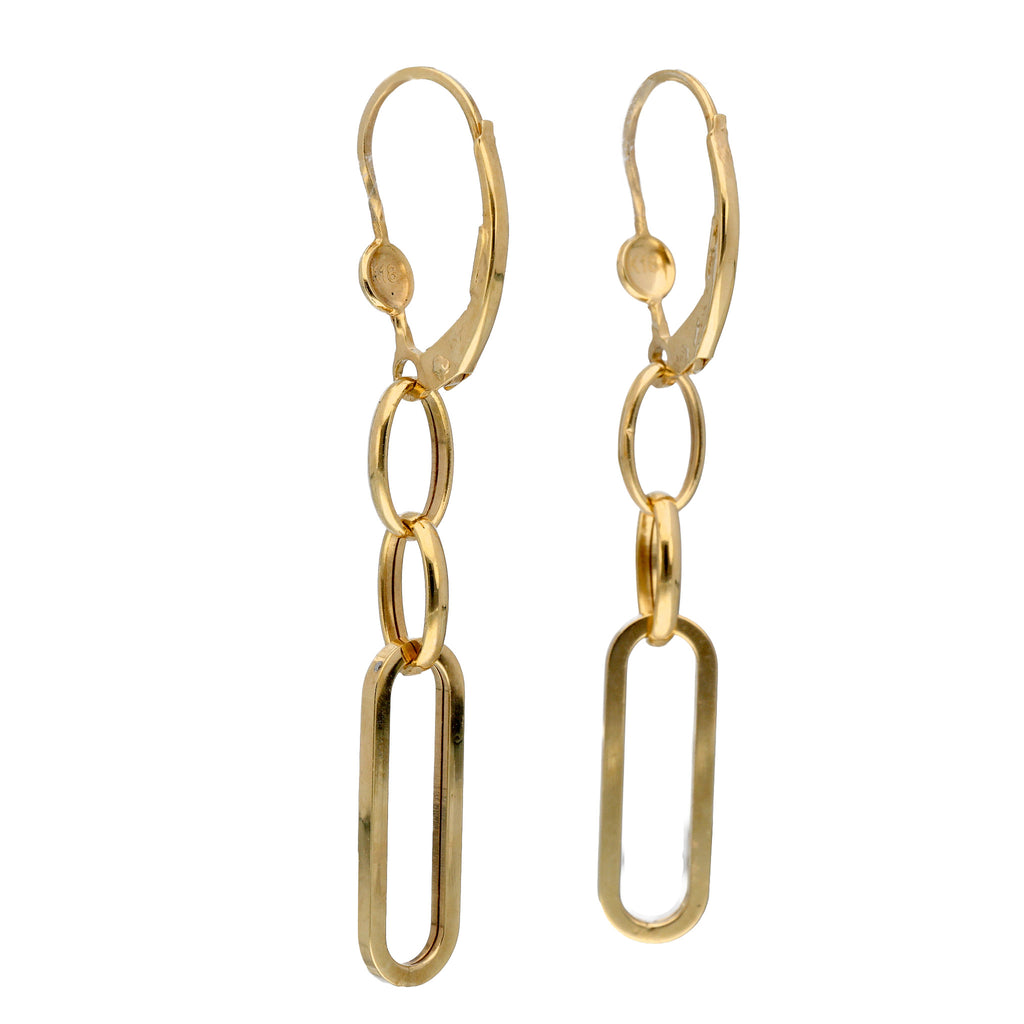 フック式のピアス金具の下に、楕円形の小ぶりなパーツ2つと、縦に細長い大きな楕円形のパーツを繋げたチェーンのようなデザインです。