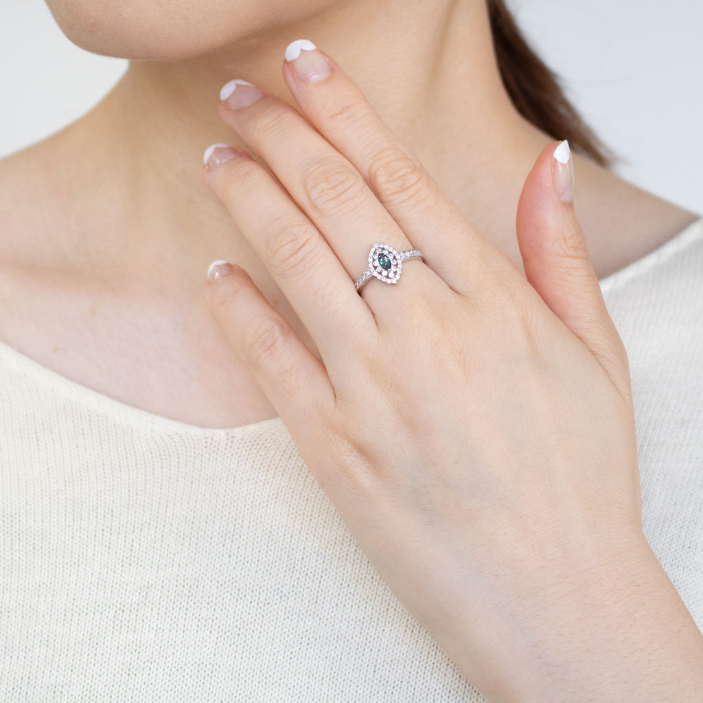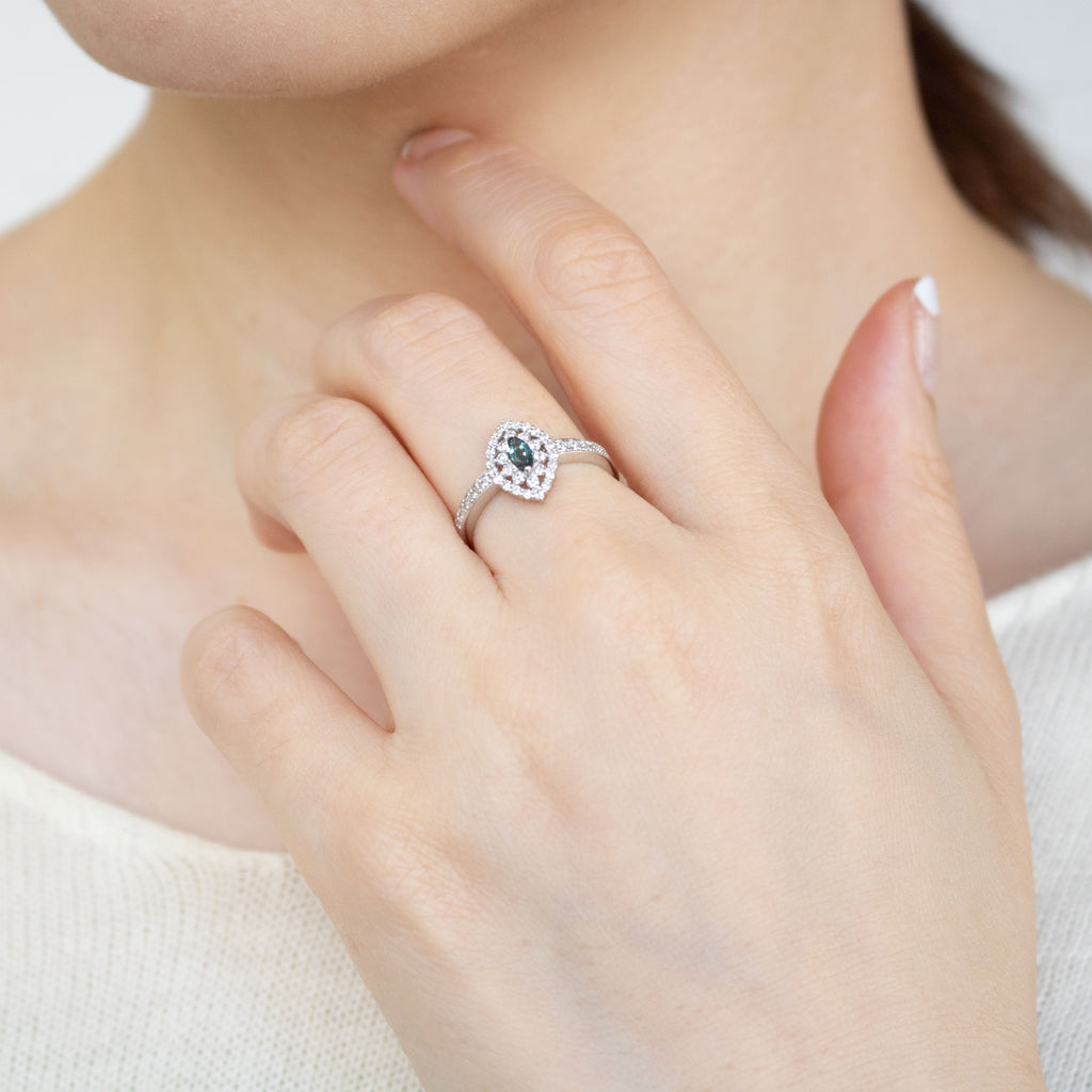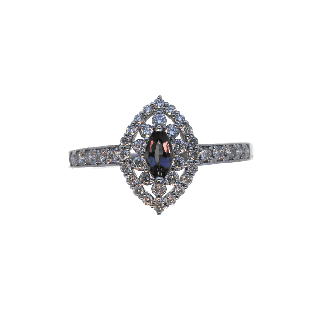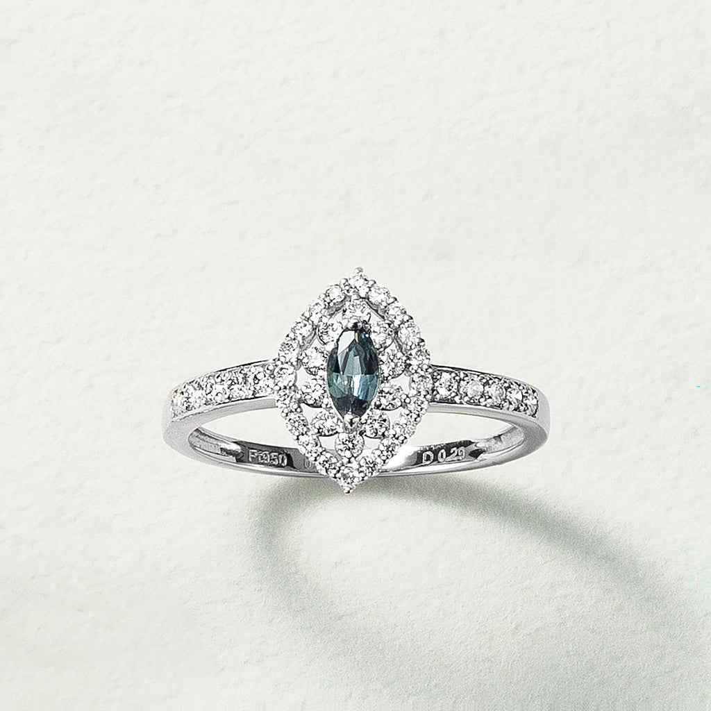マーキスカットのアレキサンドライトをメレダイヤで取り巻いた華やかなデザインです。