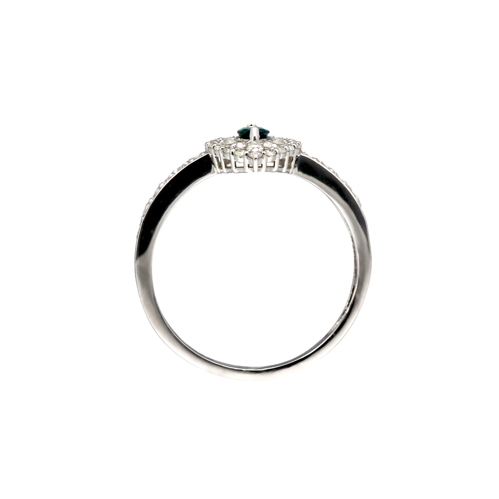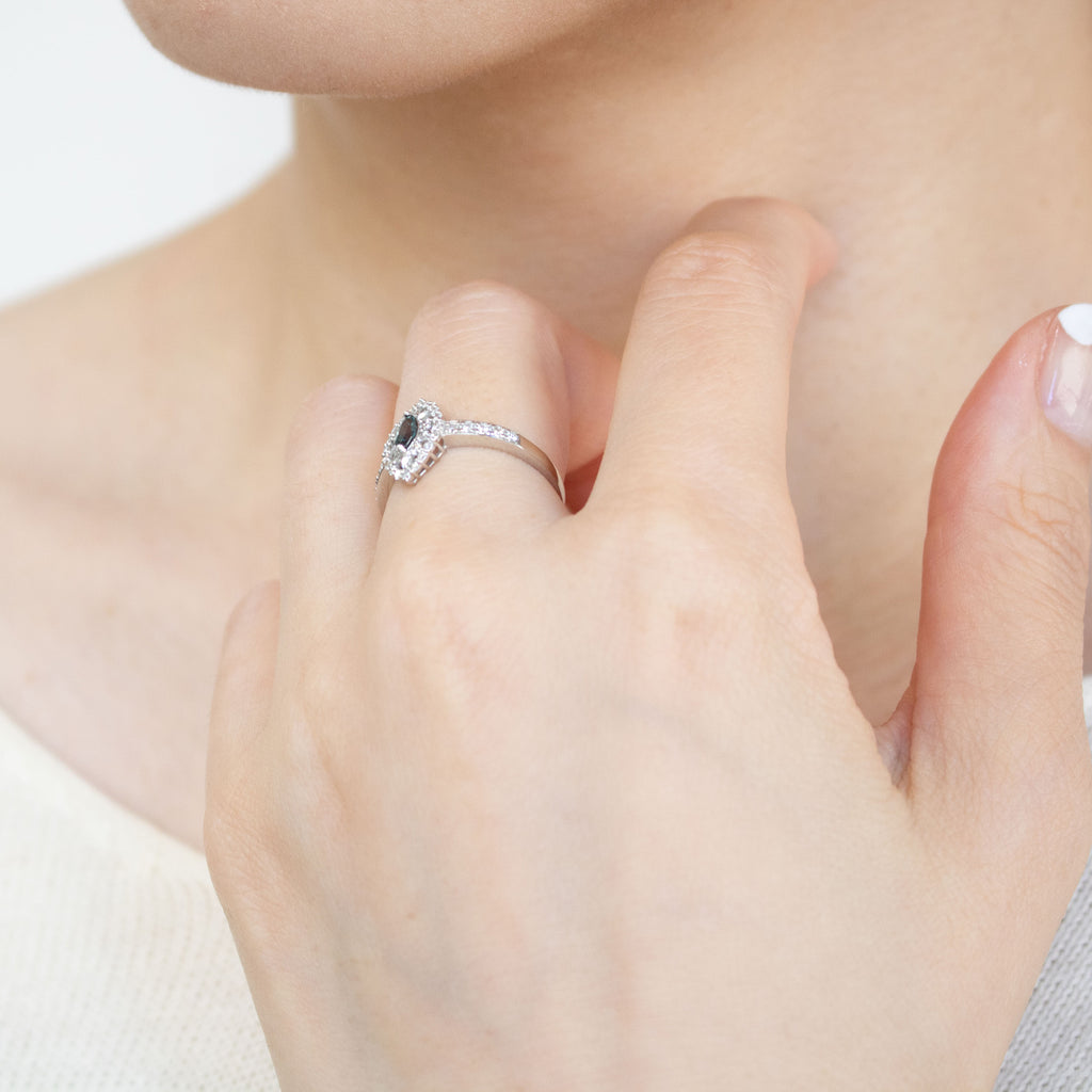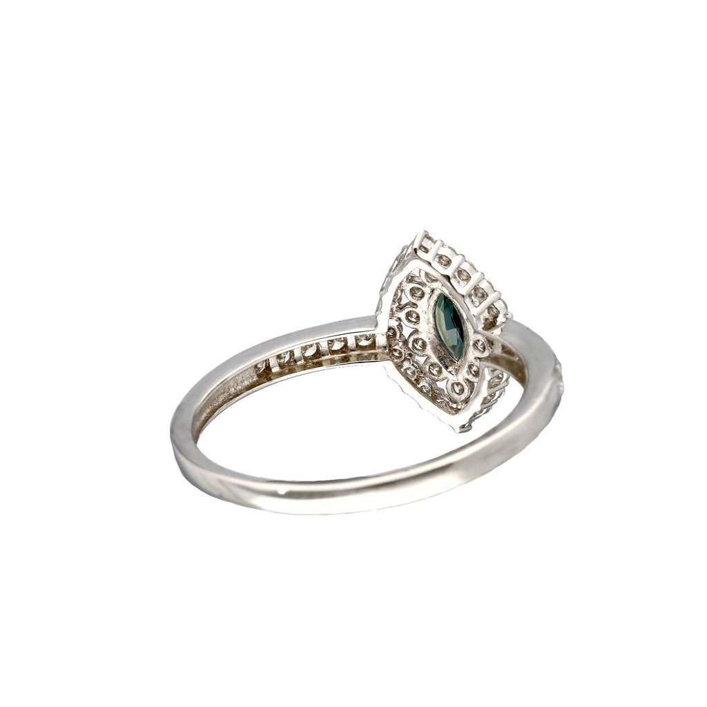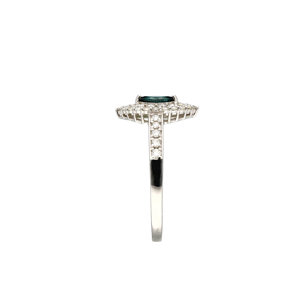 マーキスカットのアレキサンドライトをメレダイヤで取り巻いた華やかなデザインです。