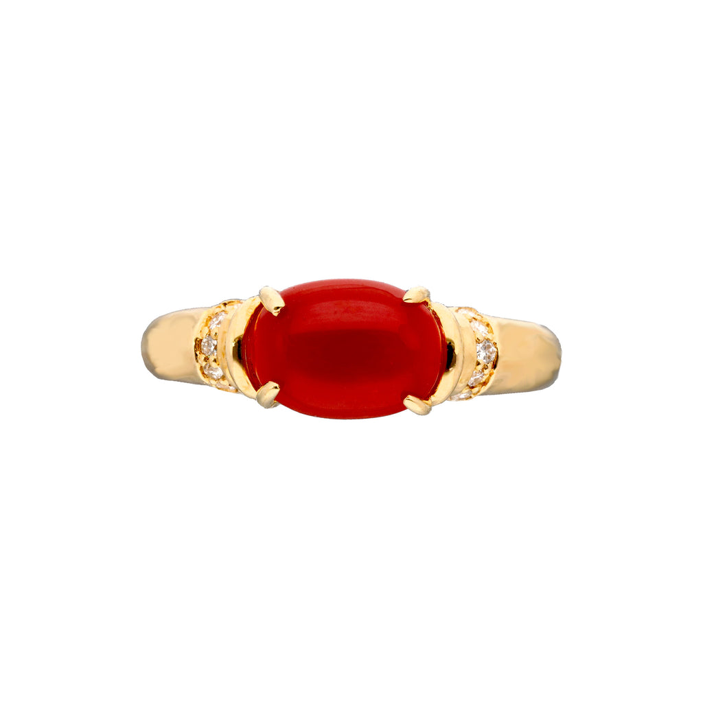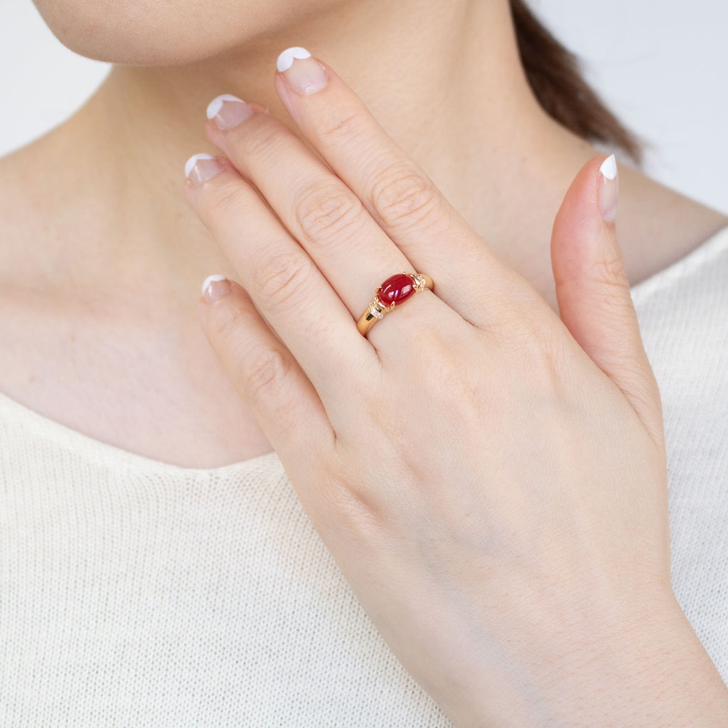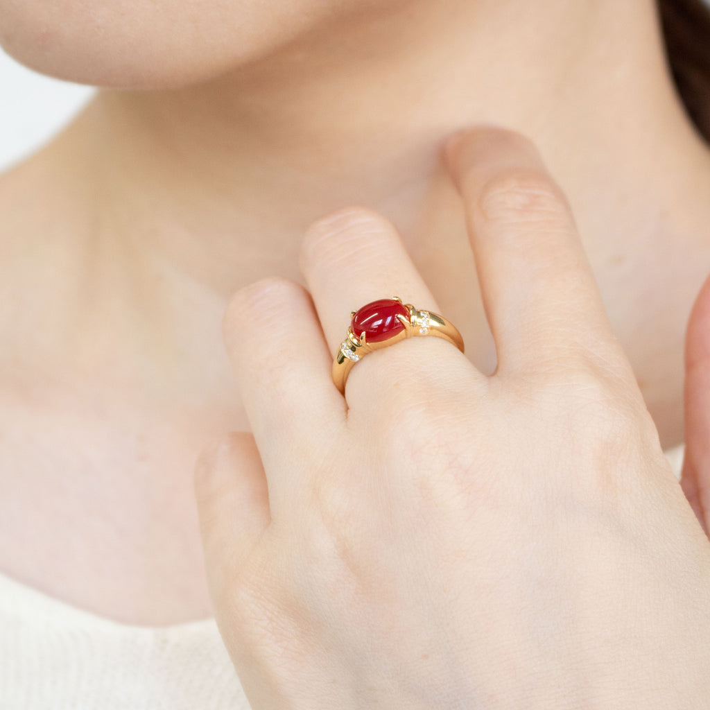 オーバルカボションカットに整えられた赤色のサンゴを18金イエローゴールド製の枠に横向きにセットしました。