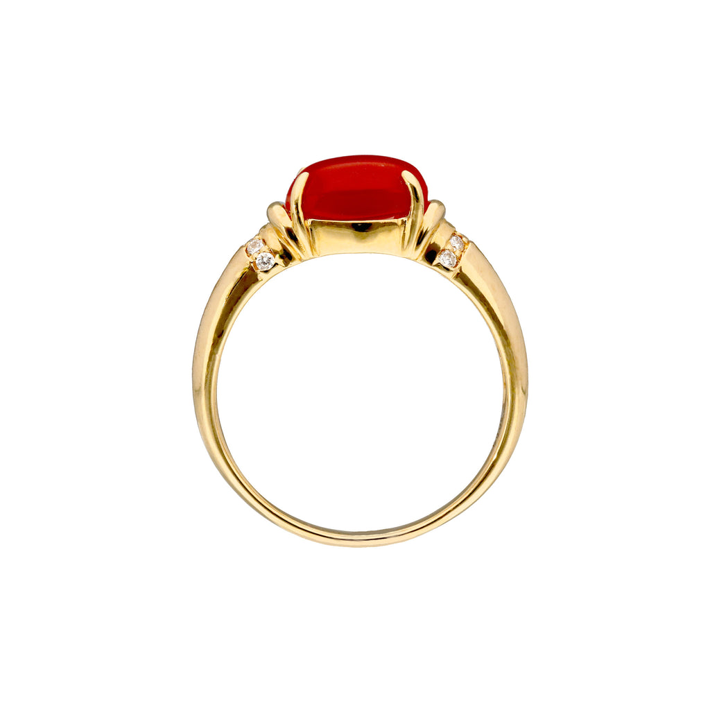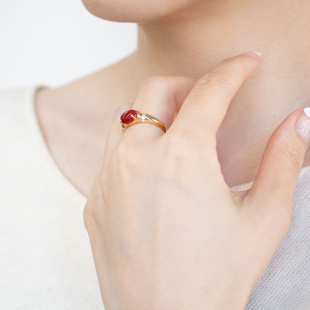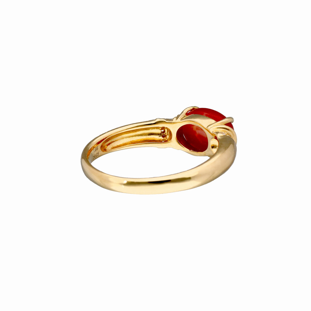 オーバルカボションカットに整えられた赤色のサンゴを18金イエローゴールド製の枠に横向きにセットしました。