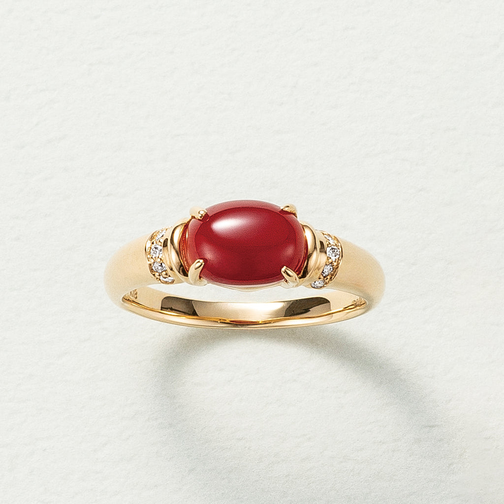 つややかに磨き上げられたサンゴを4本の爪でしっかりとセット。サンゴの左右にはキラキラと輝くメレダイヤを留めて華やかさをプラスしています。