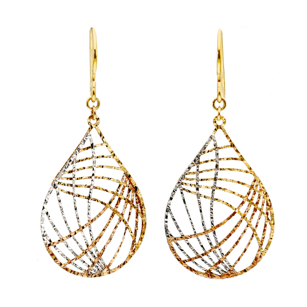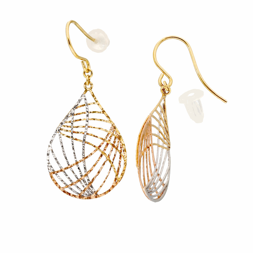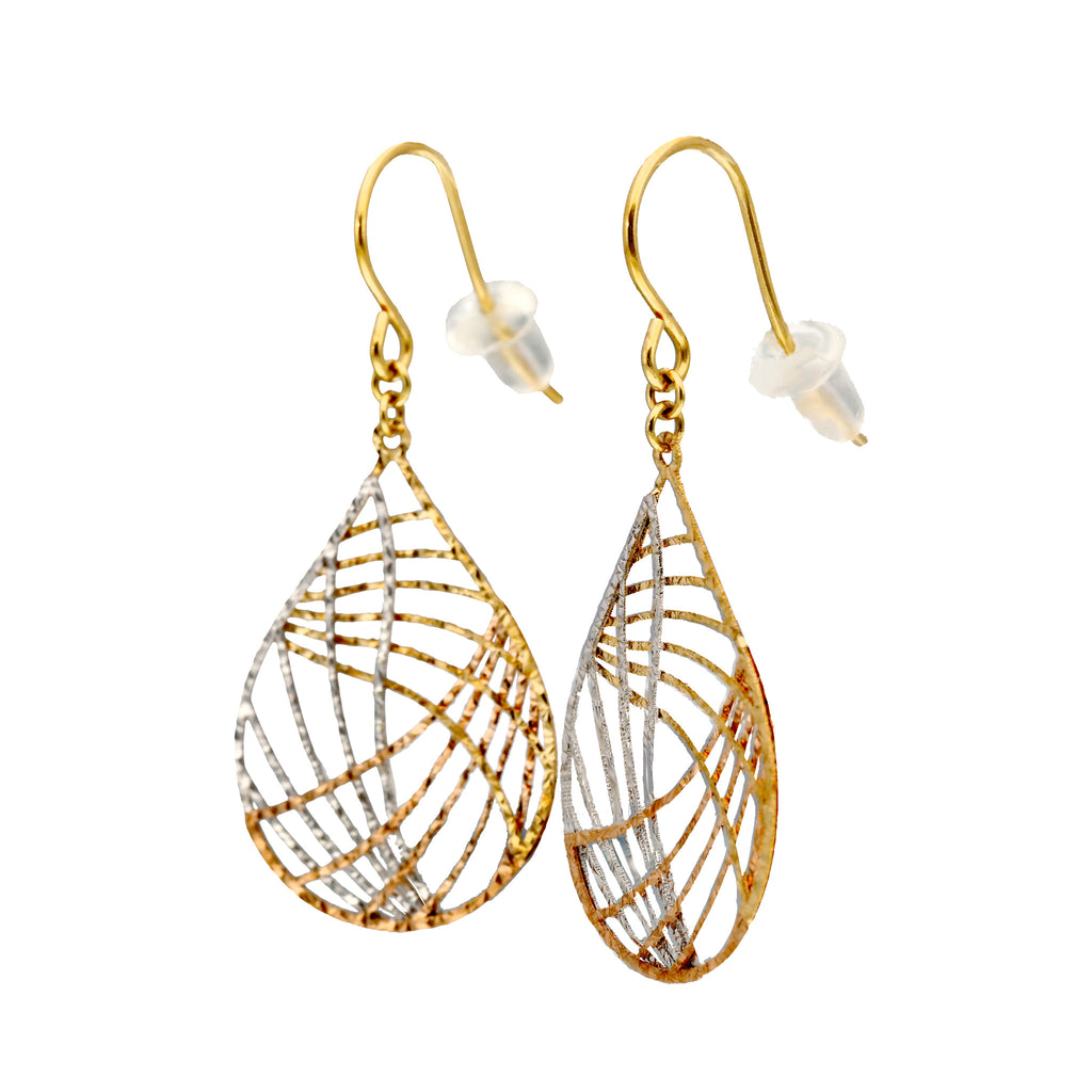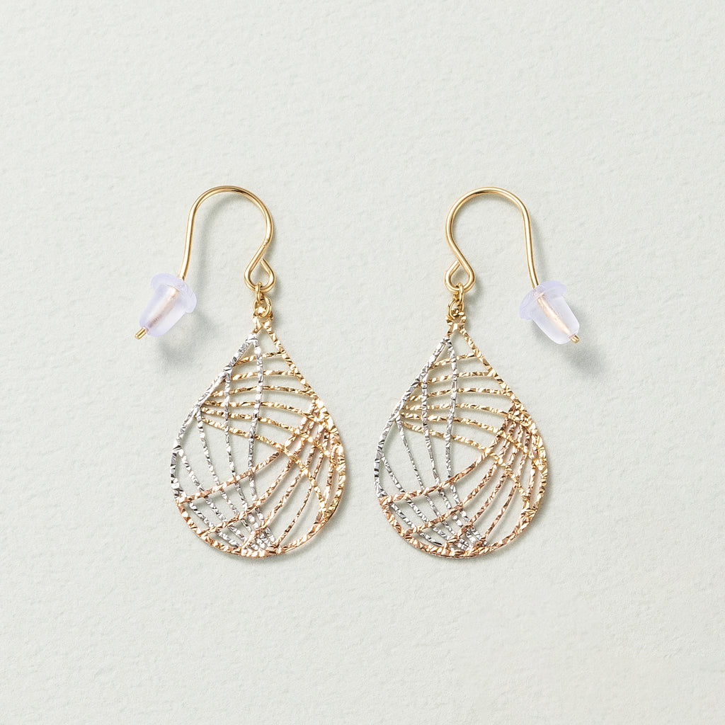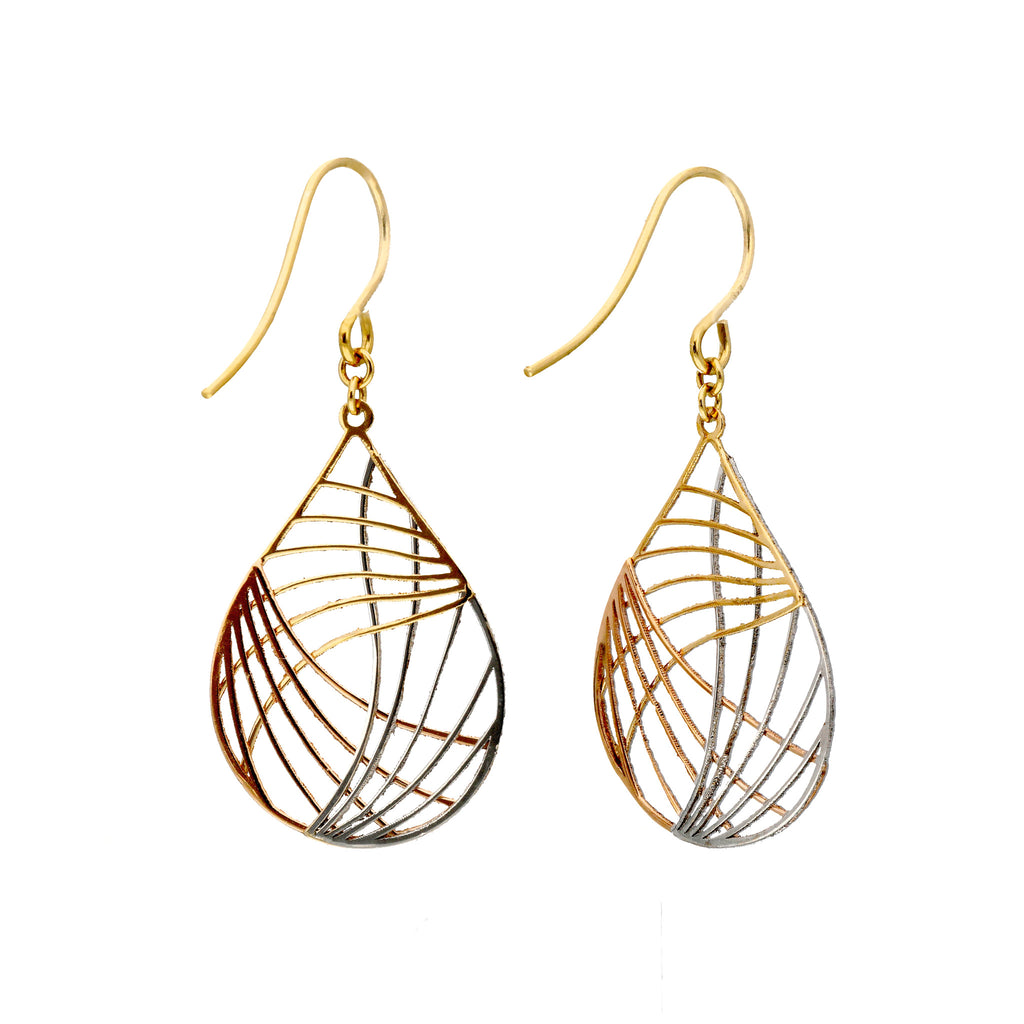 程よい大きさの雫形の板状のパーツは、18金イエローゴールド、18金ホワイトゴールド、18金ピンクゴールドの曲線が幾何学模様を描いたデザインです。