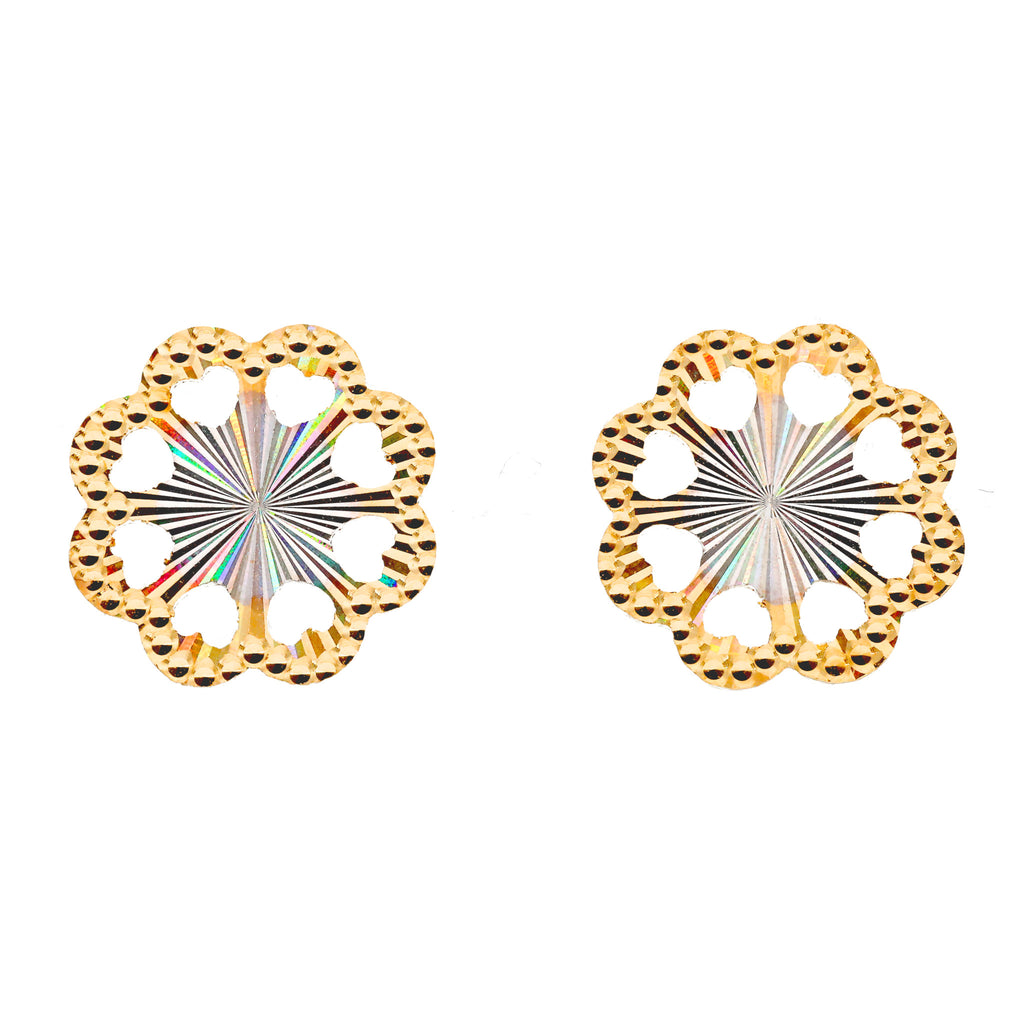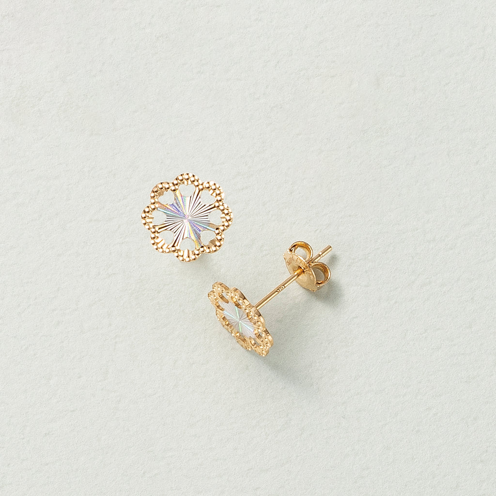 18金イエローゴールド製の小ぶりなフラワーモチーフの中央には特殊なカットが施されており、思わず目を奪われる美しい虹色の輝きを楽しめます。