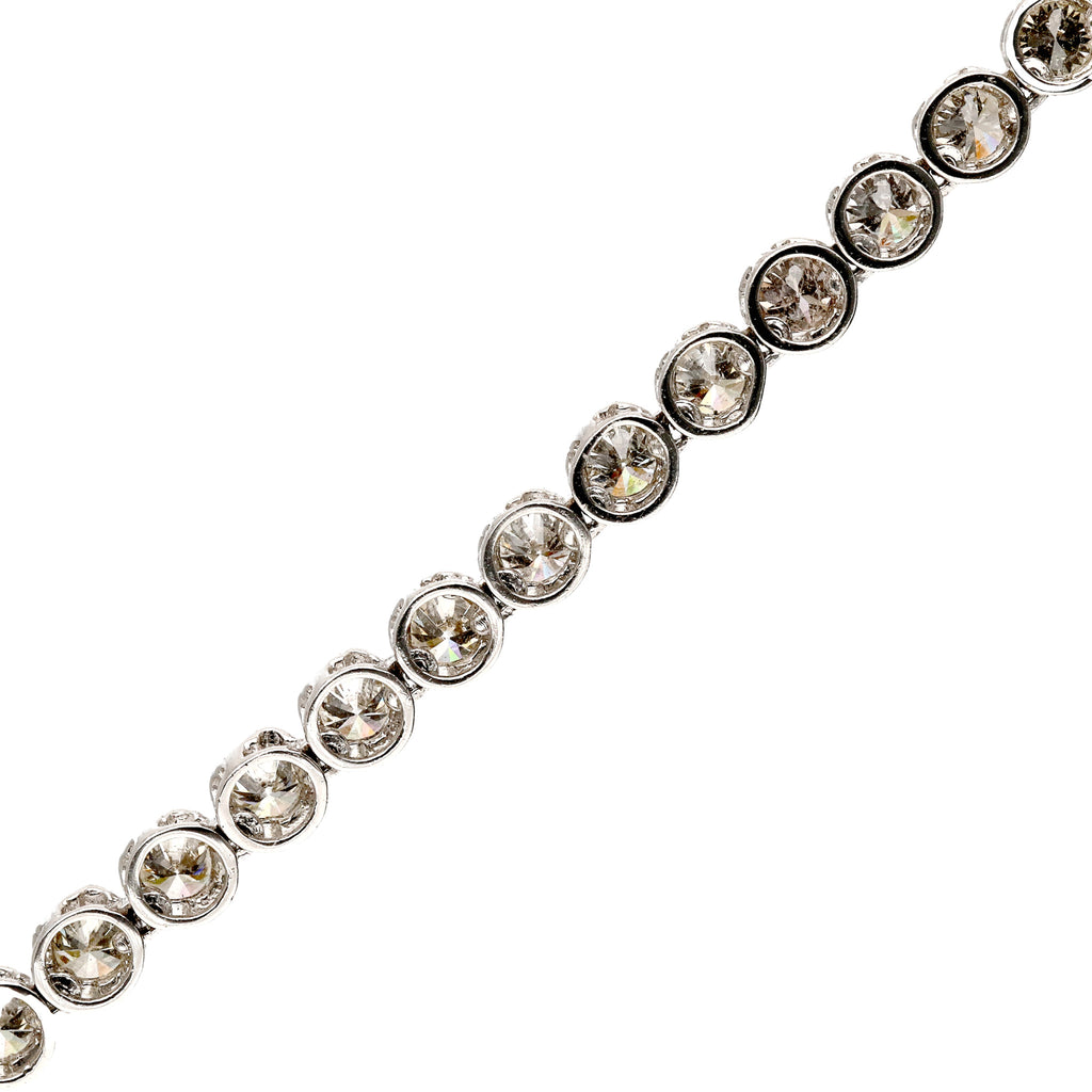 高級感のあるプラチナ製の枠にしっかりと留めたメレダイヤのラインが強い輝きを放つブレスレット。ボリューム感があって存在感は抜群です。ぐるっと一周同じ太さのブレスレットです。