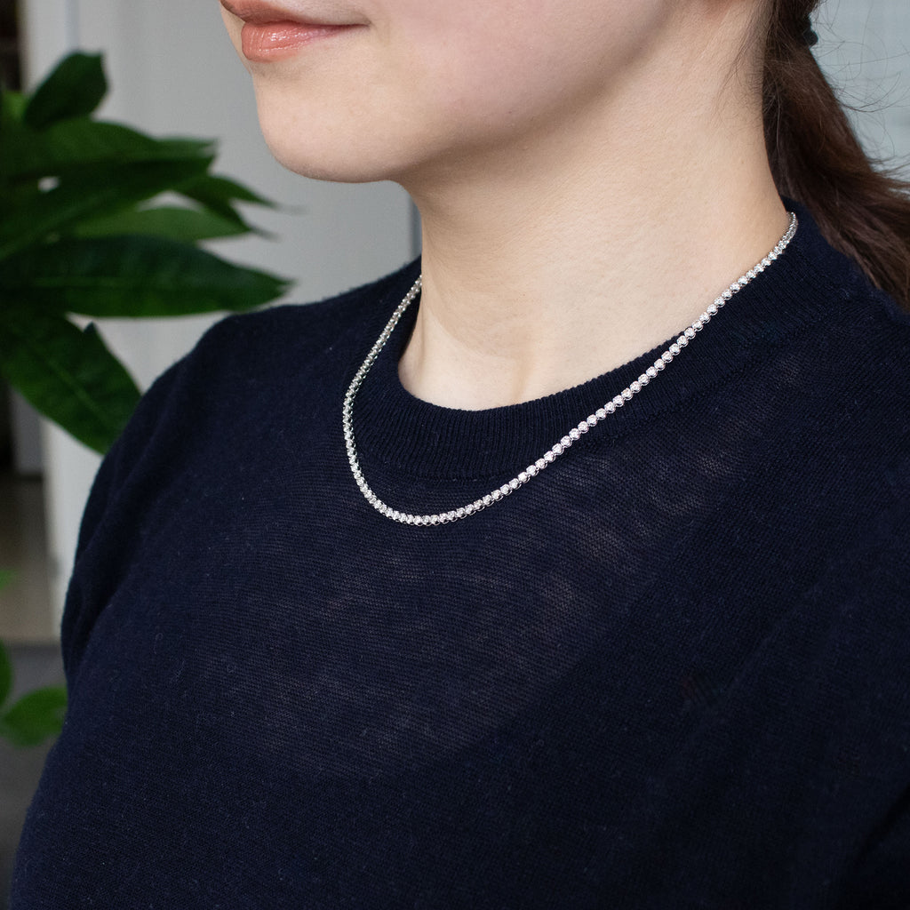 148石合計5ctものメレダイヤを1石ずつ丁寧に4本の爪でセット。それを繋げて全長約42cmのネックレスに仕立てました。