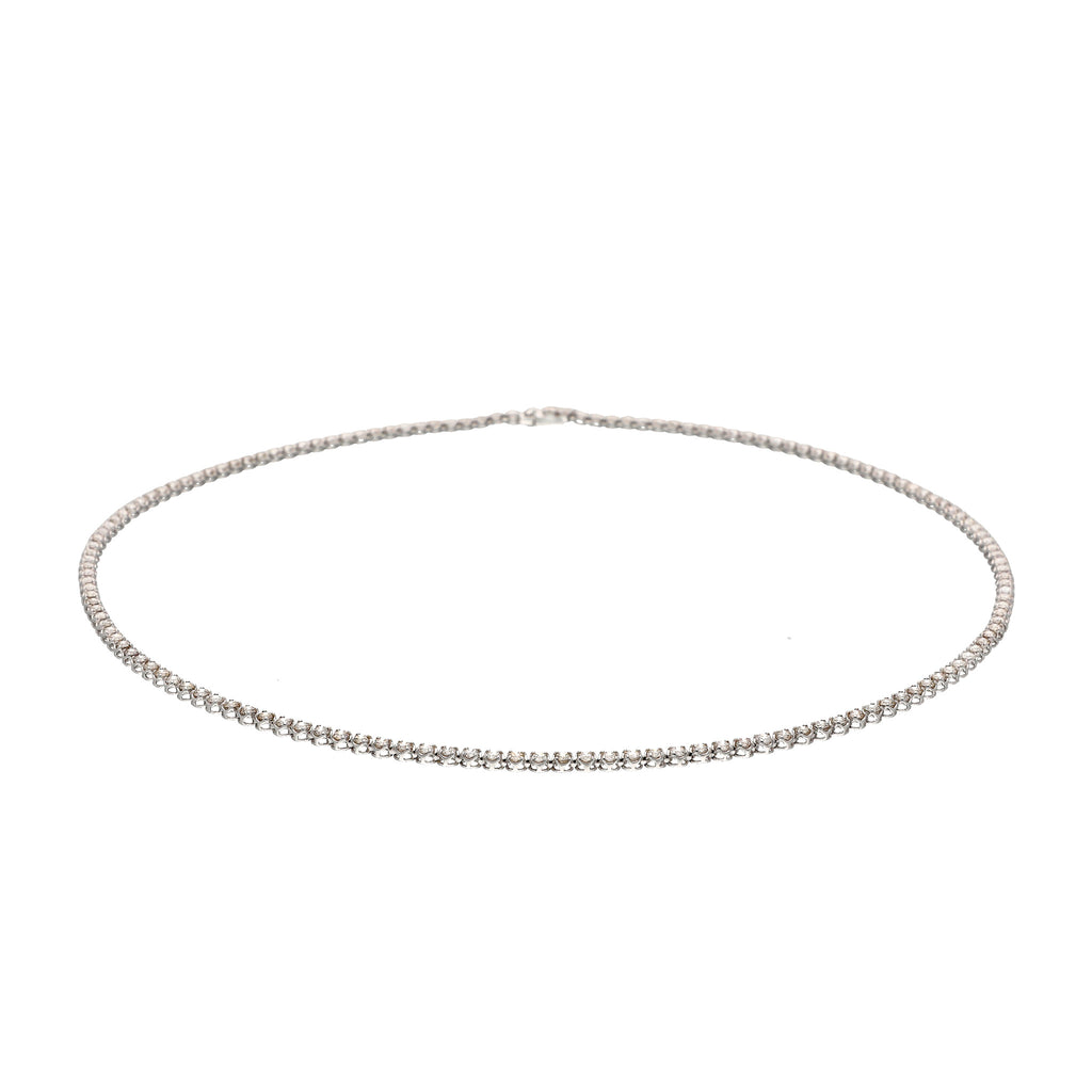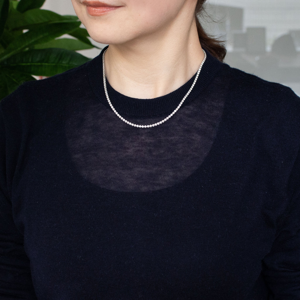 高級感のあるプラチナ製の枠にしっかりと留めたメレダイヤのラインが強い輝きを放つネックレス。ボリューム感があって胸元での存在感は抜群です。ぐるっと一周同じ太さのネックレスです。