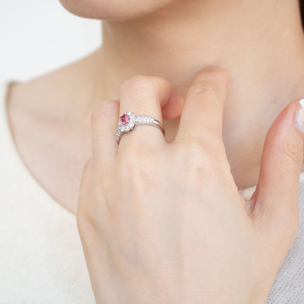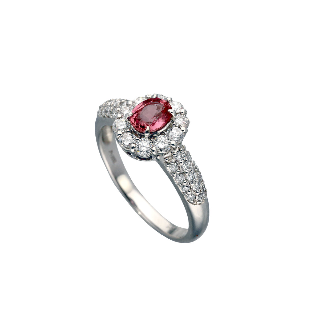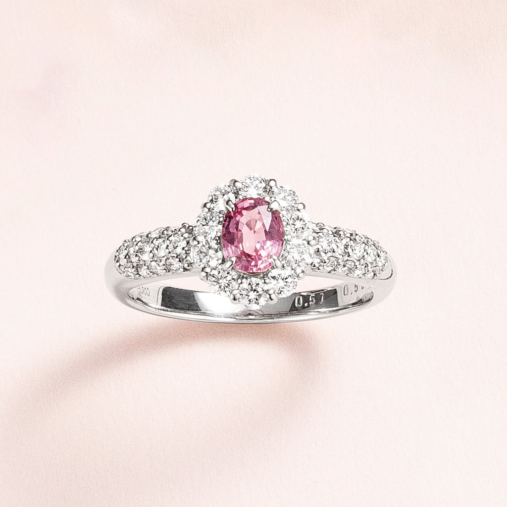 キラキラとした輝きを放つオーバルカットのパパラチアサファイアをメレダイヤでぐるりと取り巻いた風格のあるデザイン。