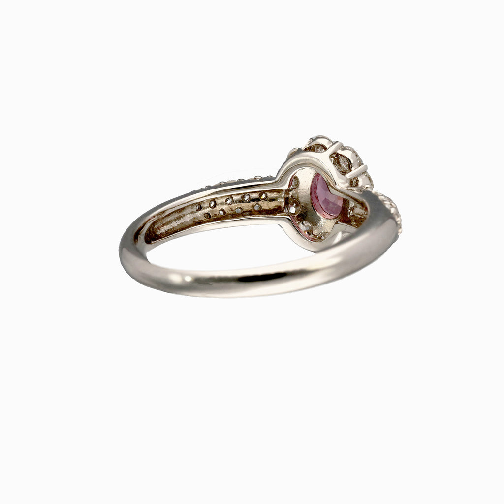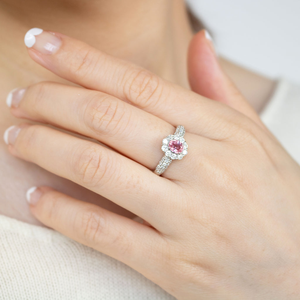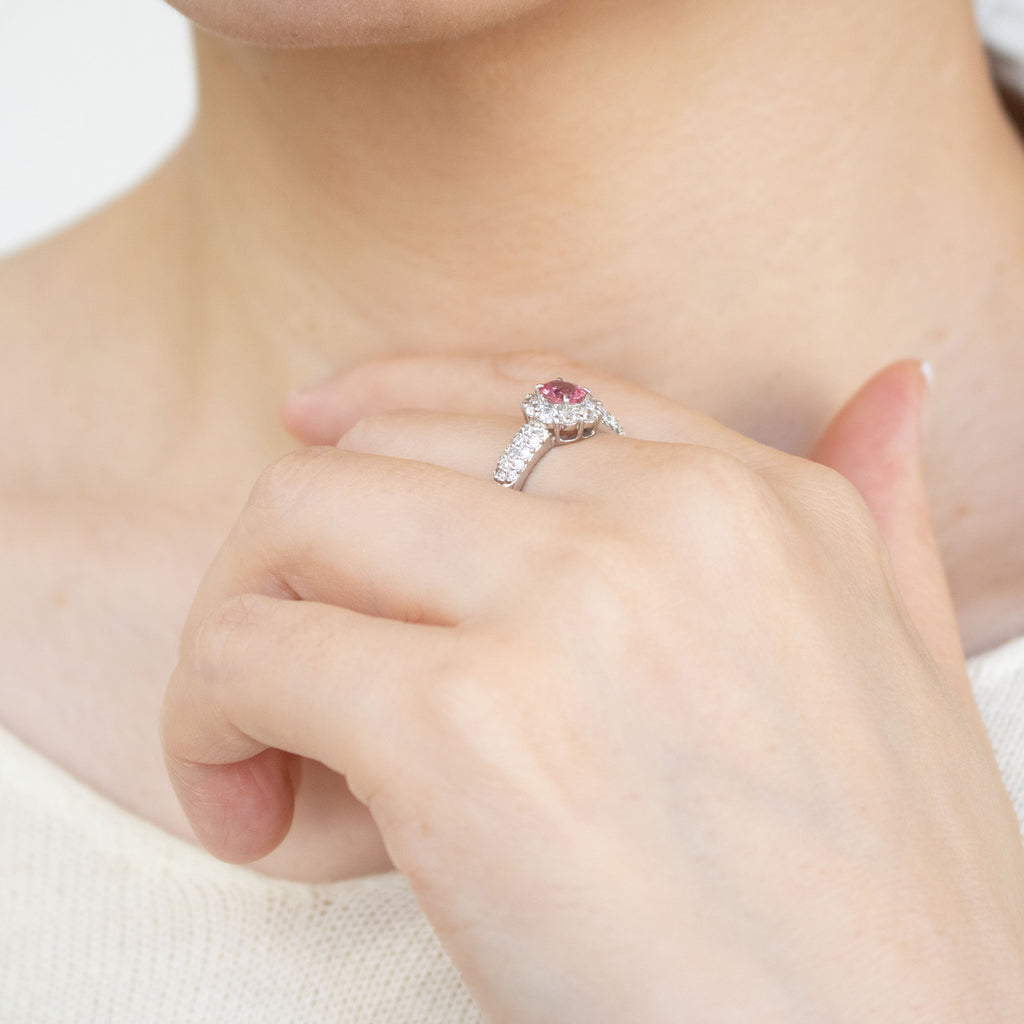キラキラとした輝きを放つオーバルカットのパパラチアサファイアをメレダイヤでぐるりと取り巻いた風格のあるデザイン。