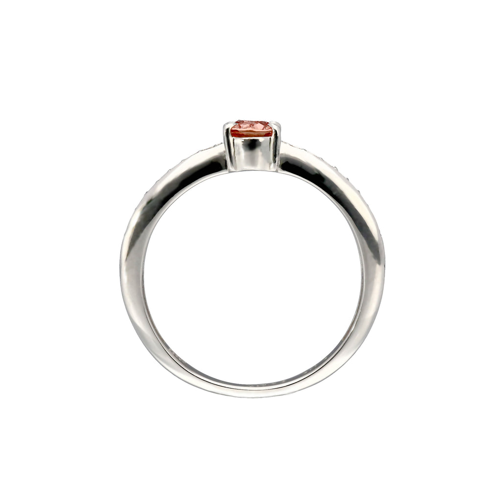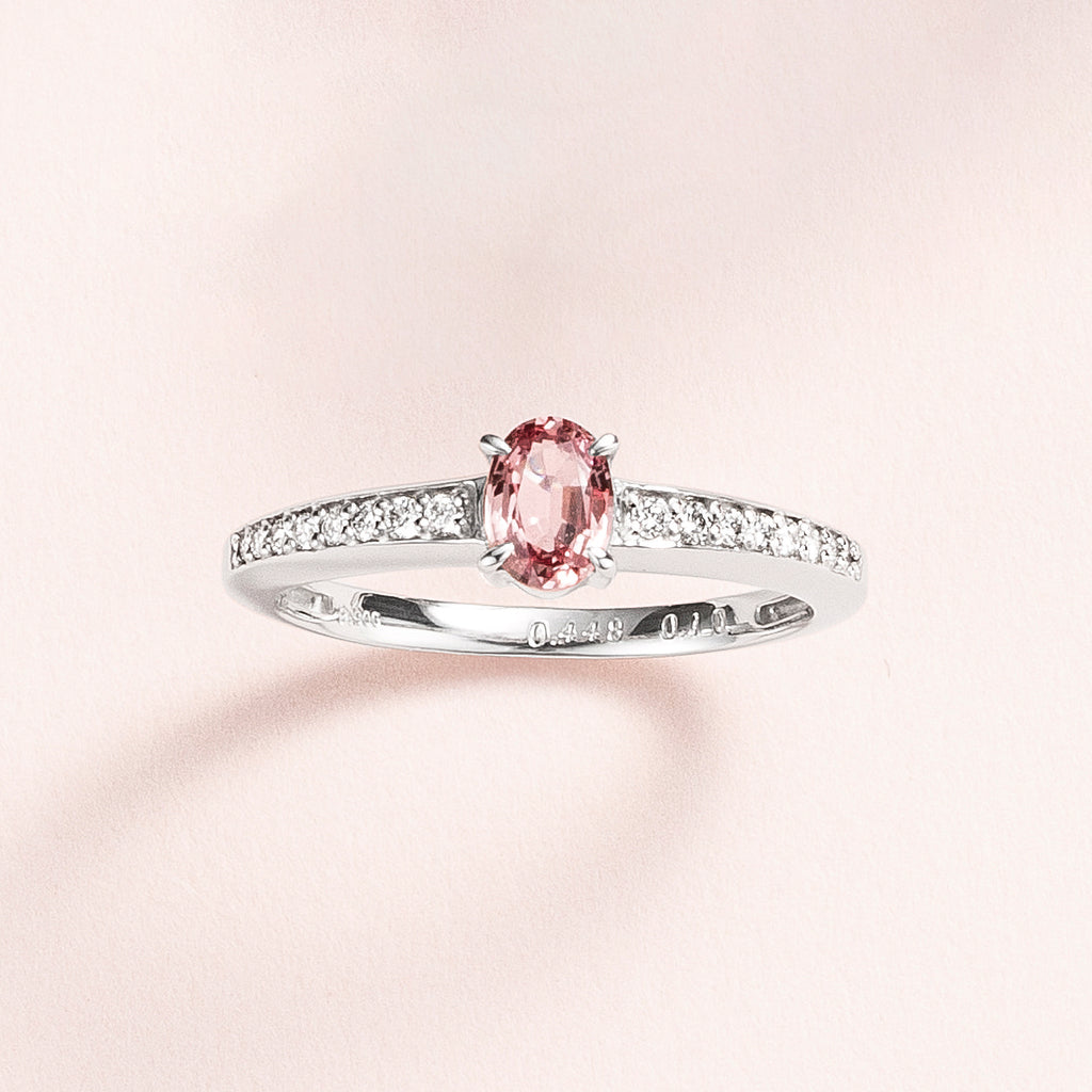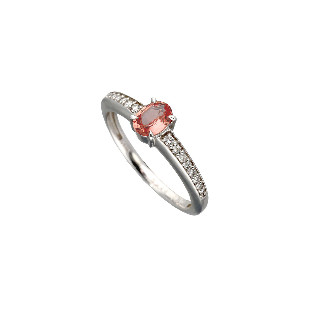 0.448ctのオーバルシェイプのパパラチアサファイアをセンターに留めたプラチナ製のリングです。