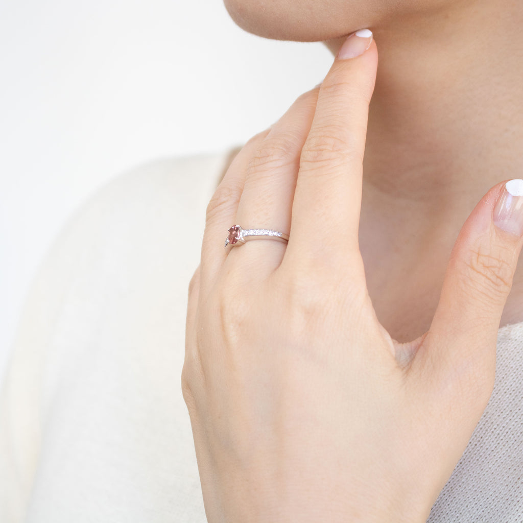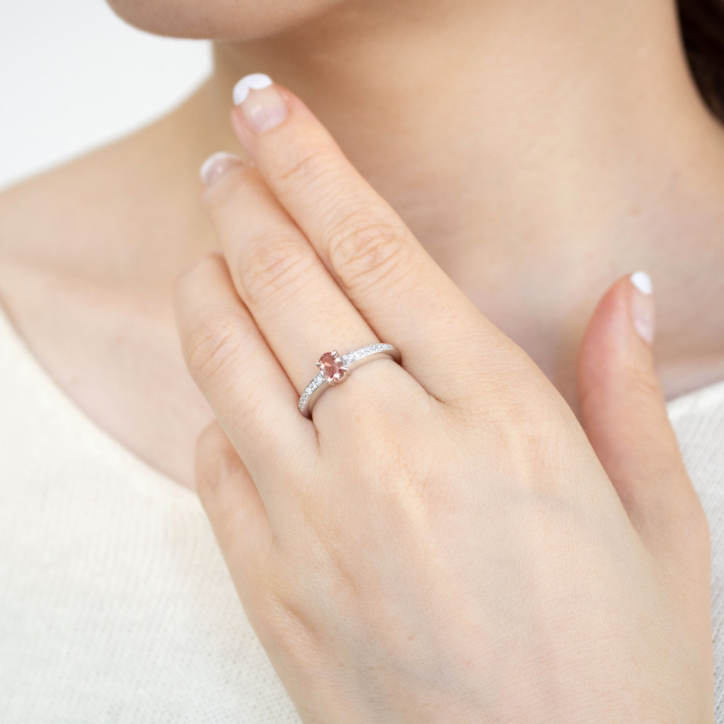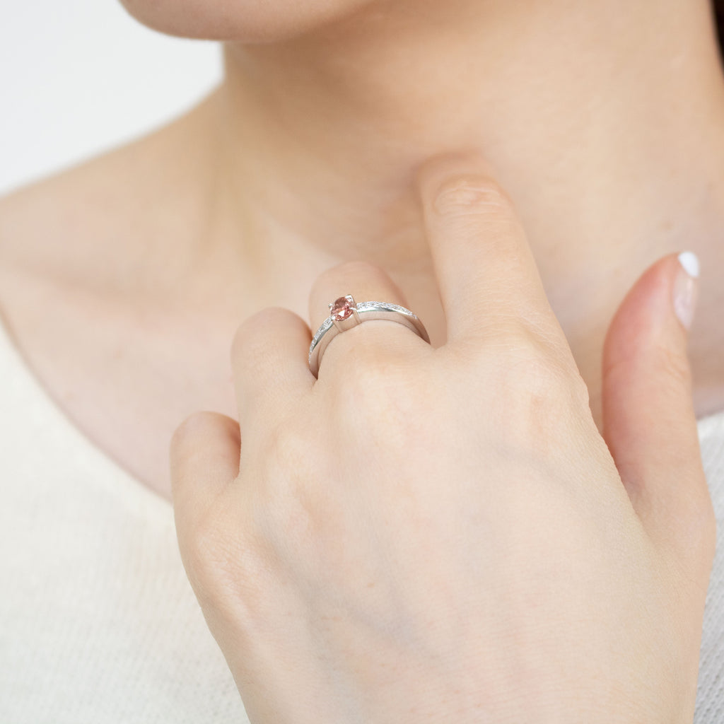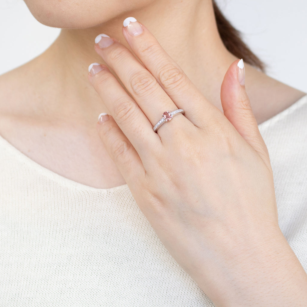 0.448ctのオーバルシェイプのパパラチアサファイアをセンターに留めたプラチナ製のリングです。