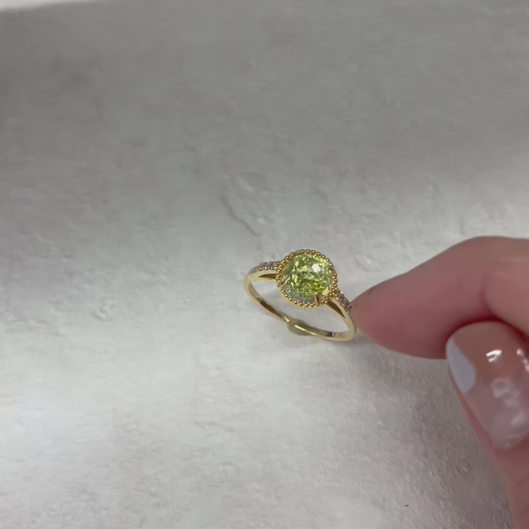 リングのセンターに留められているのはローズカットが施されたロッククリスタルです。高さのあるセッティングで留めたロッククリスタルの下にはダンシングストーンセッティングにしたペリドットが留められています。