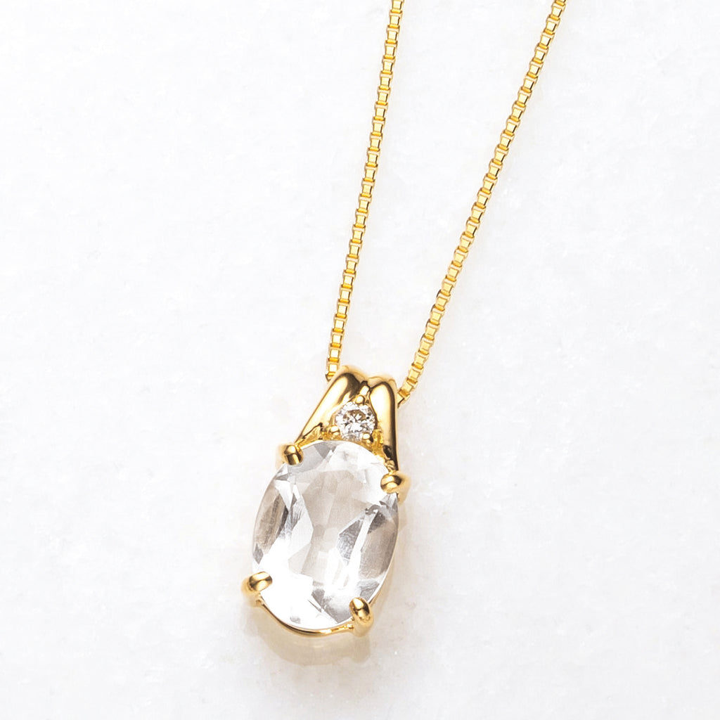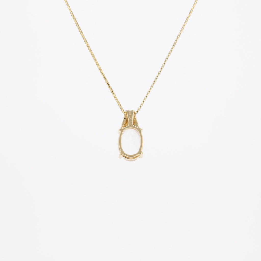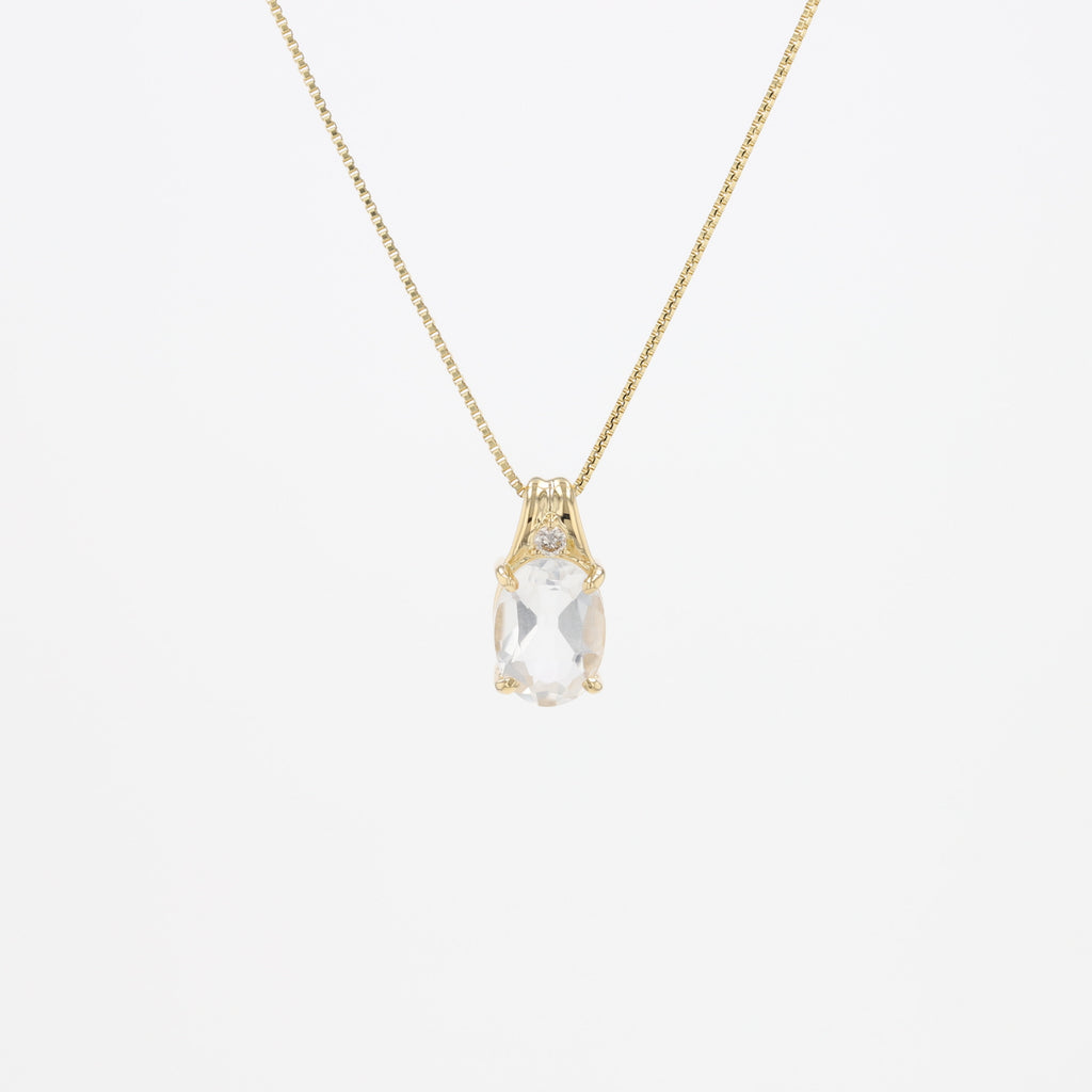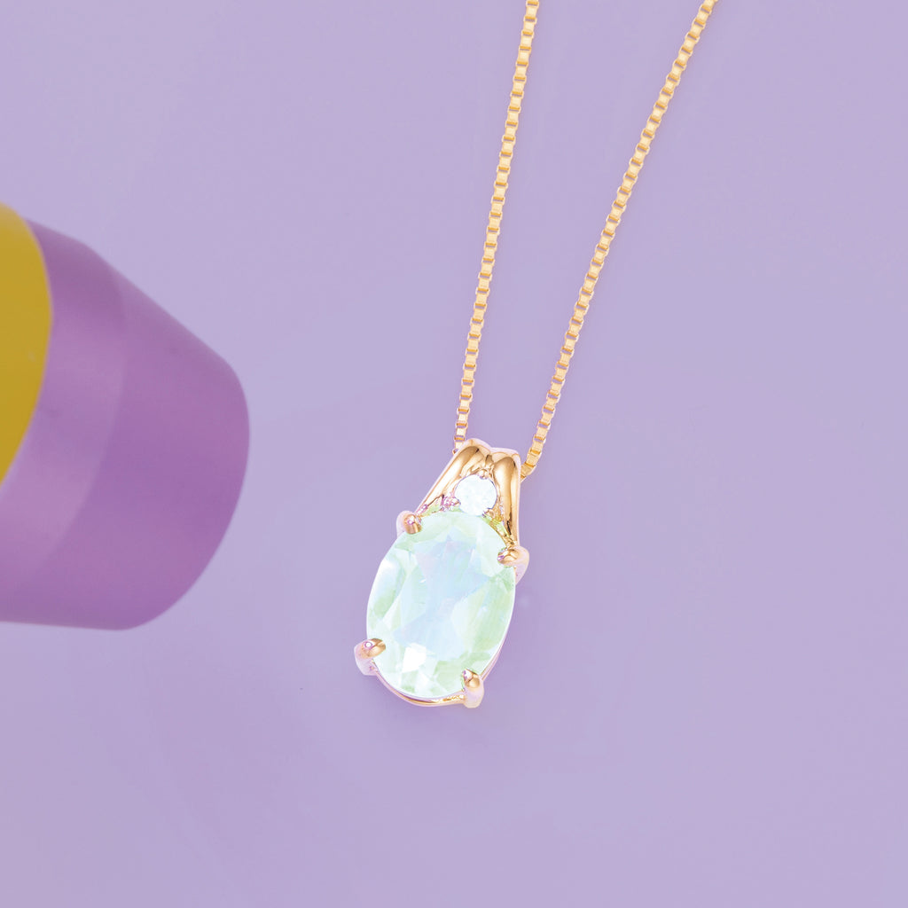 チェーンを通すバチカンにキラッと輝くメレダイヤを1石留めたシンプルなデザインです。ハイアライトオパールの淡いミントカラーが引き立つイエローゴールド製の枠にセットしました。