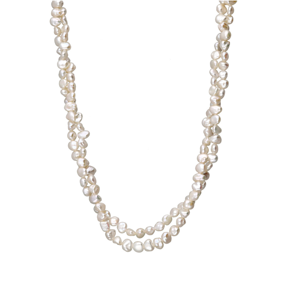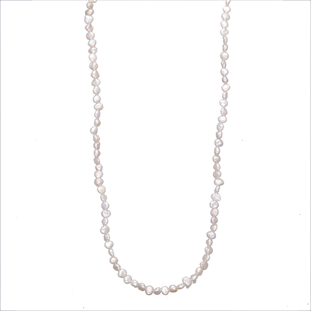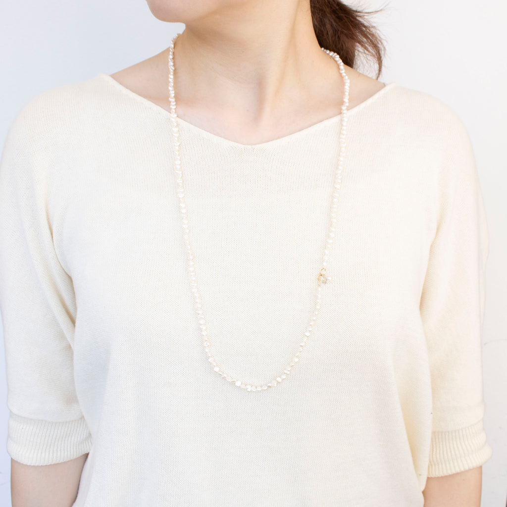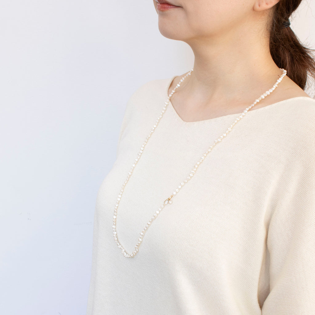 不揃いな形が個性的でナチュラルな雰囲気を楽しめる淡水パールを繋げた全長約80cmのロングネックレスです。