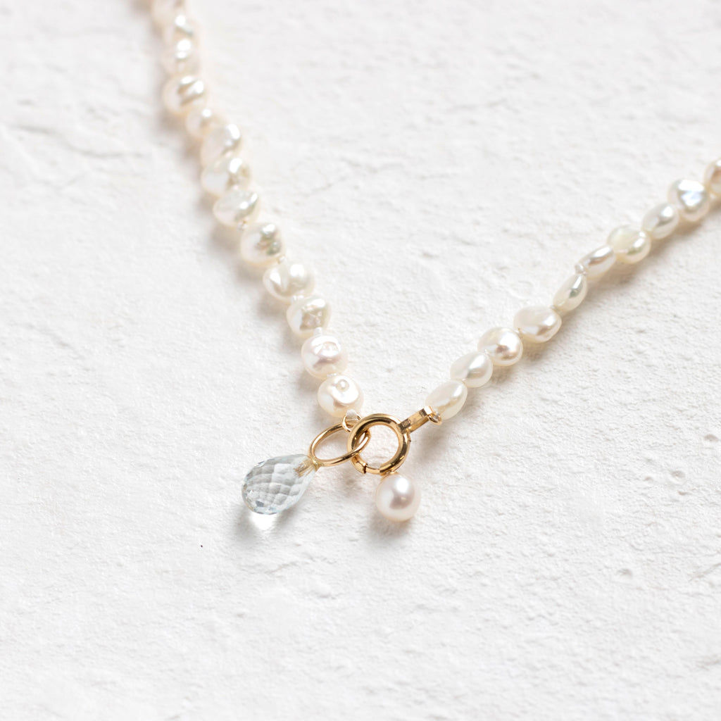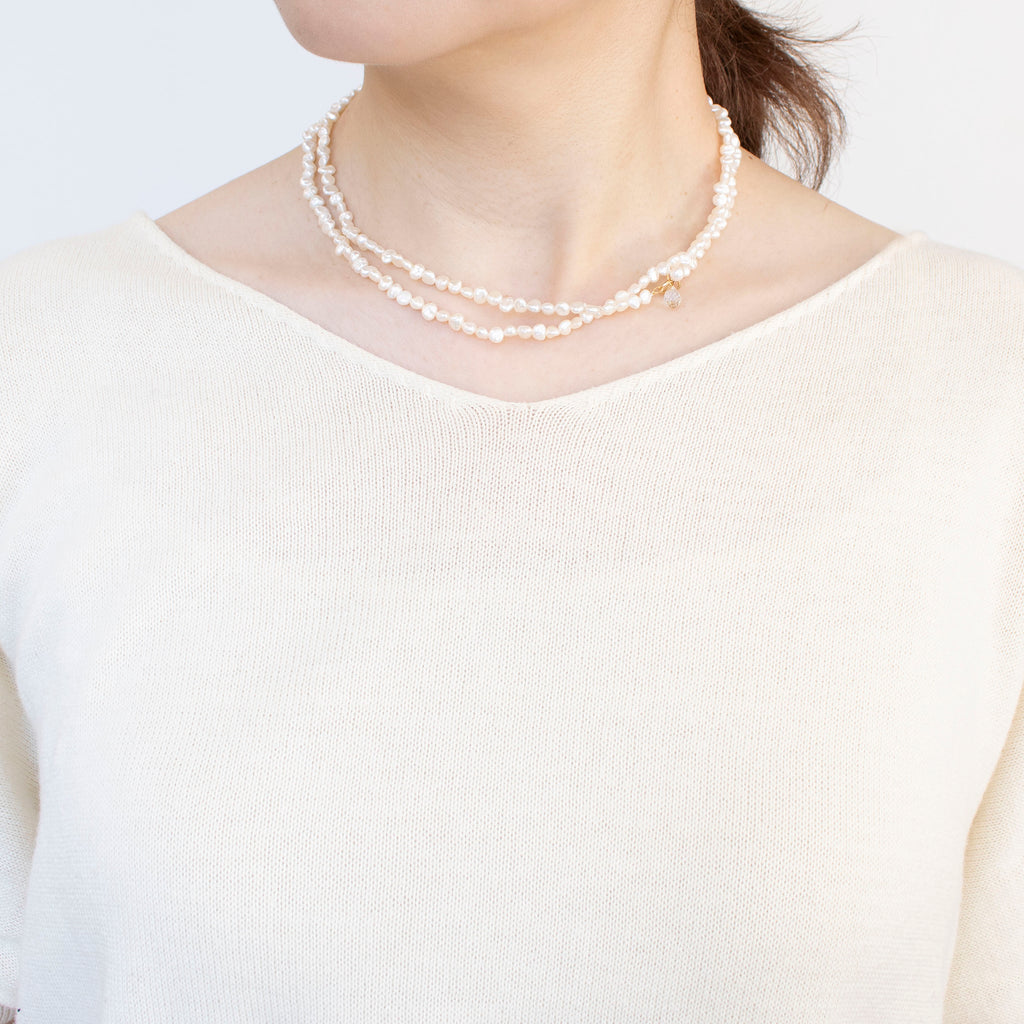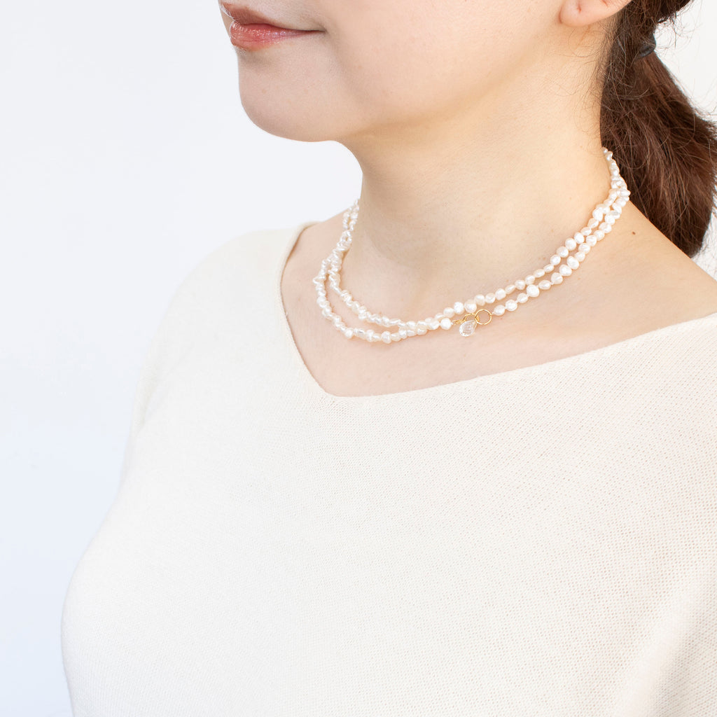 アコヤパールやホワイトトパーズを留めることによって、留め具の部分が首の後ろではなく体の前や横に来てしまっても、あまり気にならないデザインになっています。