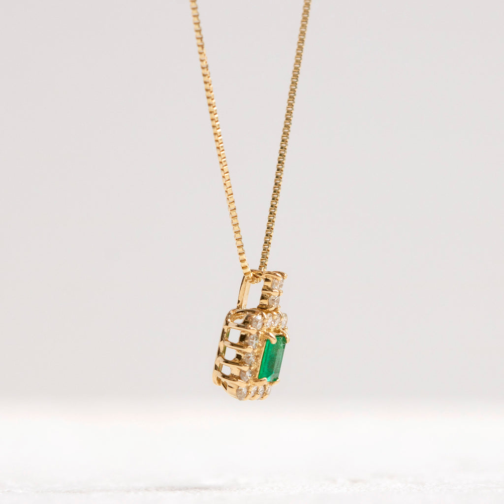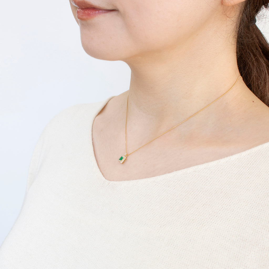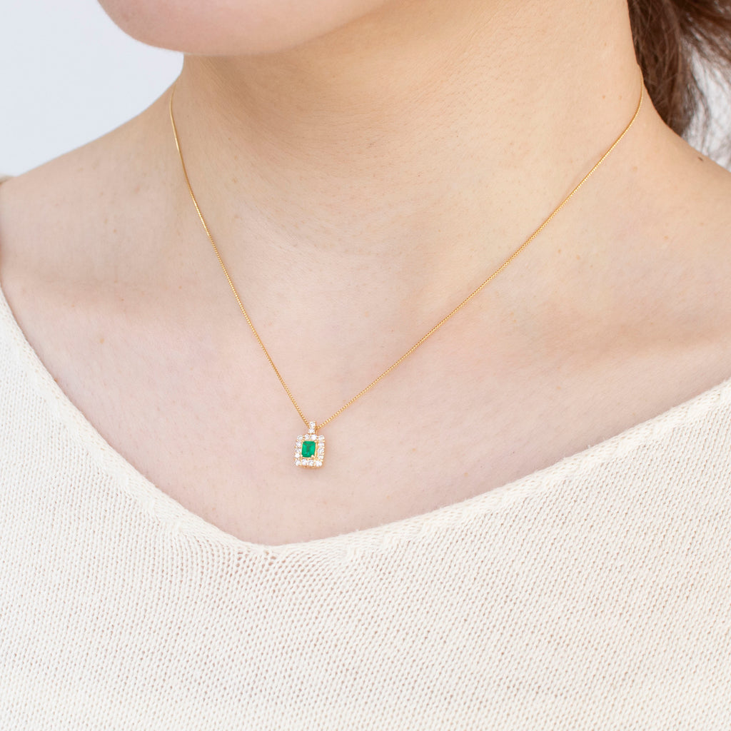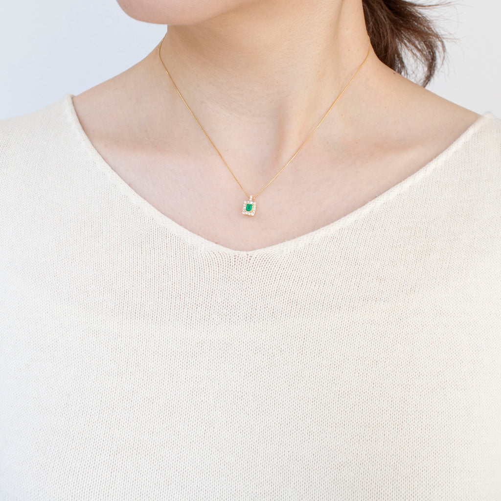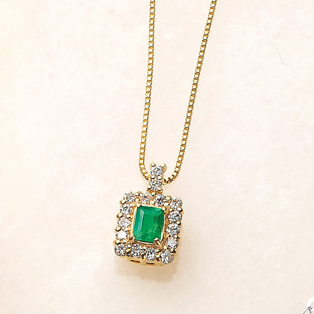 エメラルドカットを施したエメラルドをセンターに、よく輝くメレダイヤでぐるっと一周取り巻いた、定番のデザインのネックレスです。