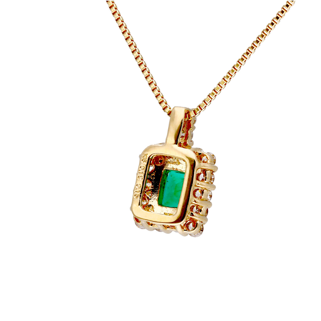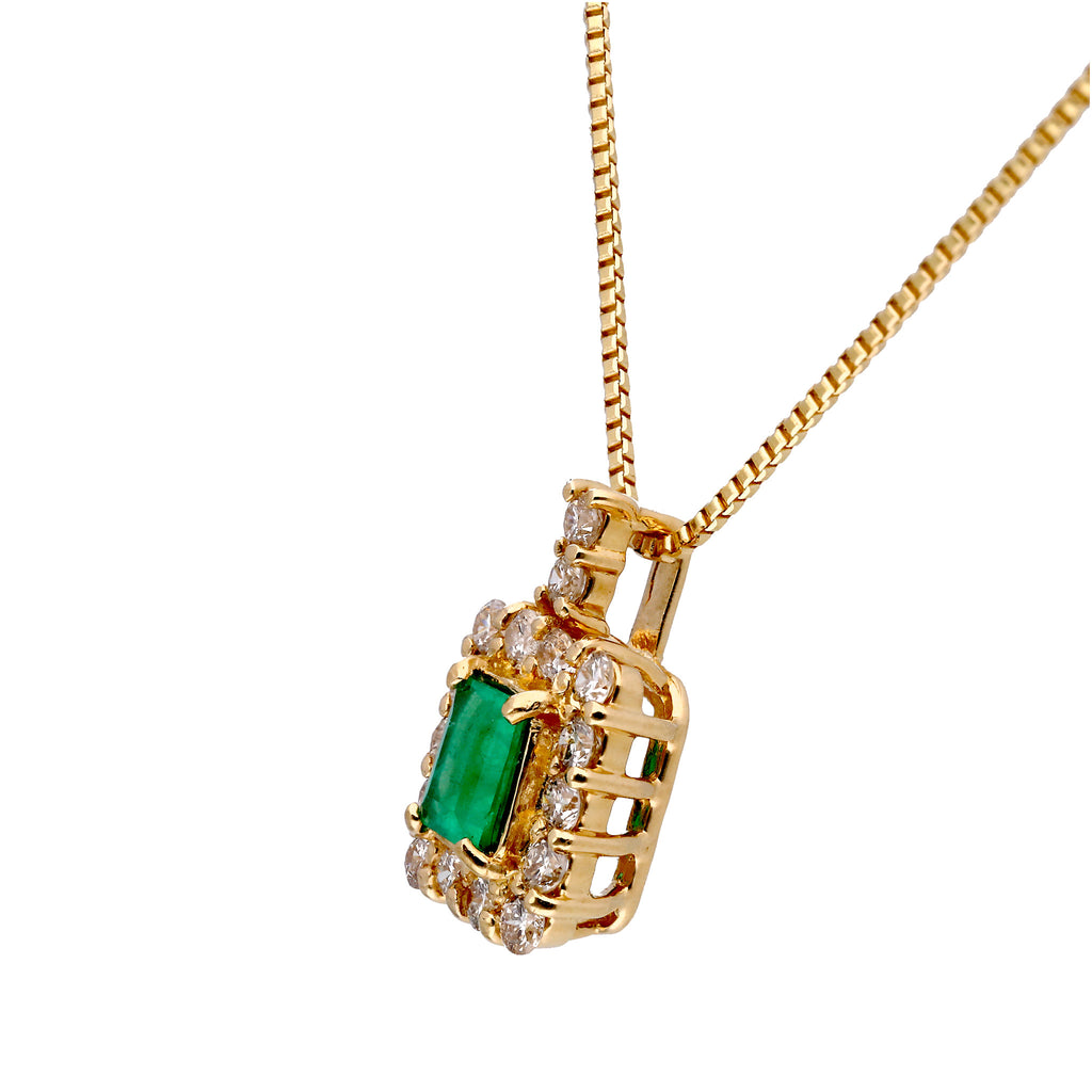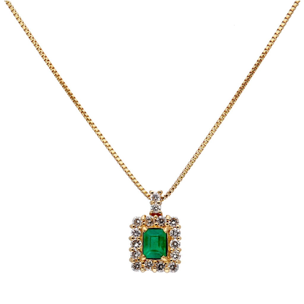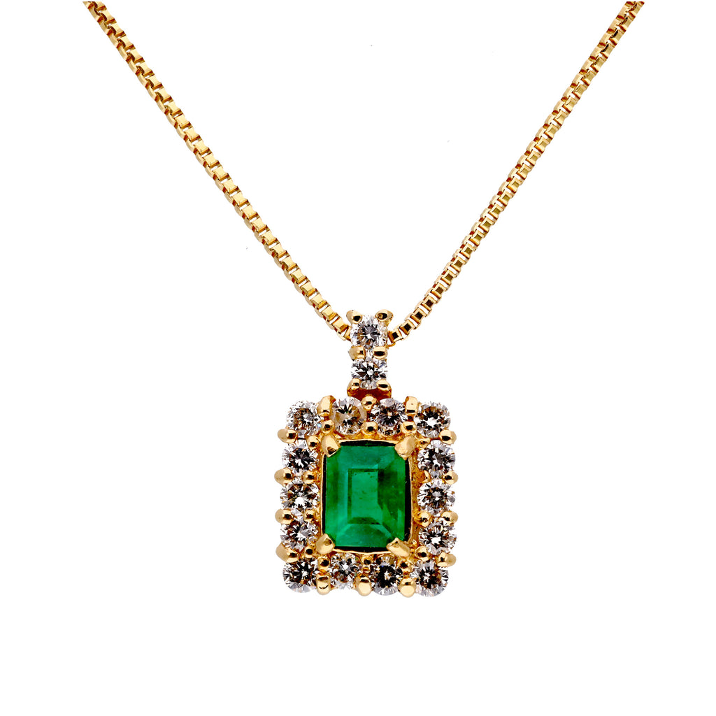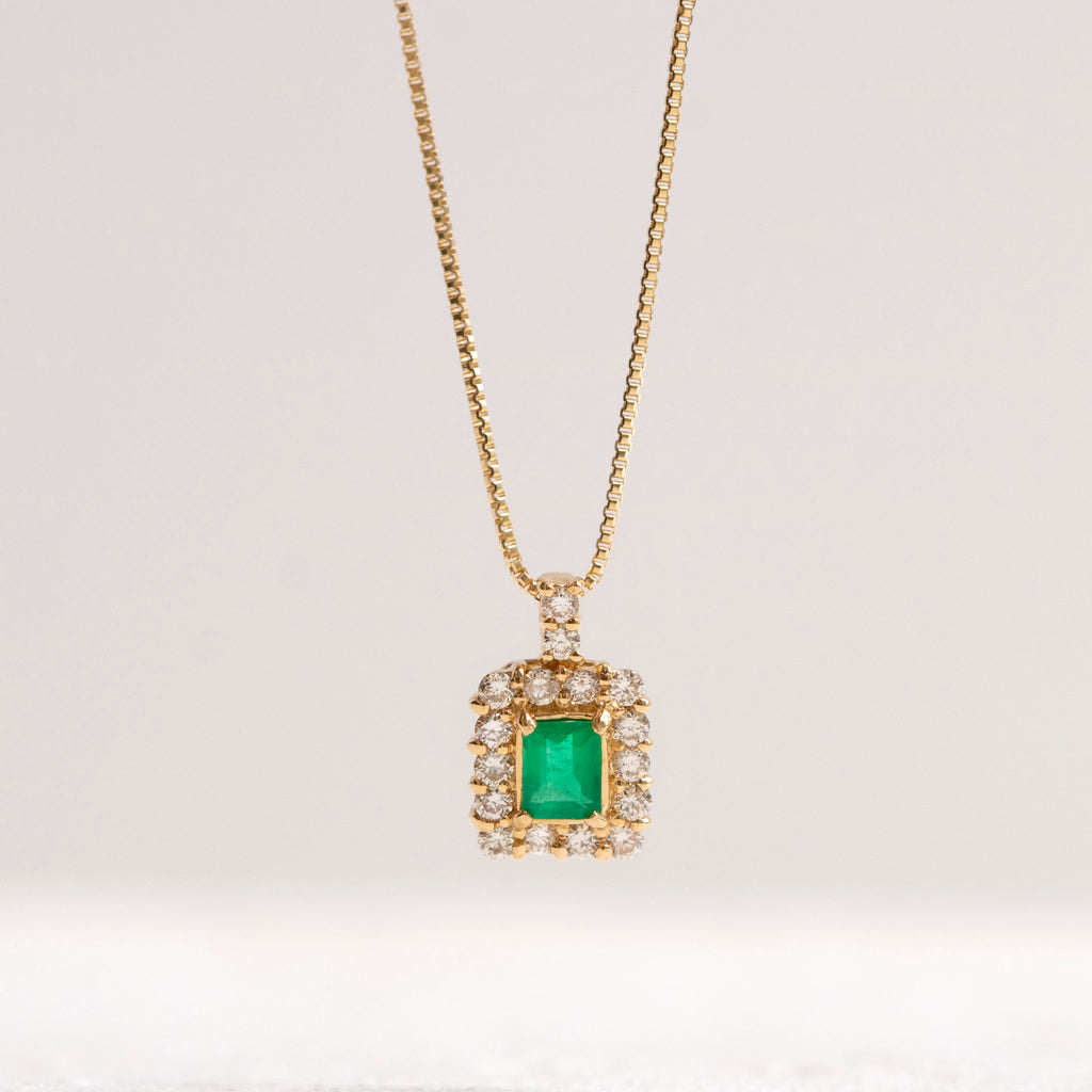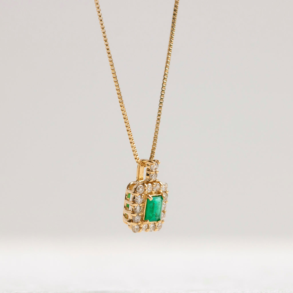 エメラルドカットを施したエメラルドをセンターに、よく輝くメレダイヤでぐるっと一周取り巻いた、定番のデザインのネックレスです。