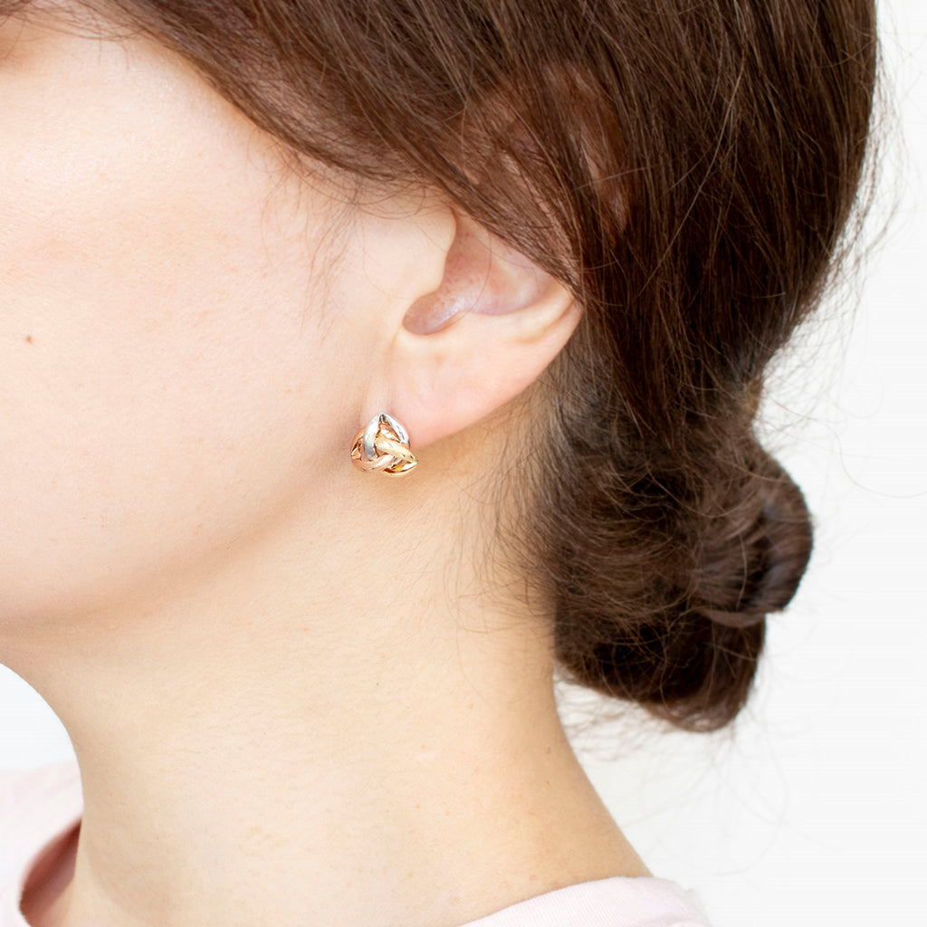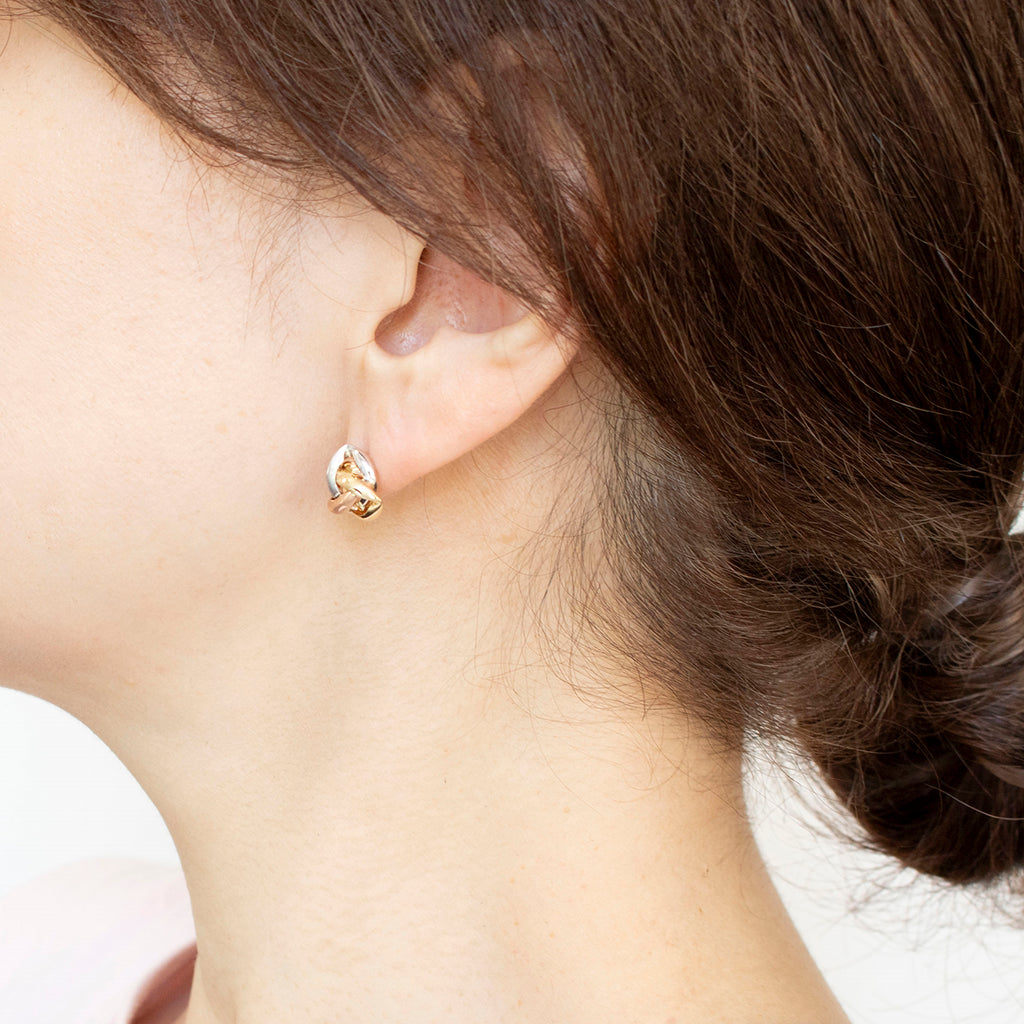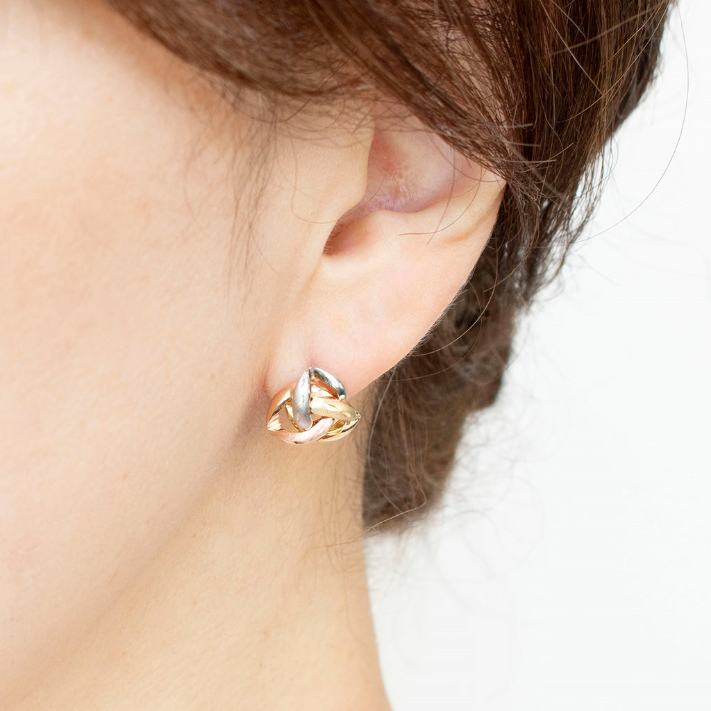 ピアス全体が18金イエローゴールド製で、ホワイトゴールドに見える部分にはロジウムメッキを、ピンクゴールドに見える部分にはピンクメッキを施して3色に見せています。