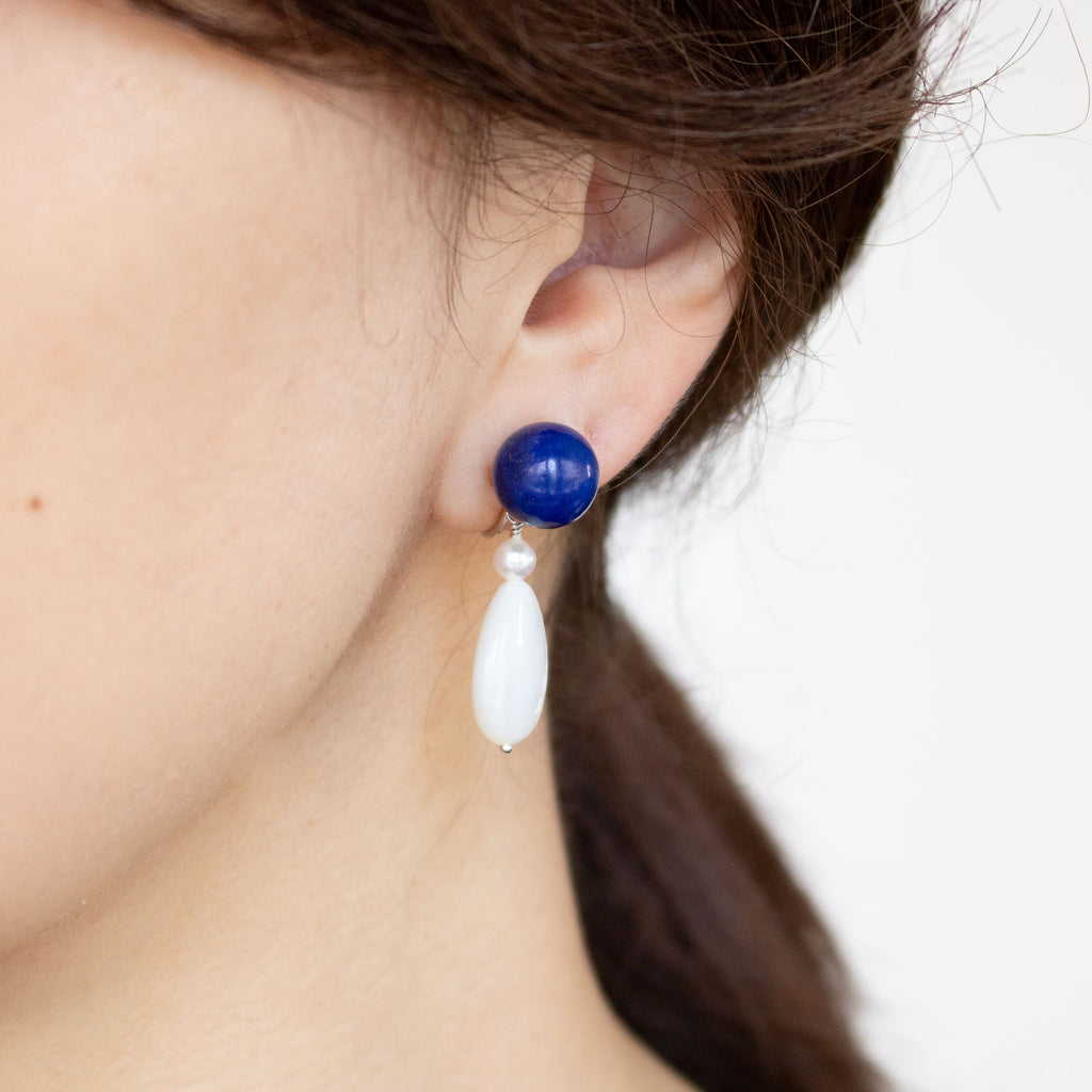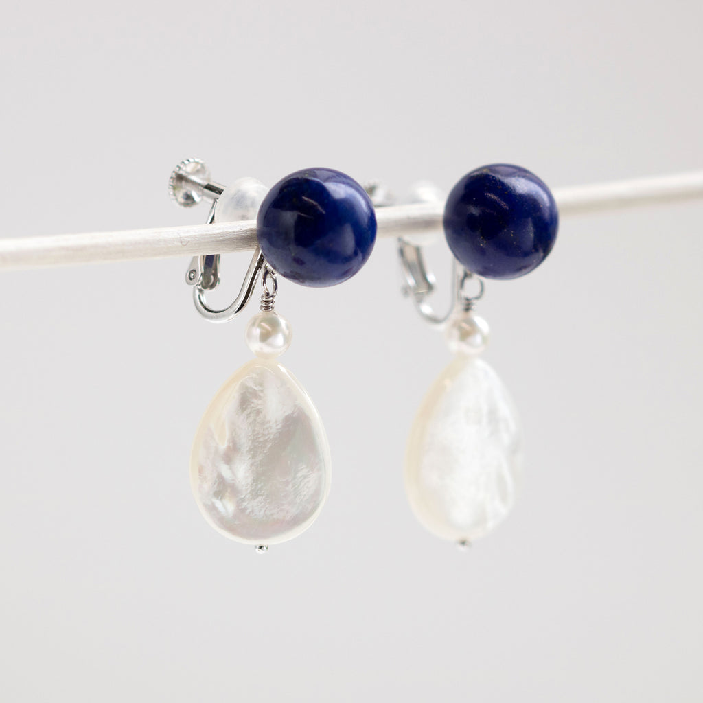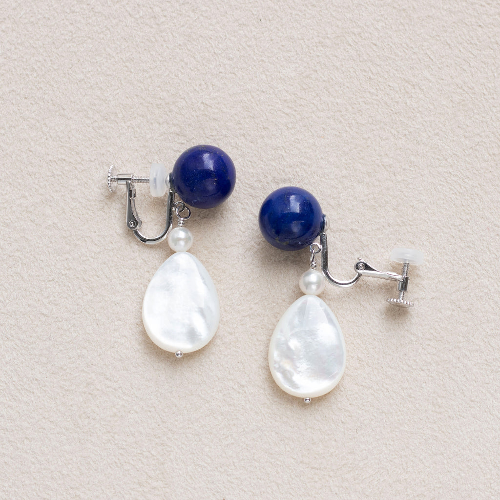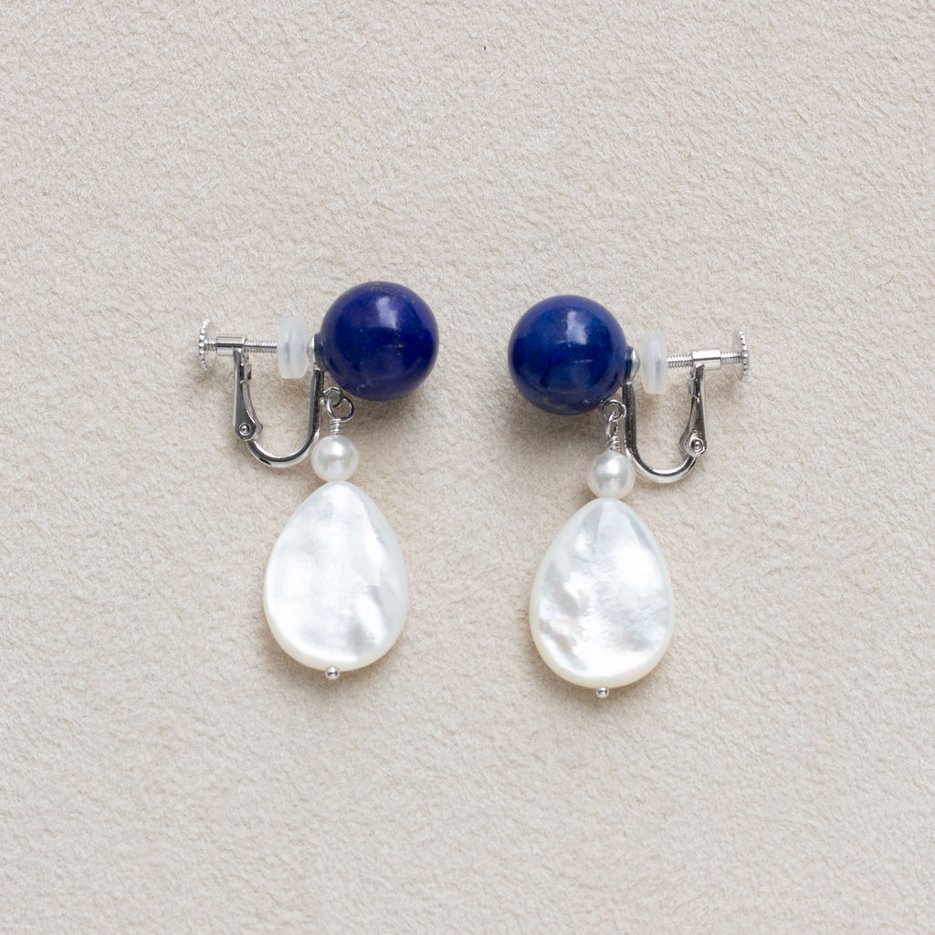 大きな直径10mmのラピスラズリの丸玉の下に、こちらも大きな雫形のシェルパーツをさげた、ボリューム感たっぷりなイヤリングです。
