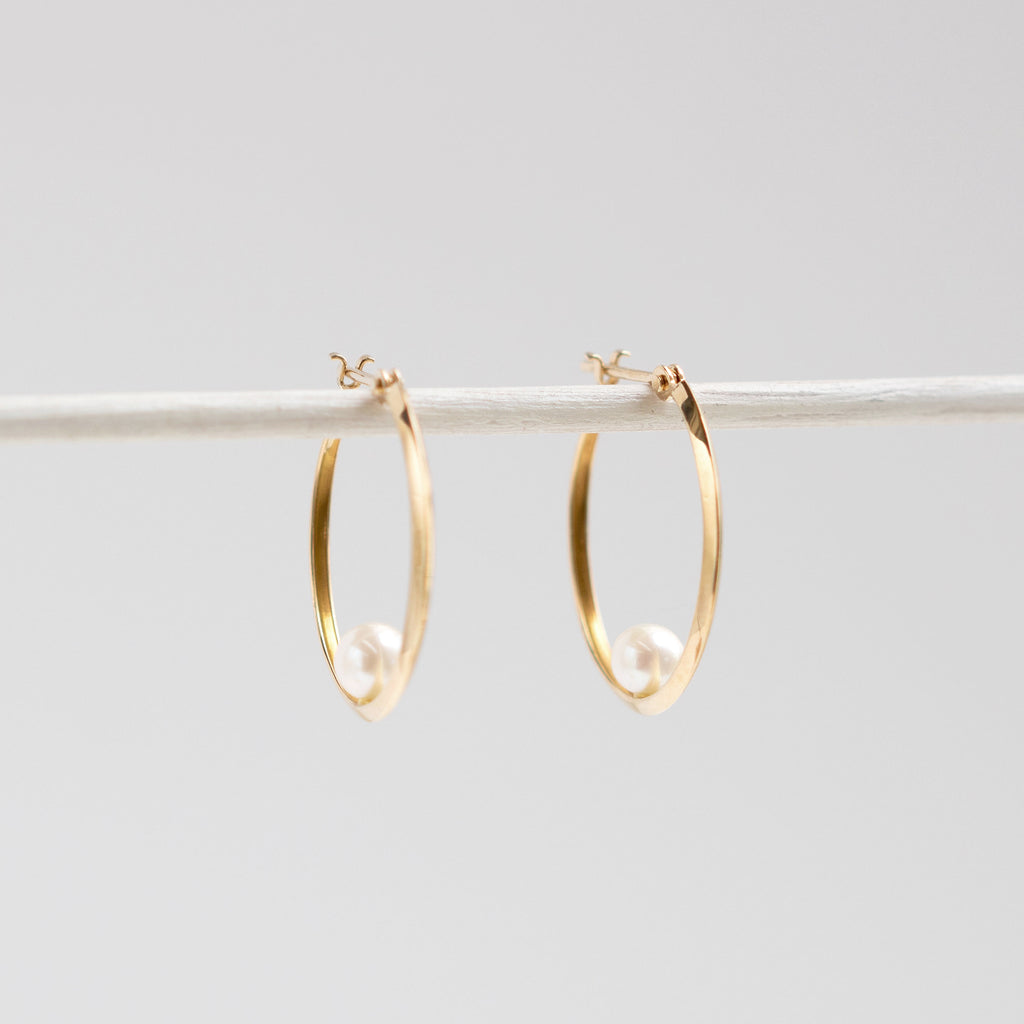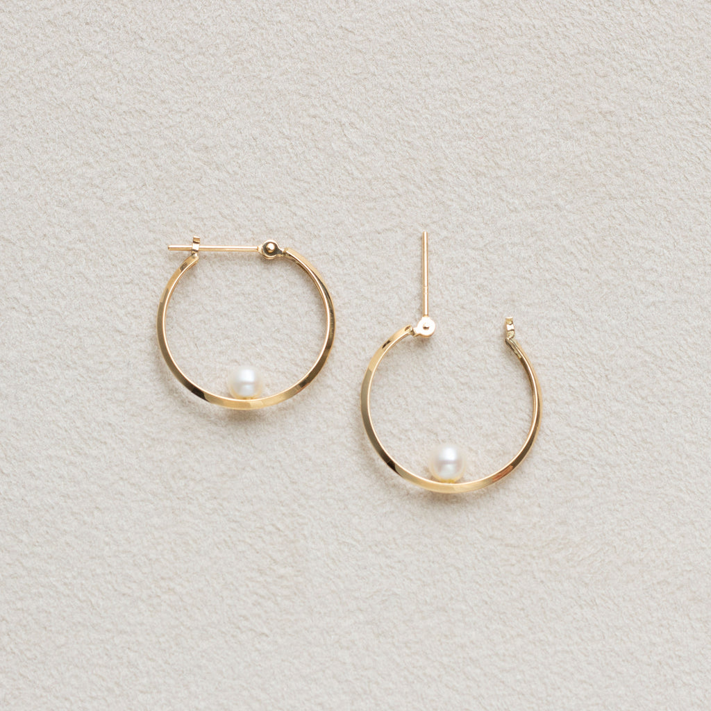 シャープな印象の角線でできたベーシックなフープタイプピアスの中央内側に、てりのよい4mmのアコヤパールをセットしました。