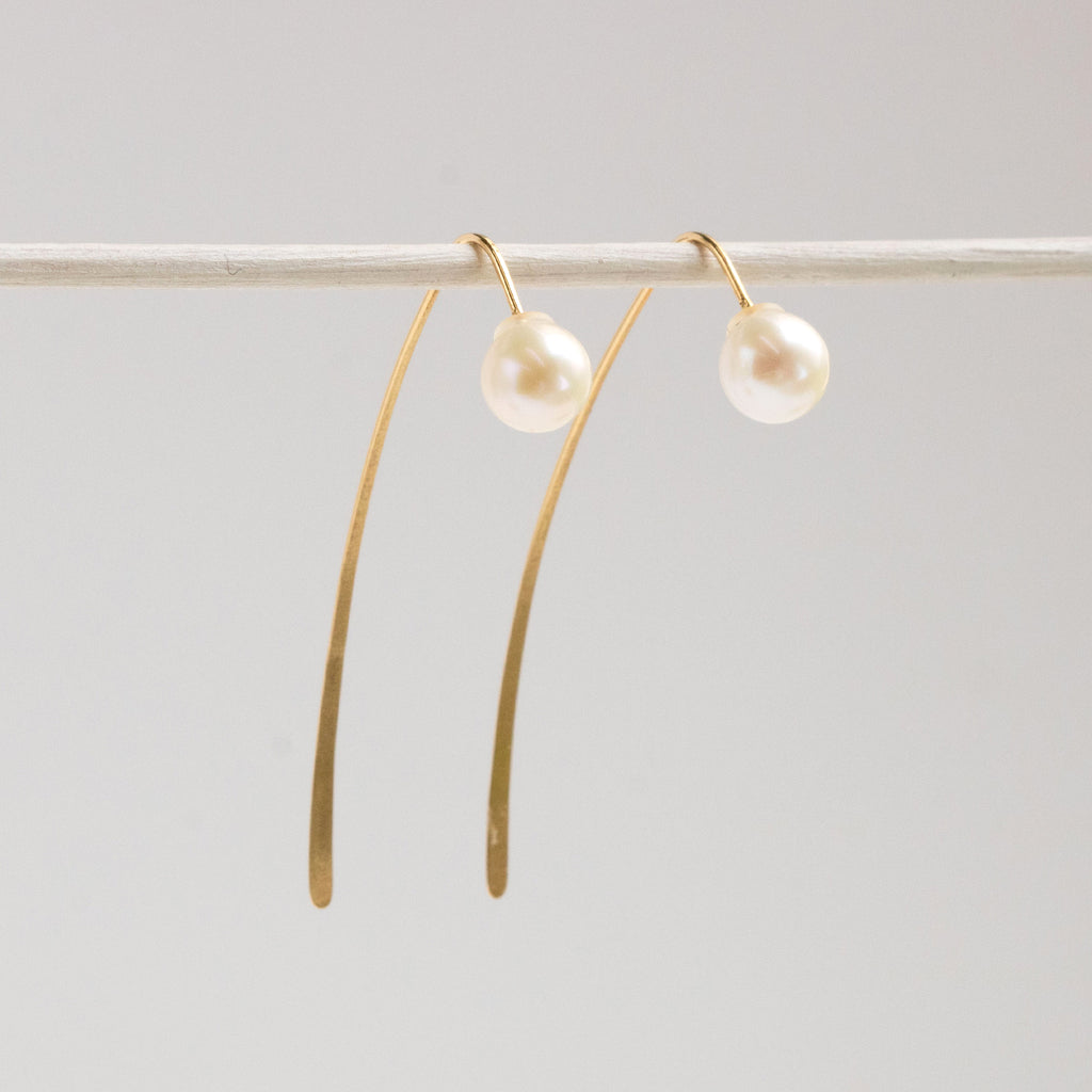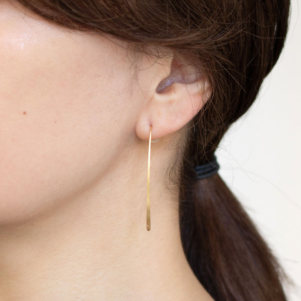 耳たぶに引っかけて装着できるようにフック状に曲げた18金のラインはグラデーションになっていて、先端に行くにつれてわずかに太くなります。