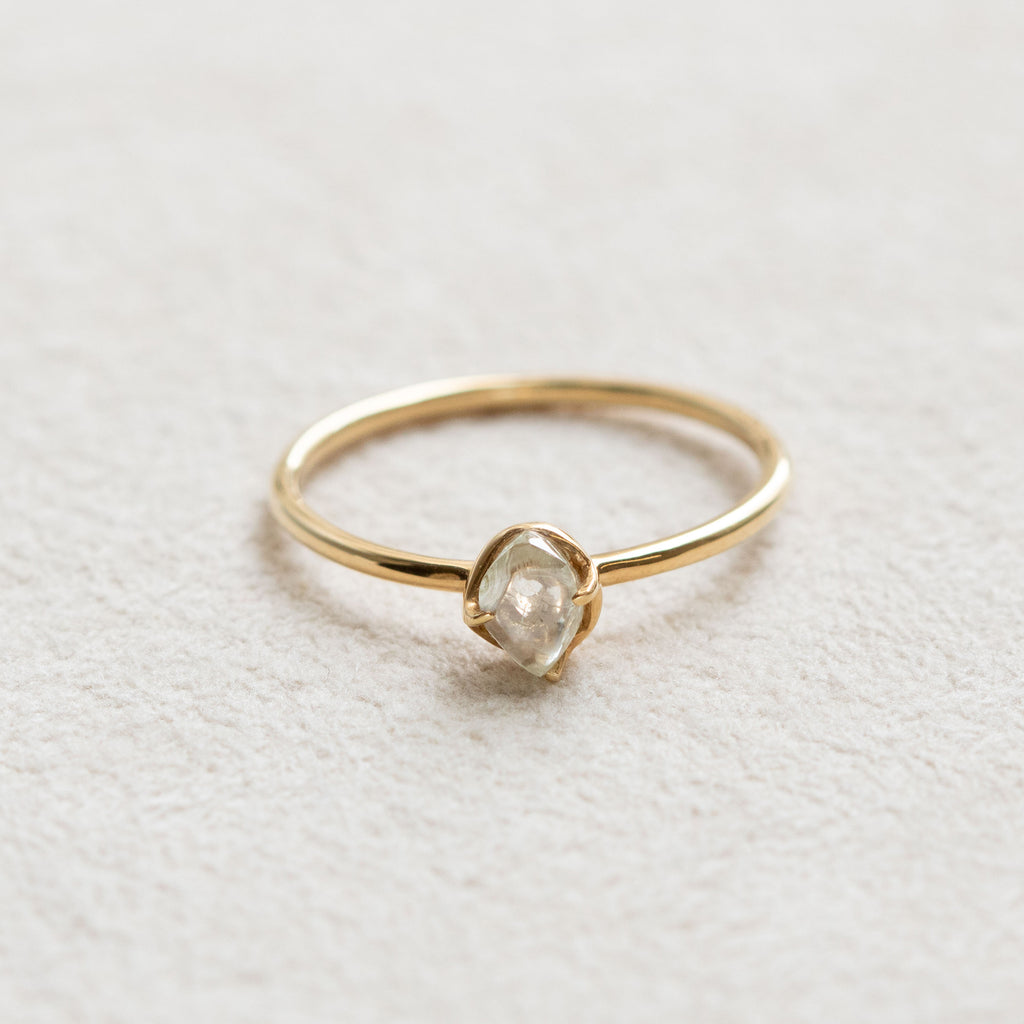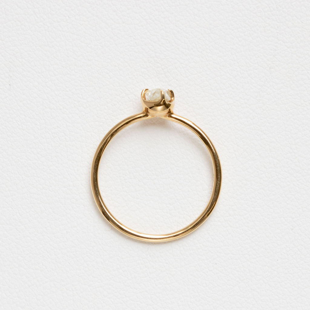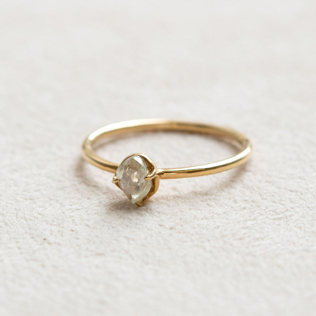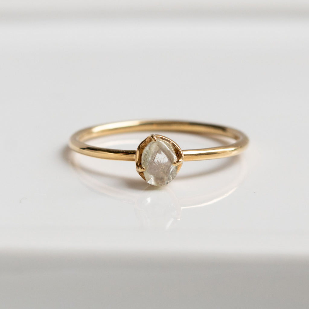 このリングに使われているのは通常目にすることのない未加工のダイヤの原石です。やや黄色がかった色で、透明感があり、あまり尖った角はなく、丸みを帯びた形です。