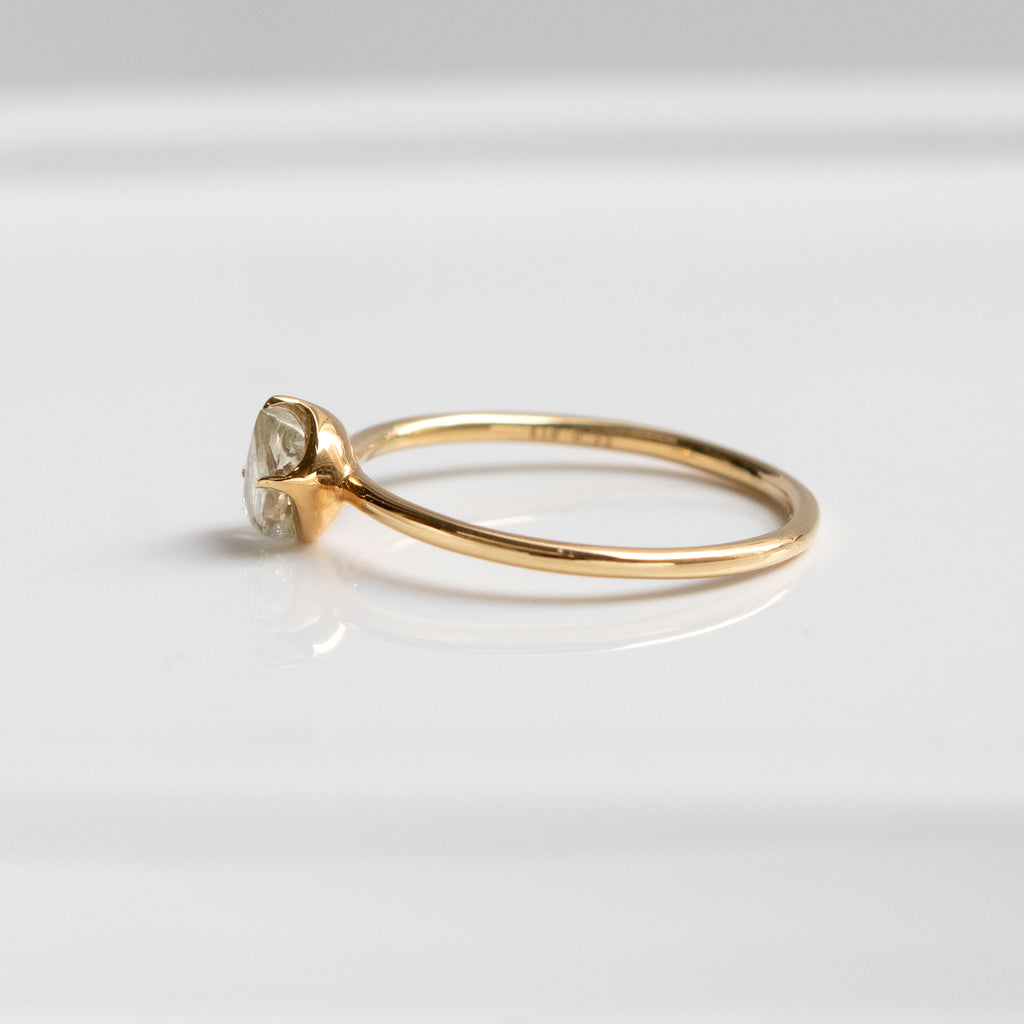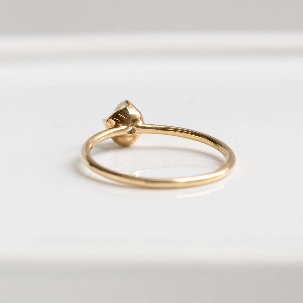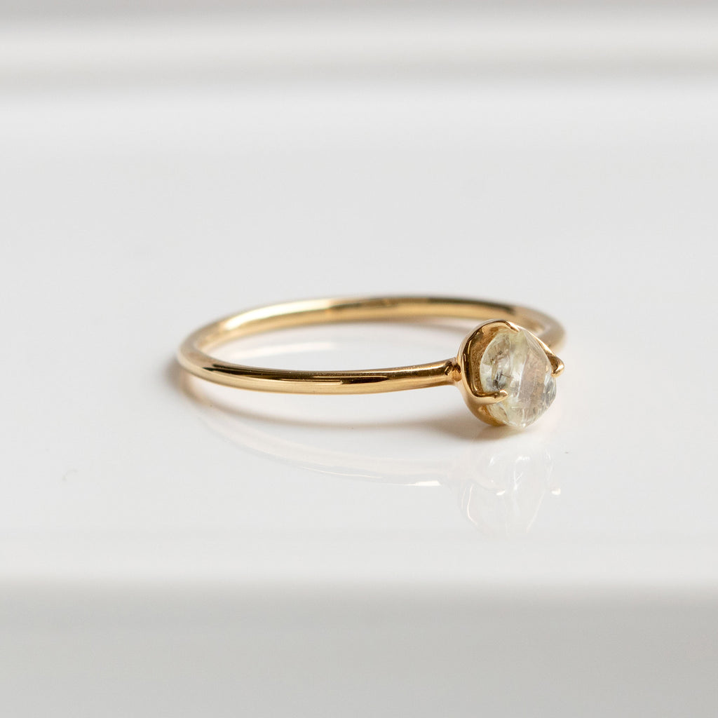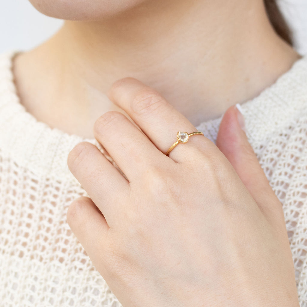 このリングに使われているのは通常目にすることのない未加工のダイヤの原石です。やや黄色がかった色で、透明感があり、あまり尖った角はなく、丸みを帯びた形です。