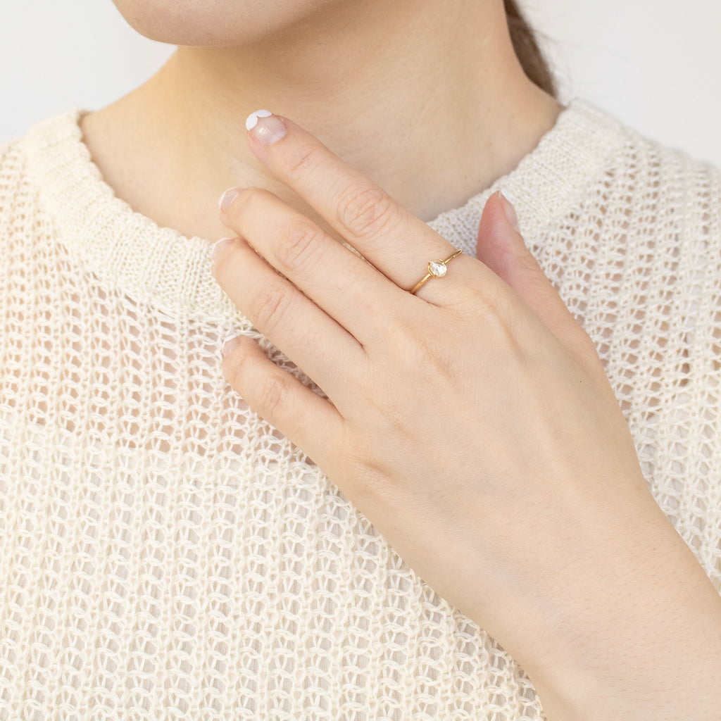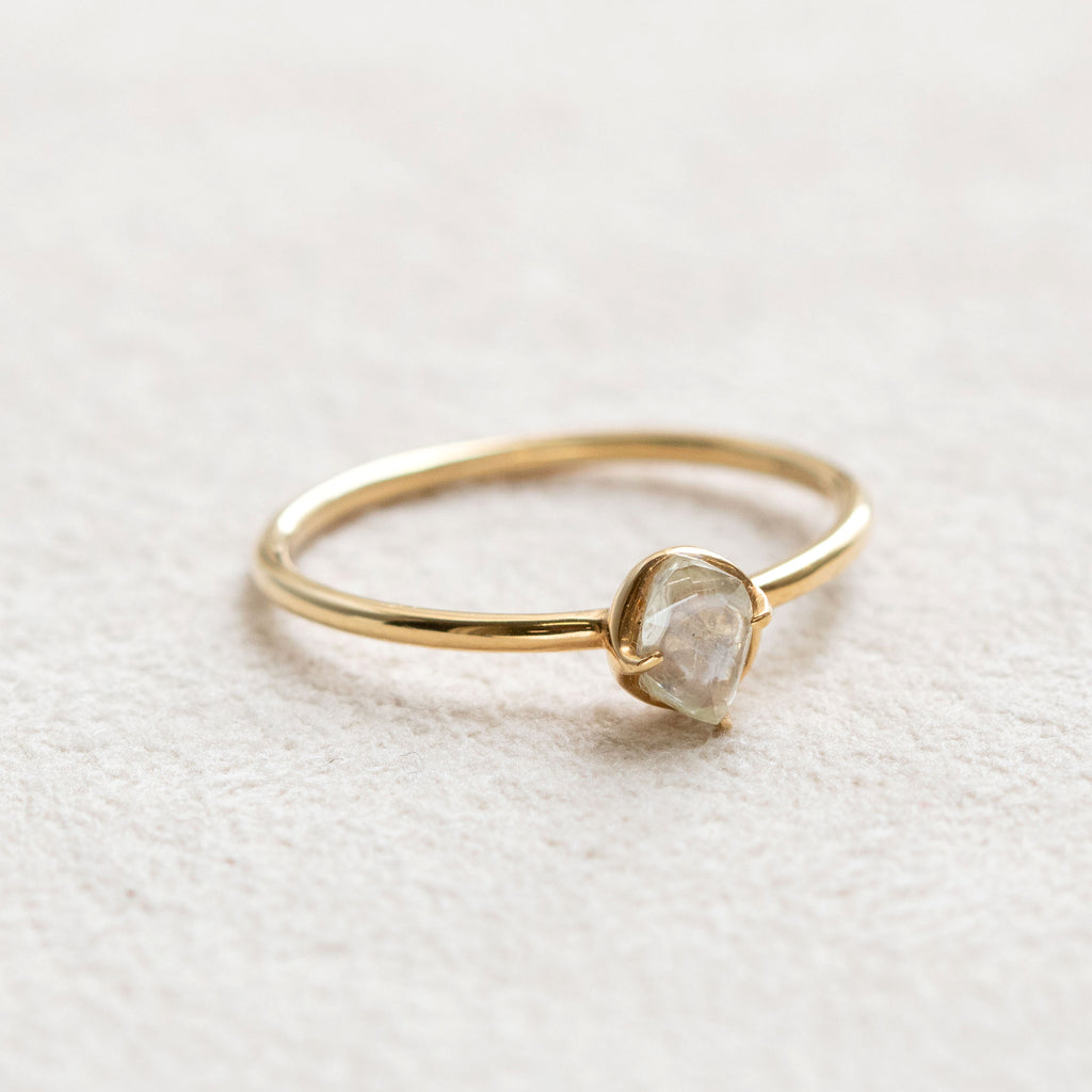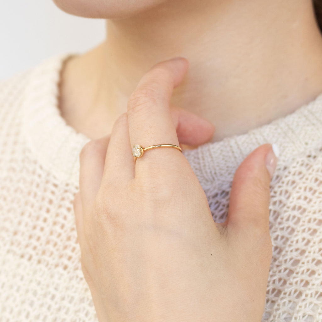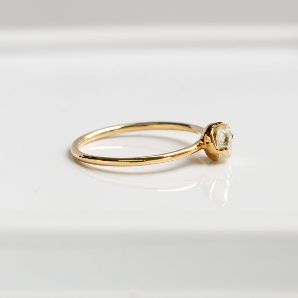 このリングに使われているのは通常目にすることのない未加工のダイヤの原石です。やや黄色がかった色で、透明感があり、あまり尖った角はなく、丸みを帯びた形です。
