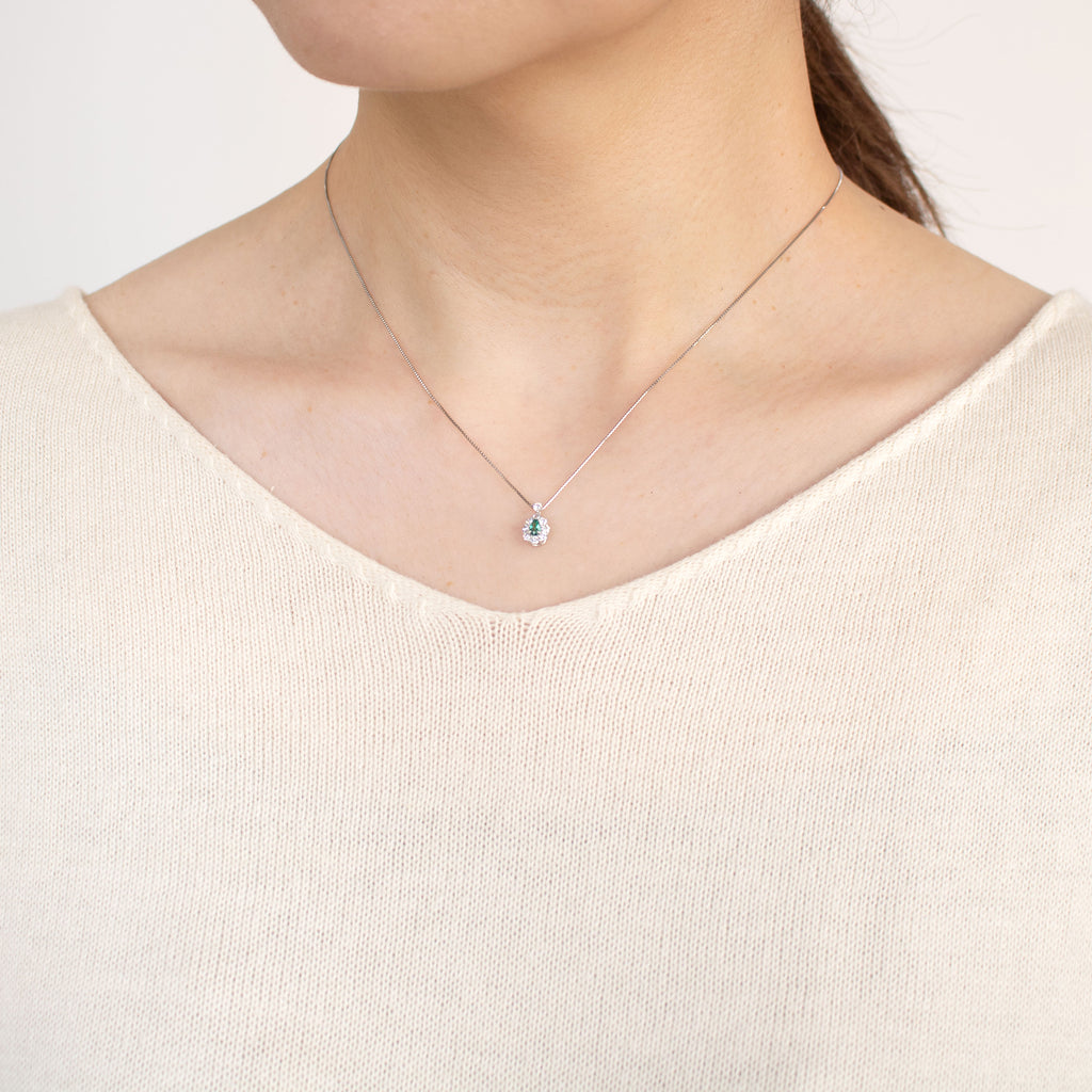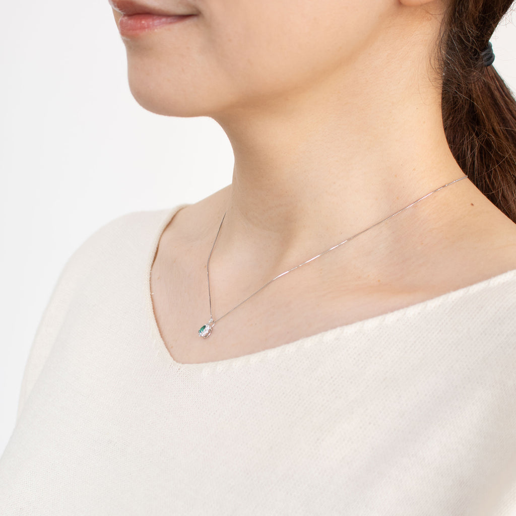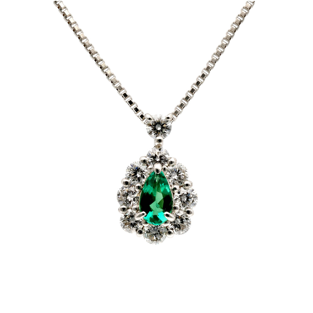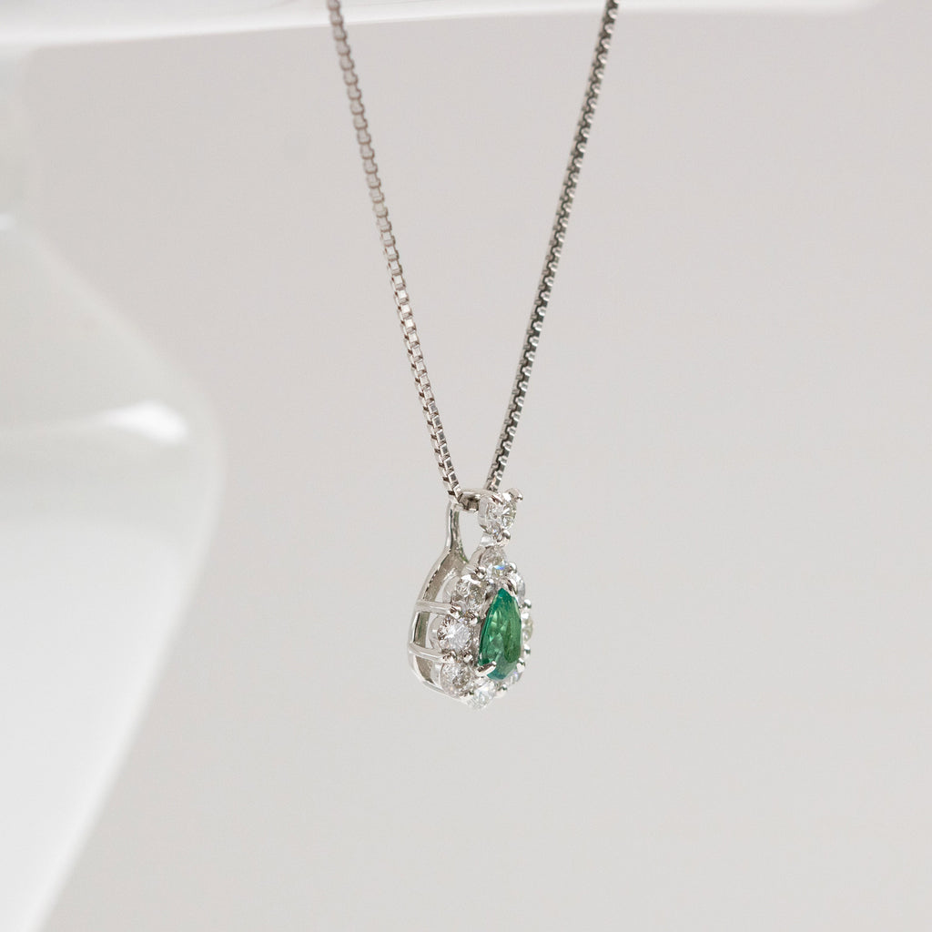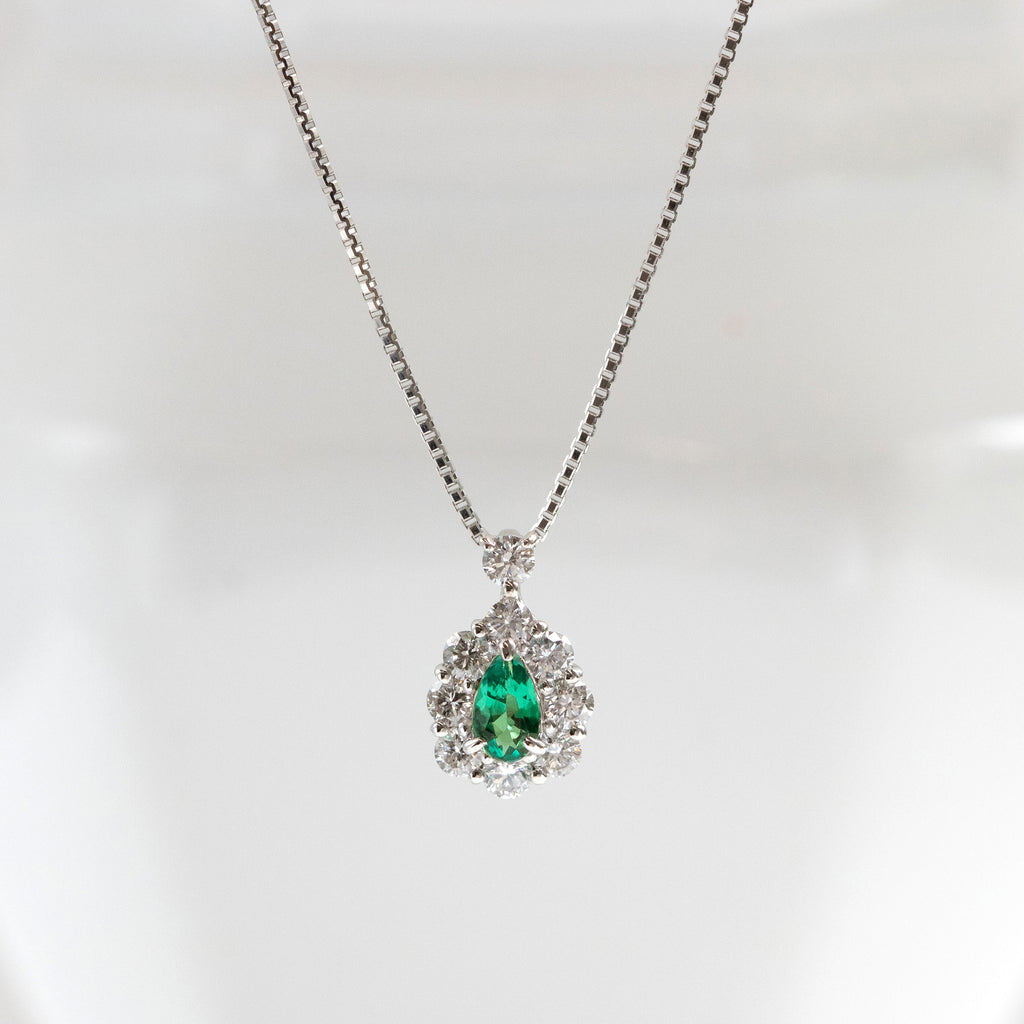 ペアシェイプに整えたグリーンアウイナイトをメレダイヤでぐるりと取り巻いたネックレスです。