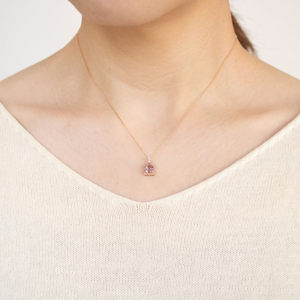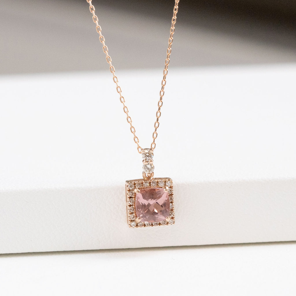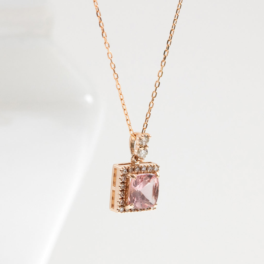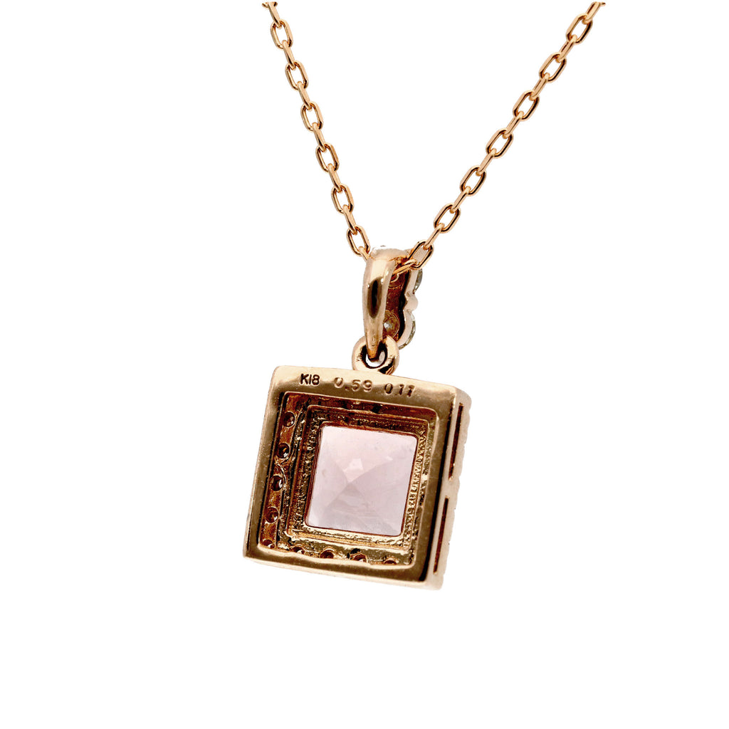 このピンク色によく合う18金ピンクゴールド製の枠にセットして、キラキラと輝くメレダイヤでぐるりと取り巻いた適度に華やかな印象のデザインです。