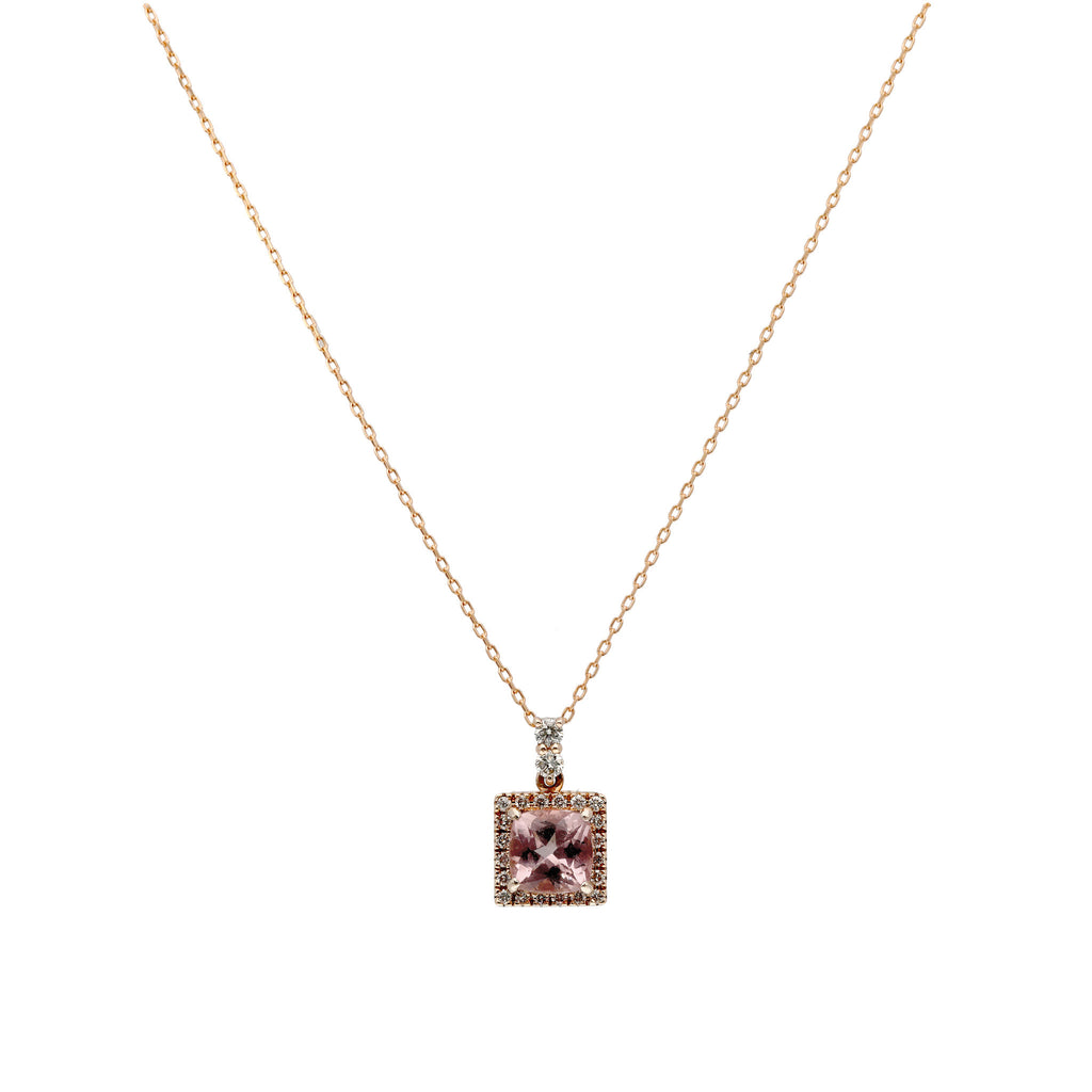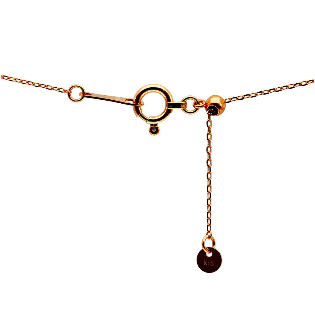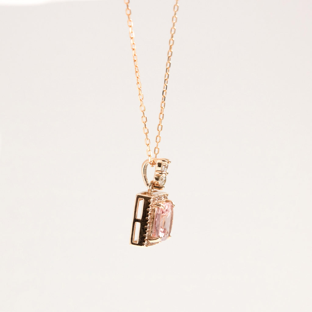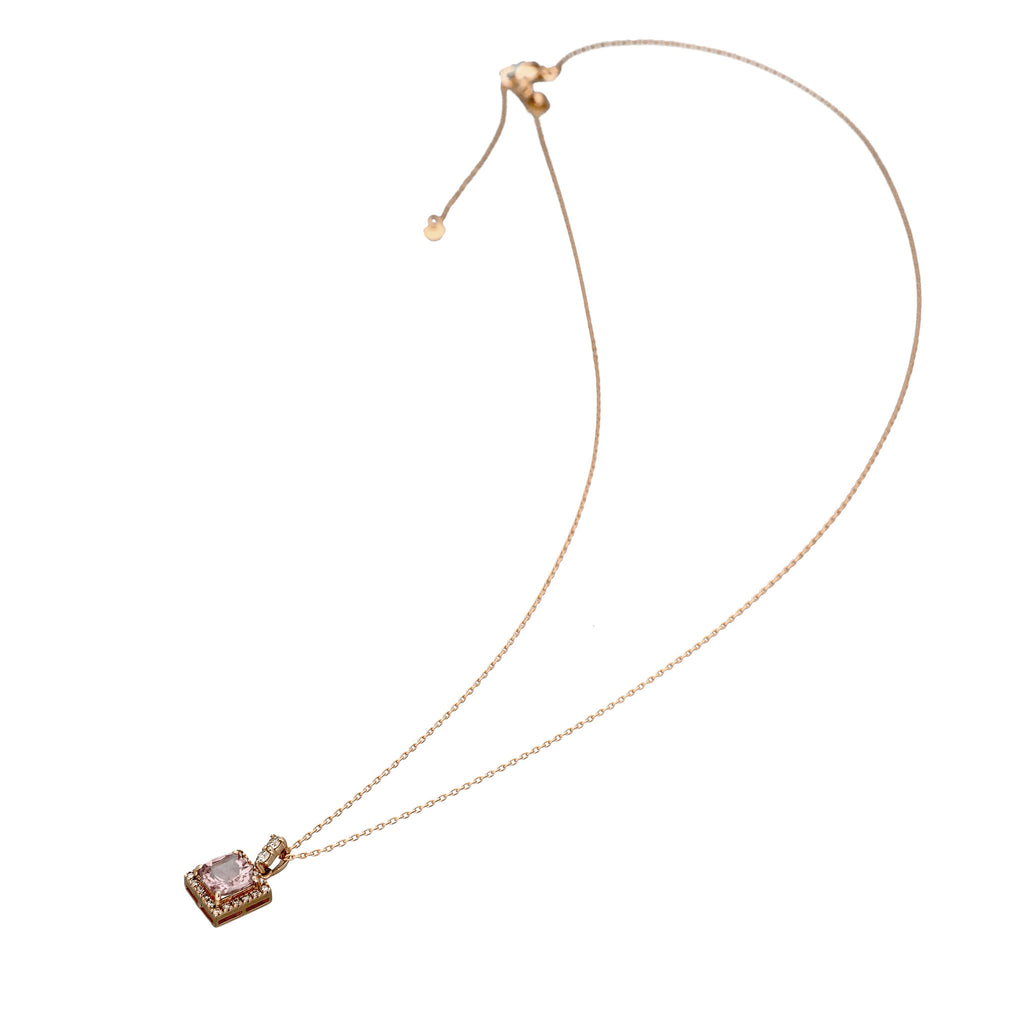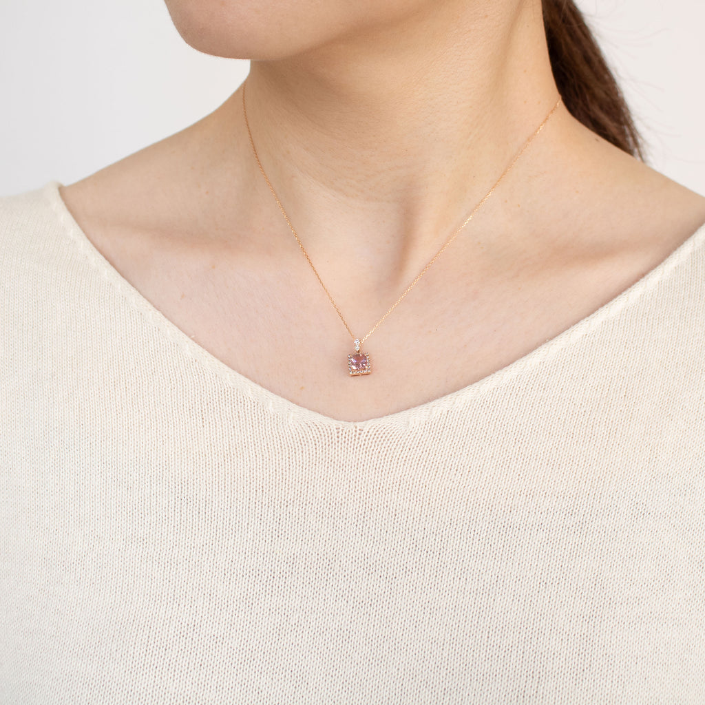 このピンク色によく合う18金ピンクゴールド製の枠にセットして、キラキラと輝くメレダイヤでぐるりと取り巻いた適度に華やかな印象のデザインです。